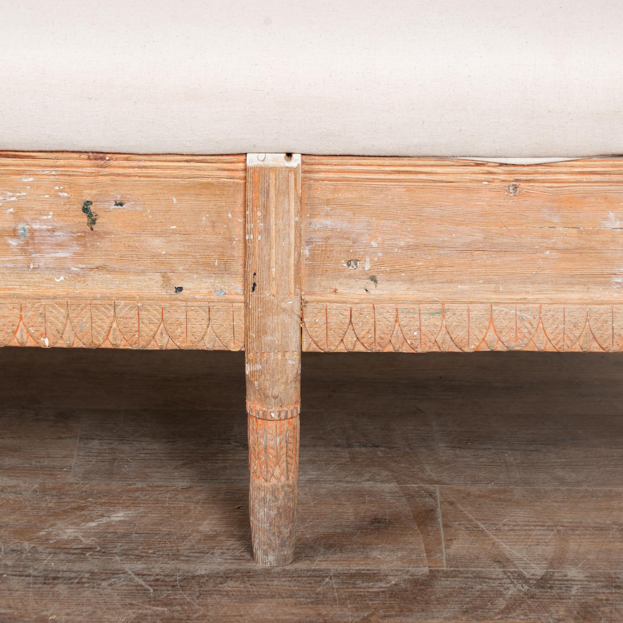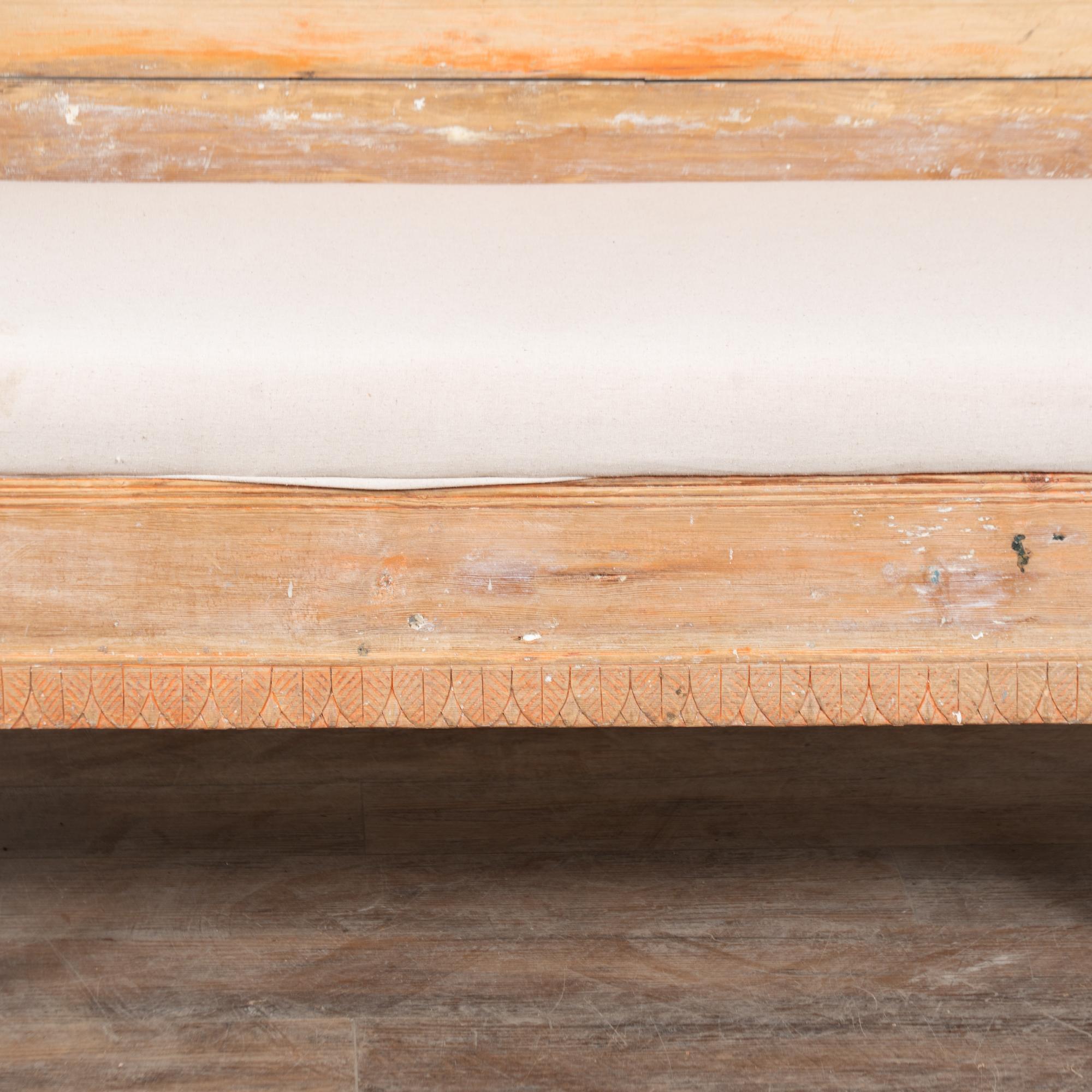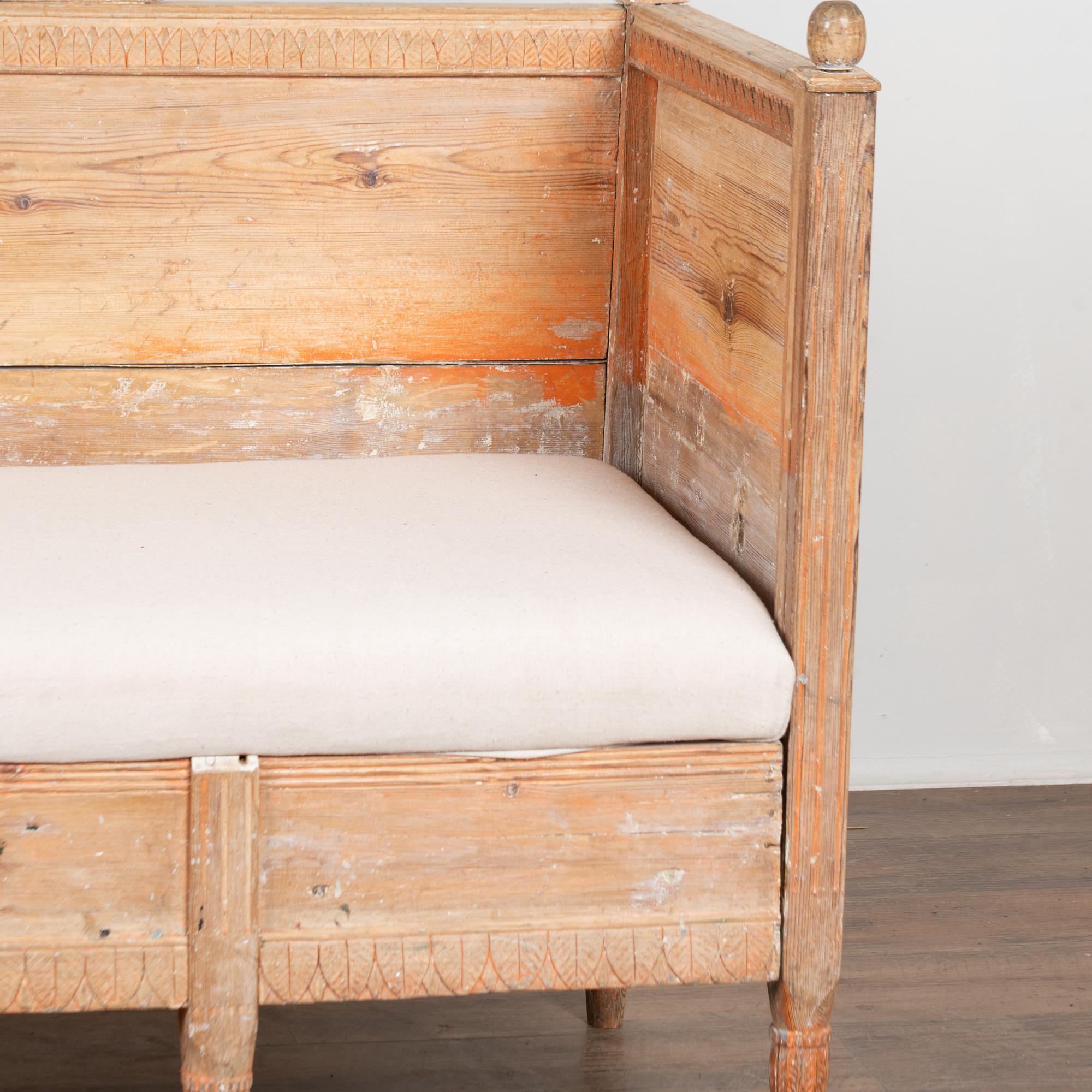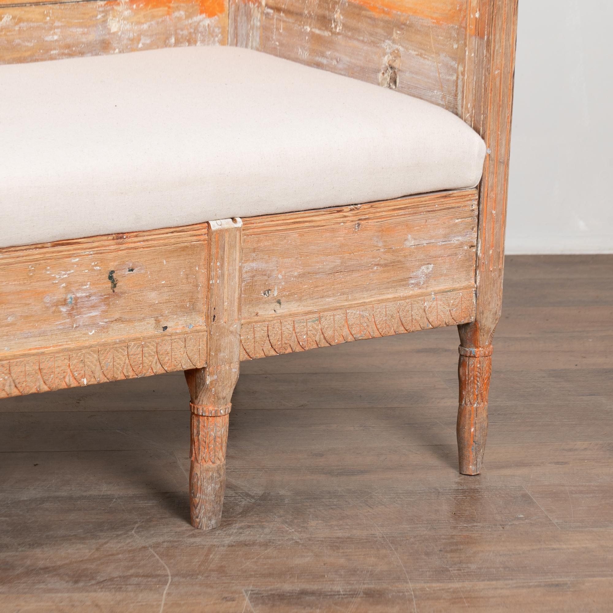 Early 19th-century Swedish Gustavian bench crafted in pine, retaining remnants of its original painted surface with a scraped, Peach-orange appearance. The worn finish reveals the warm natural pine beneath, contributing to the aged character of the piece.