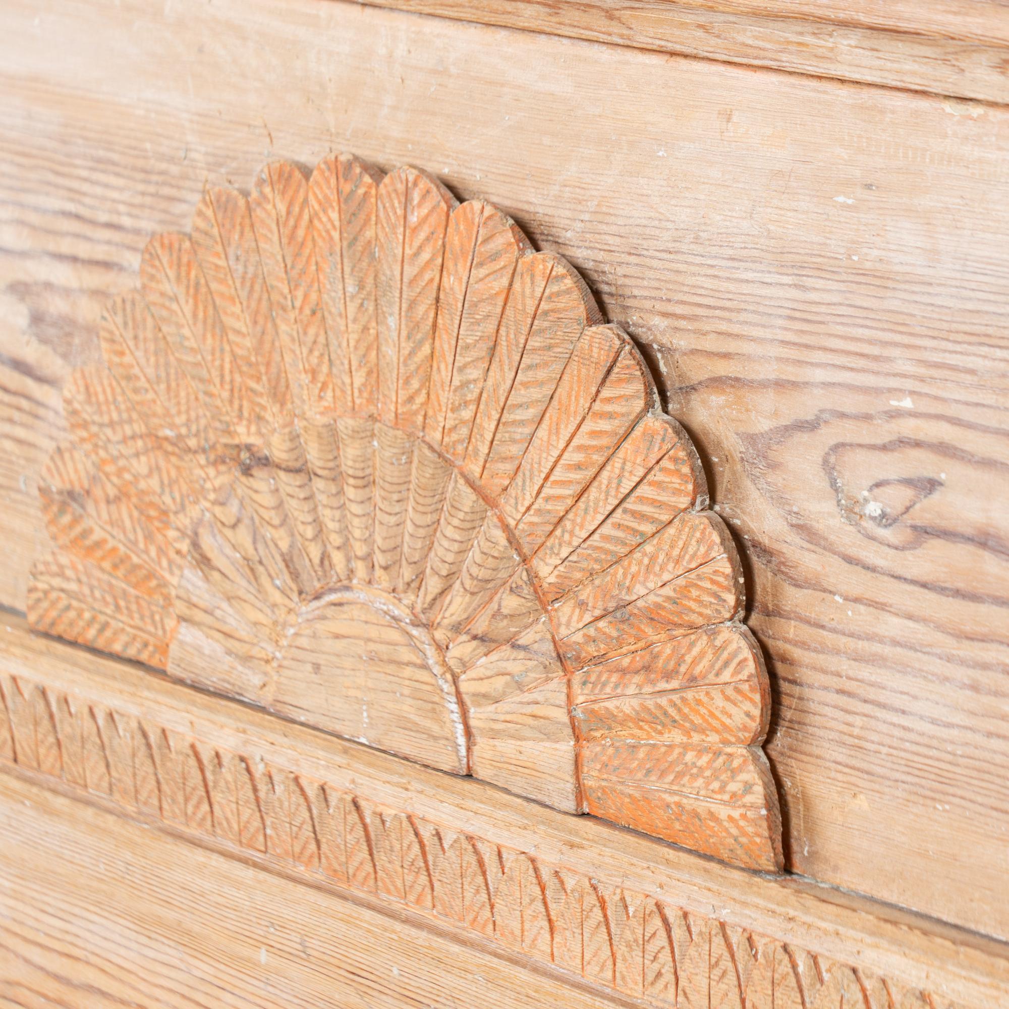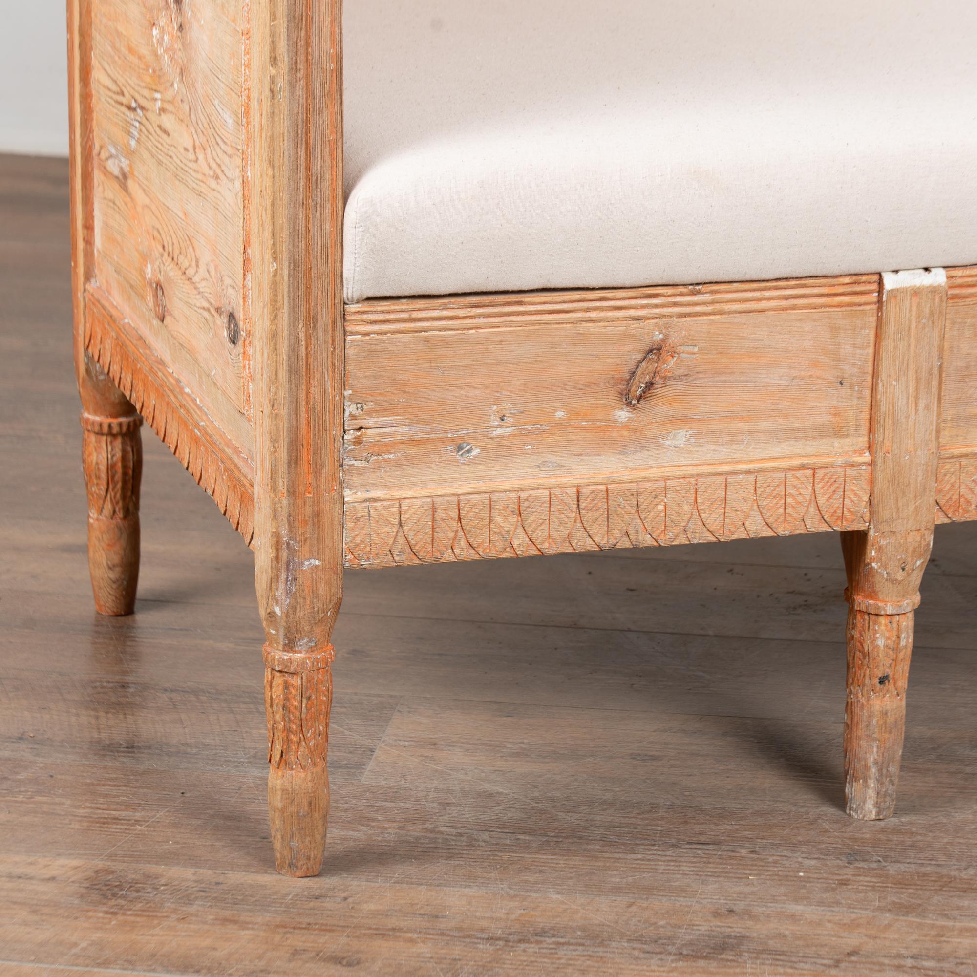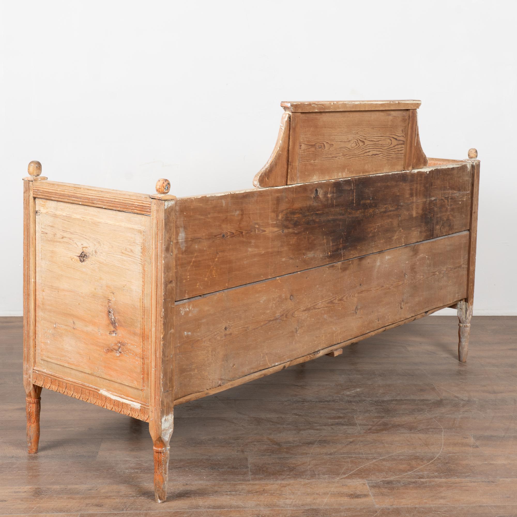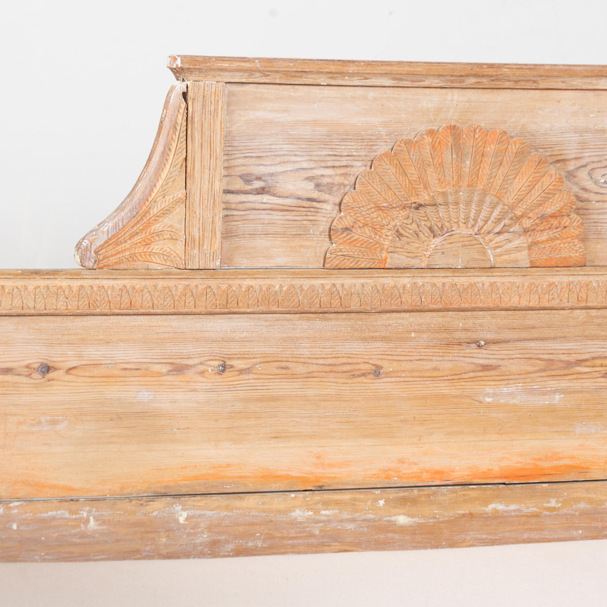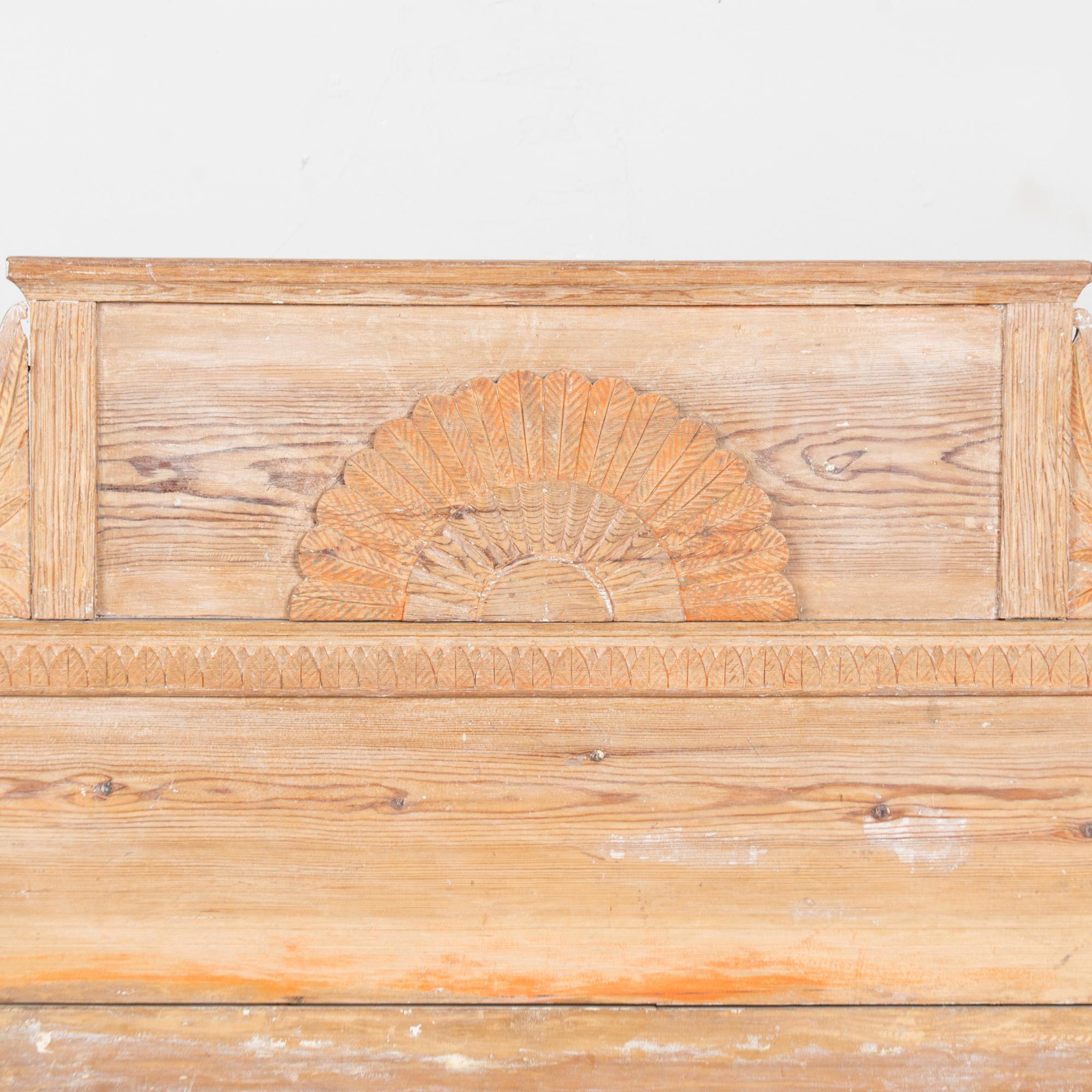 Early 19th-century Swedish Gustavian bench crafted in pine, retaining remnants of its original painted surface with a scraped, Peach-orange appearance. The worn finish reveals the warm natural pine beneath, contributing to the aged character of the piece.