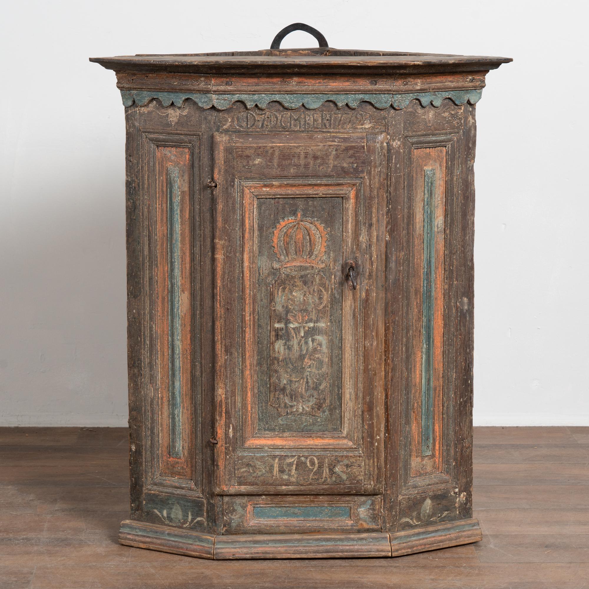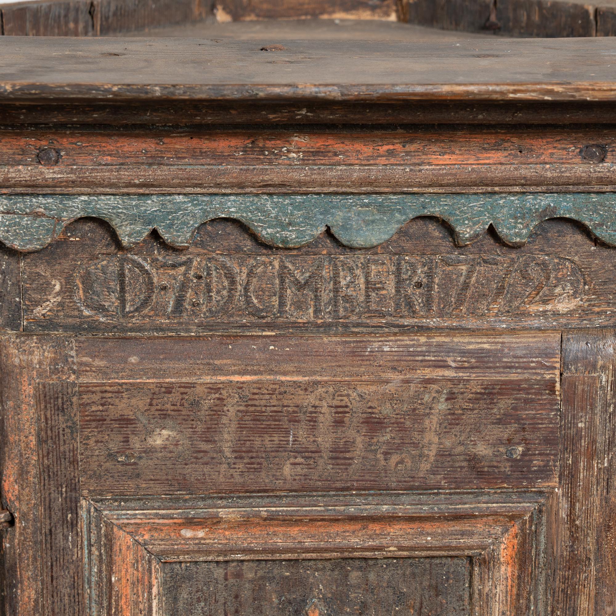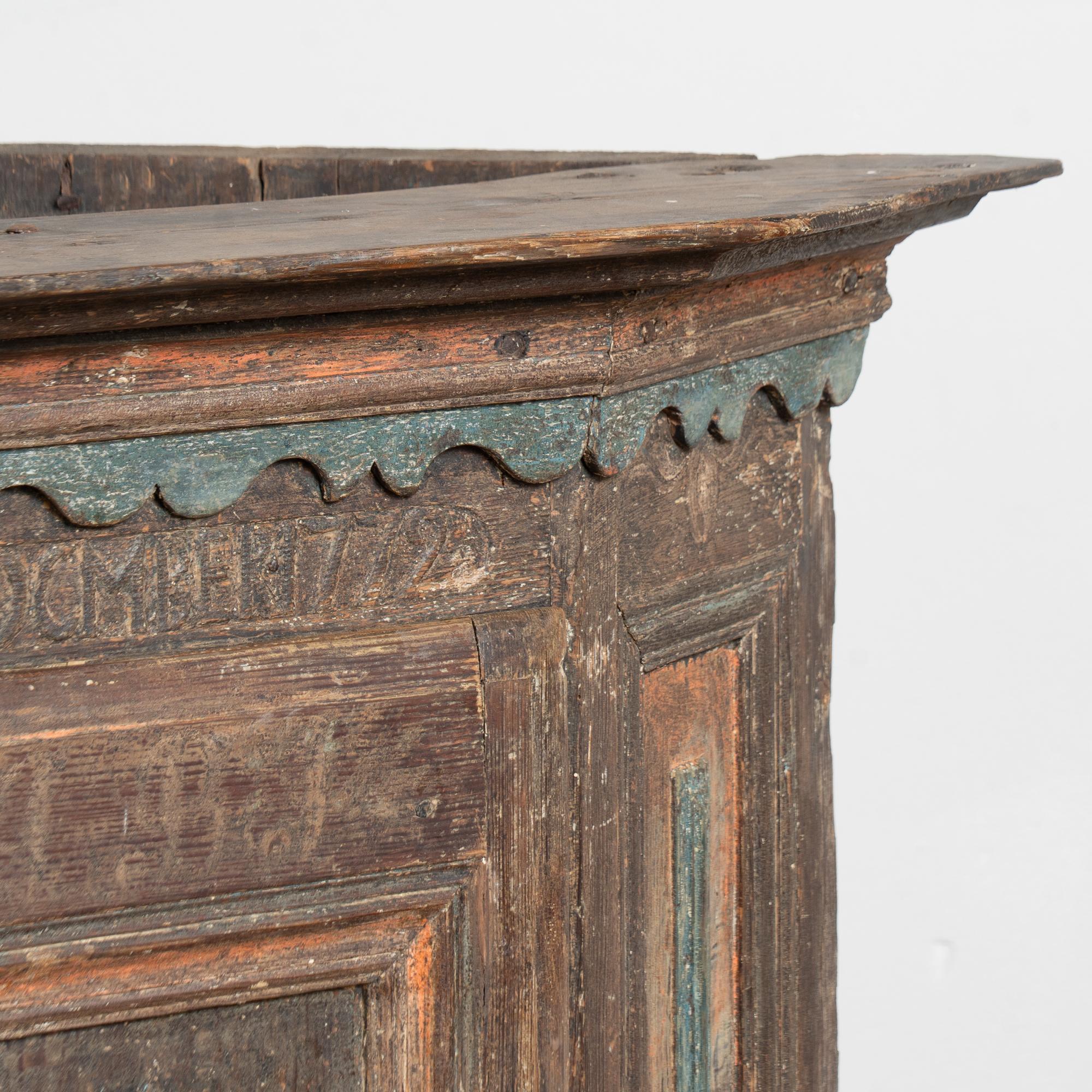 The lower portion of the central door is painted with the date 1721, while above the door a carved monogram includes the date 1772. The crown is finished with scallop-carved blue painted detailing. The cabinet has an exceptional aged patina, with extensive distress throughout the painted finish that contributes to the authenticity of its age. Old repairs are visible along the crown, with additional scratches, cracks, and age-related separation present.