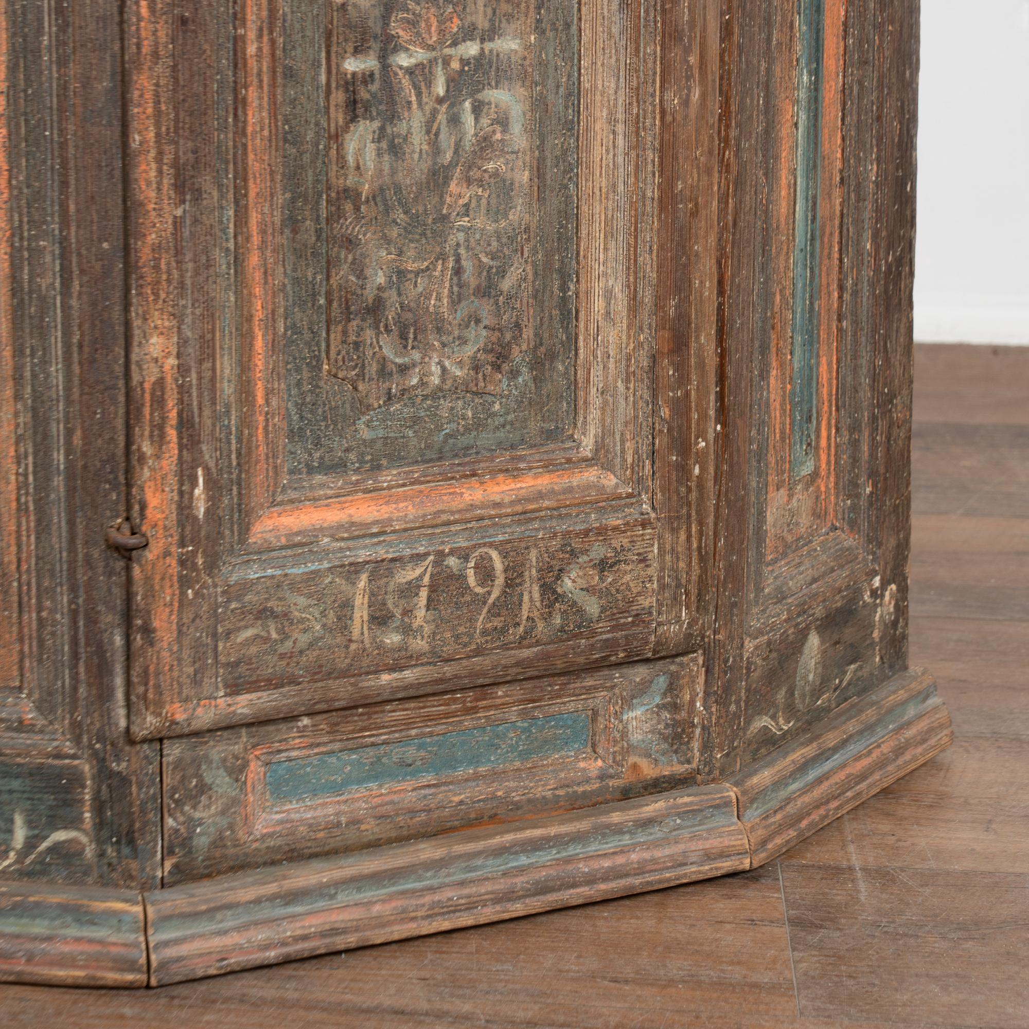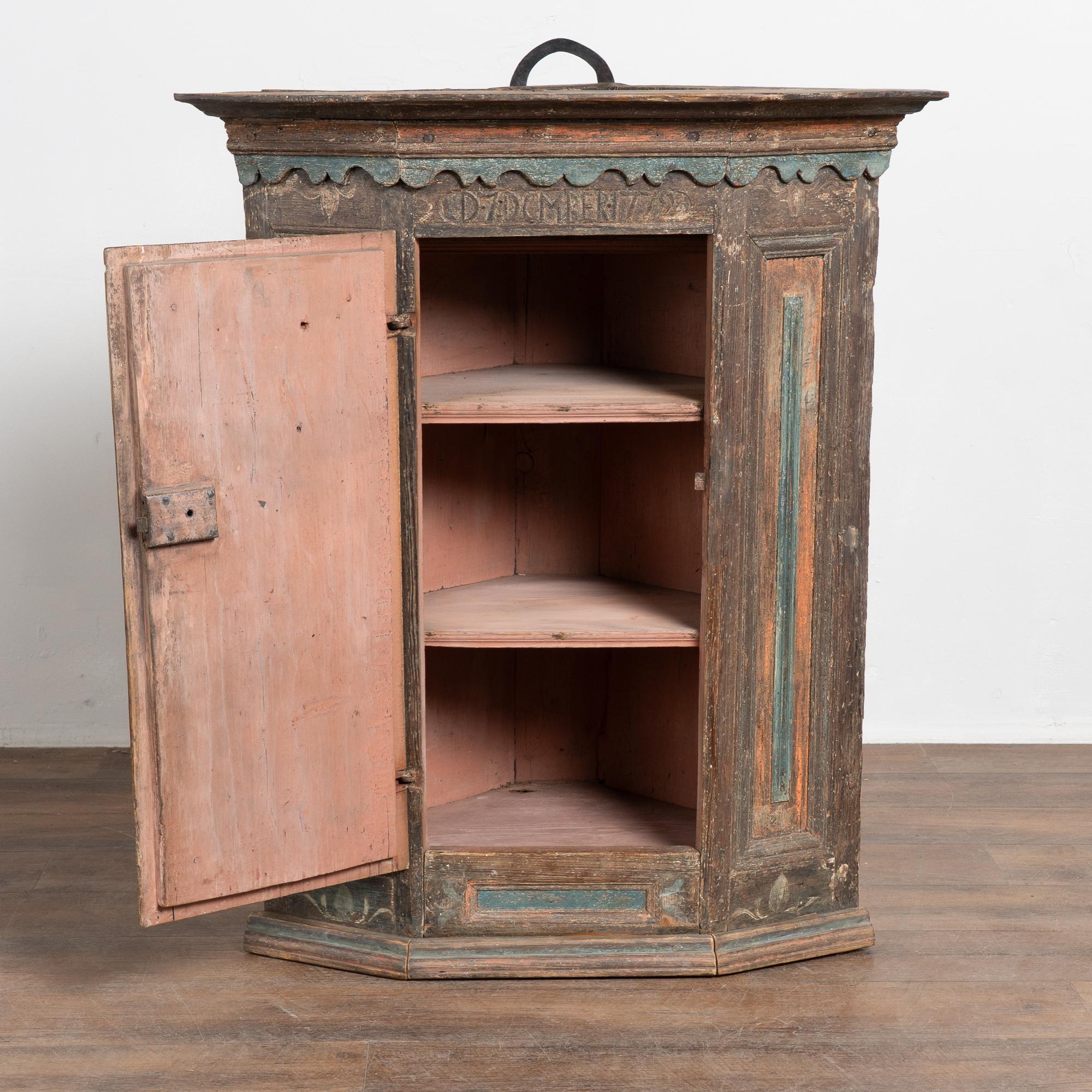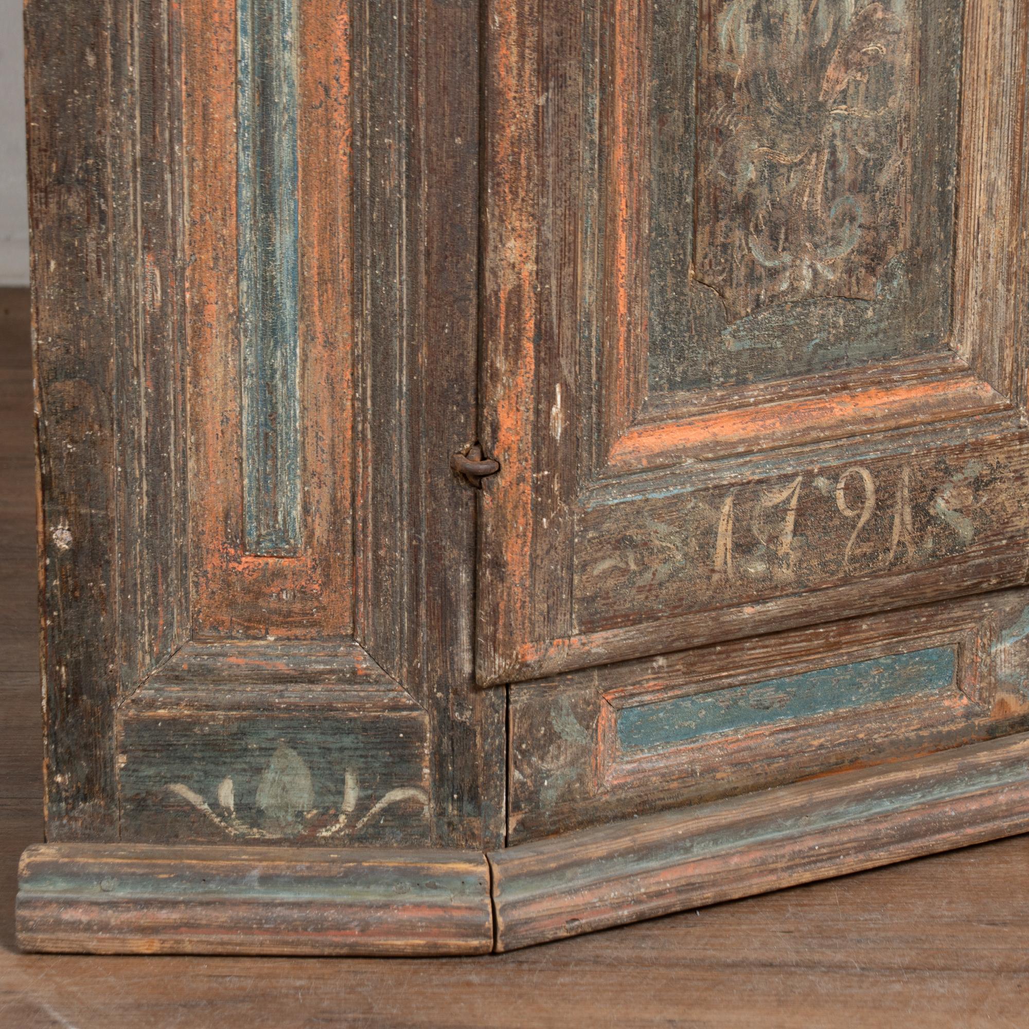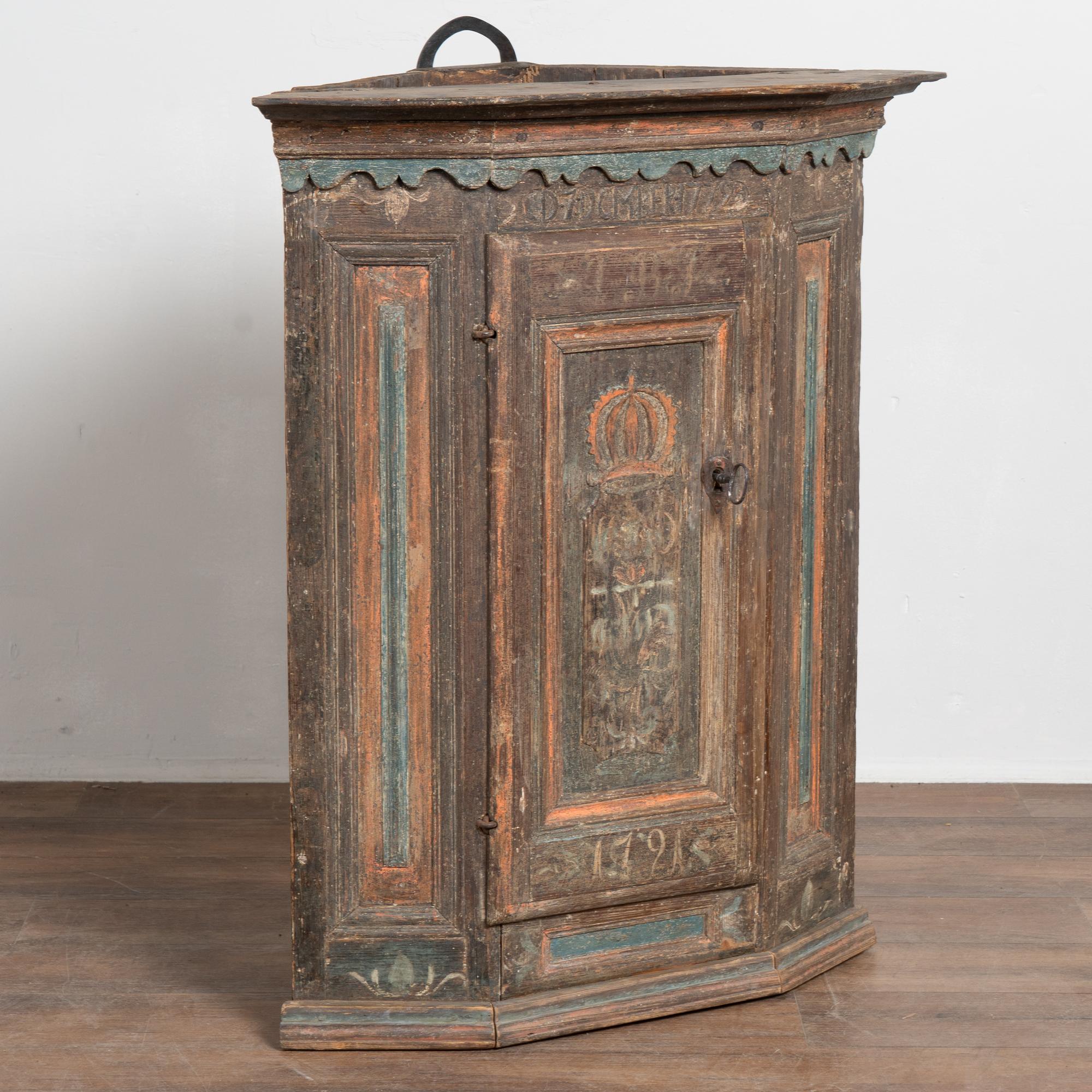 The lower portion of the central door is painted with the date 1721, while above the door a carved monogram includes the date 1772. The crown is finished with scallop-carved blue painted detailing. The cabinet has an exceptional aged patina, with extensive distress throughout the painted finish that contributes to the authenticity of its age. Old repairs are visible along the crown, with additional scratches, cracks, and age-related separation present.