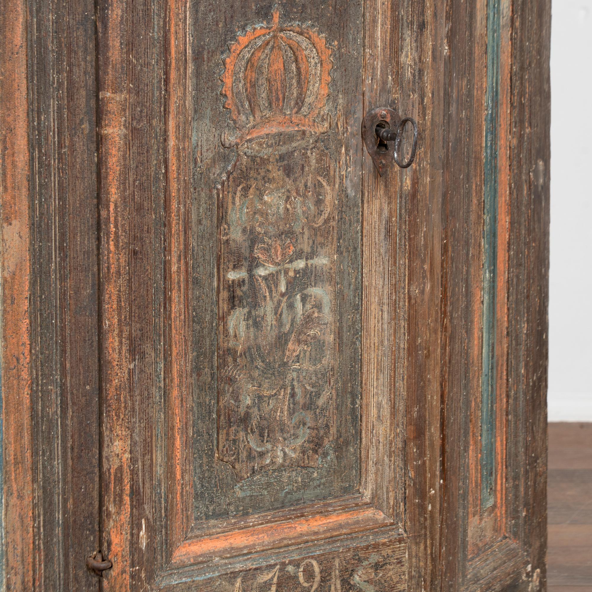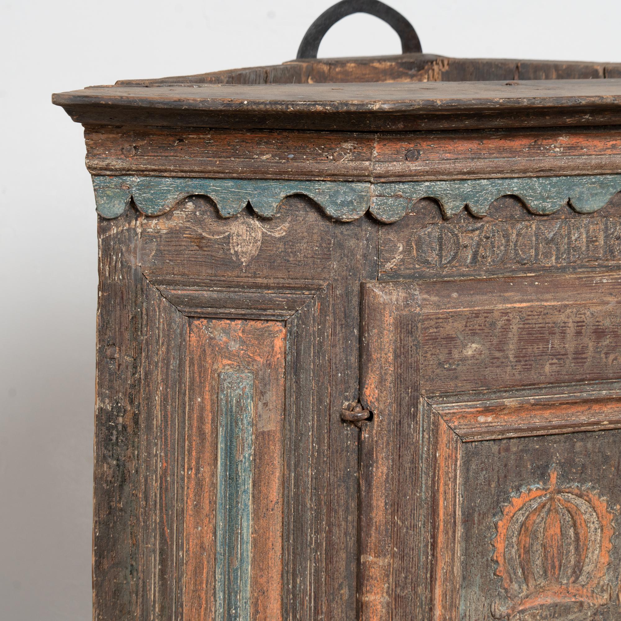 18th-century Swedish hanging corner cabinet crafted in pine with original painted finish. The exterior retains a brown background with red and blue accents, with canted sides featuring narrow painted panels. The central door panel shows a carved crown with remnants of painted floral decoration.