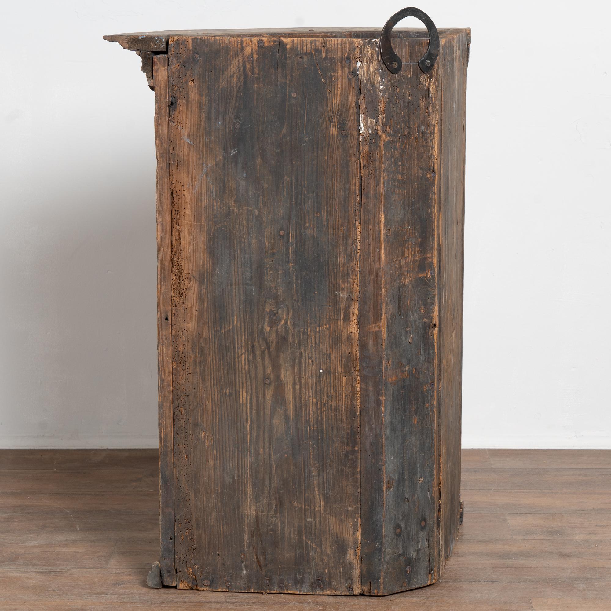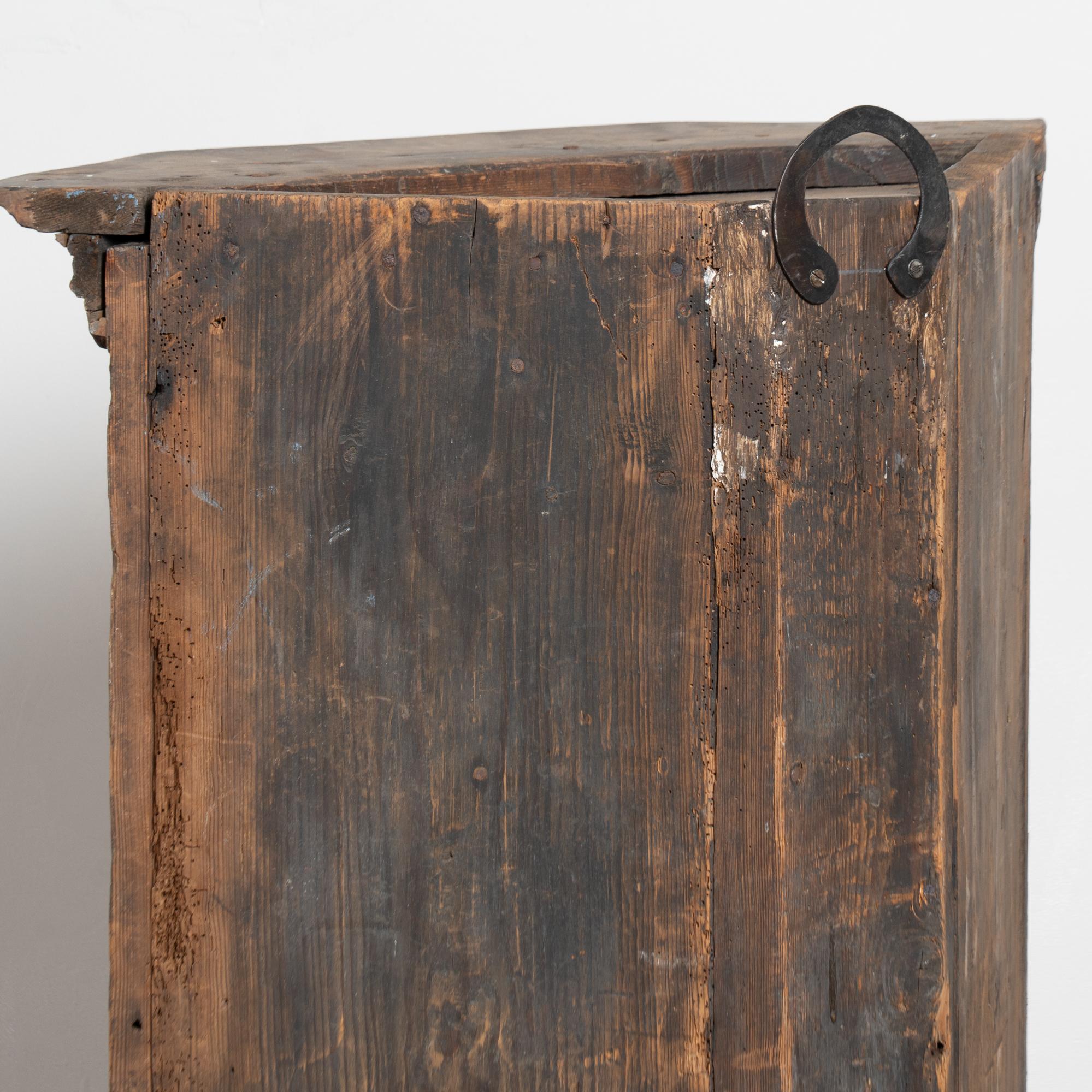The back shows old dried wormholes and old repairs. The interior was painted a pink-mauve color at a later point in time. The lock and key function loosely and inconsistently; the buyer may prefer to use the key as a pull only. Restored, strong, stable, and ready to hang.