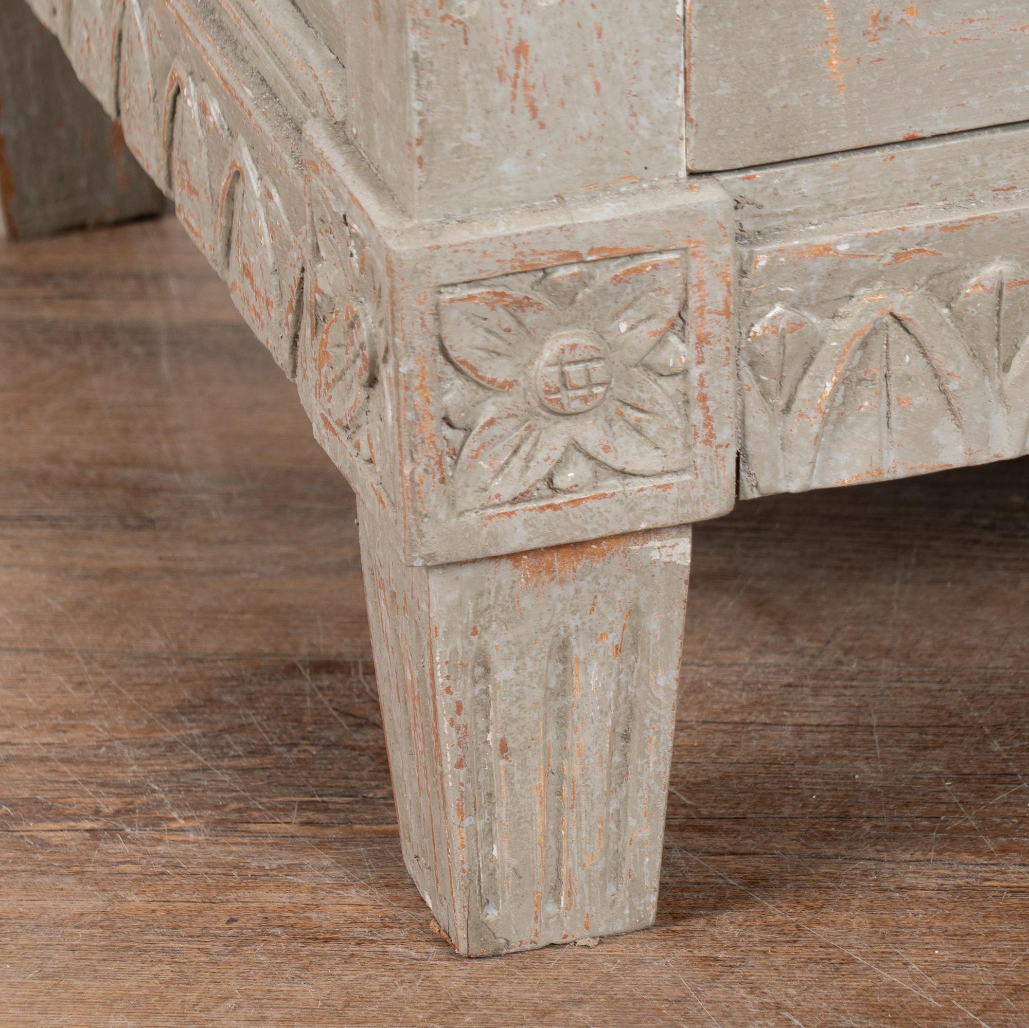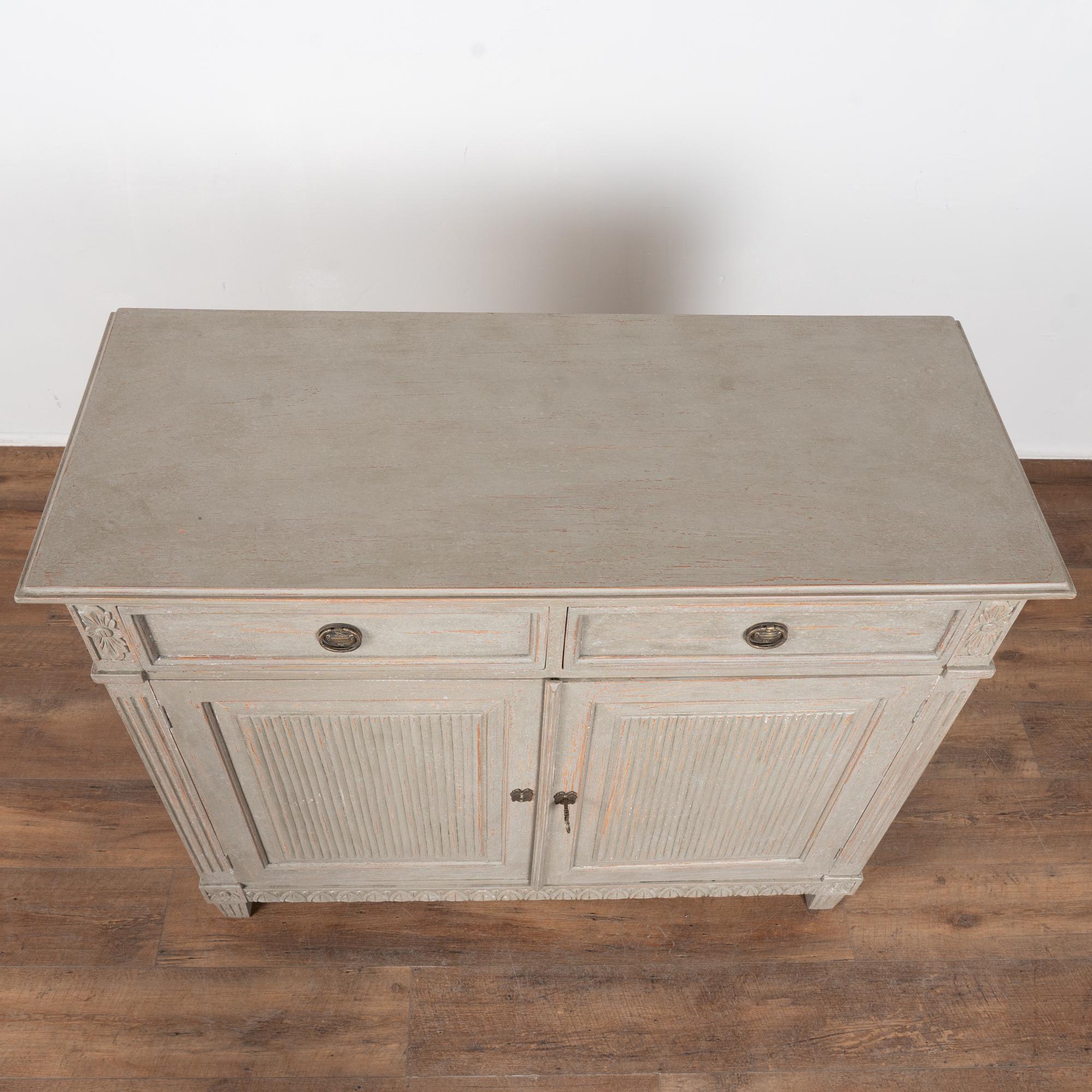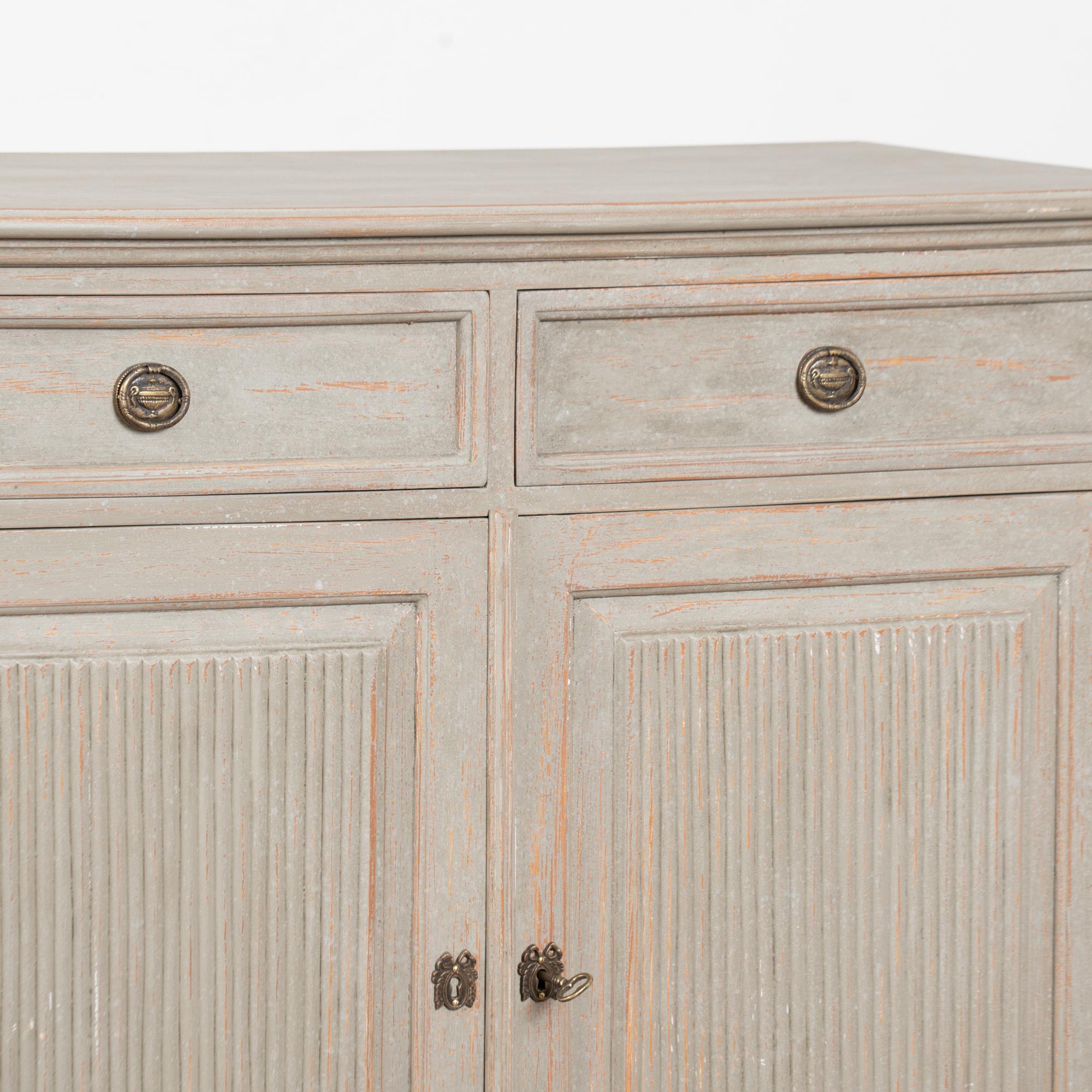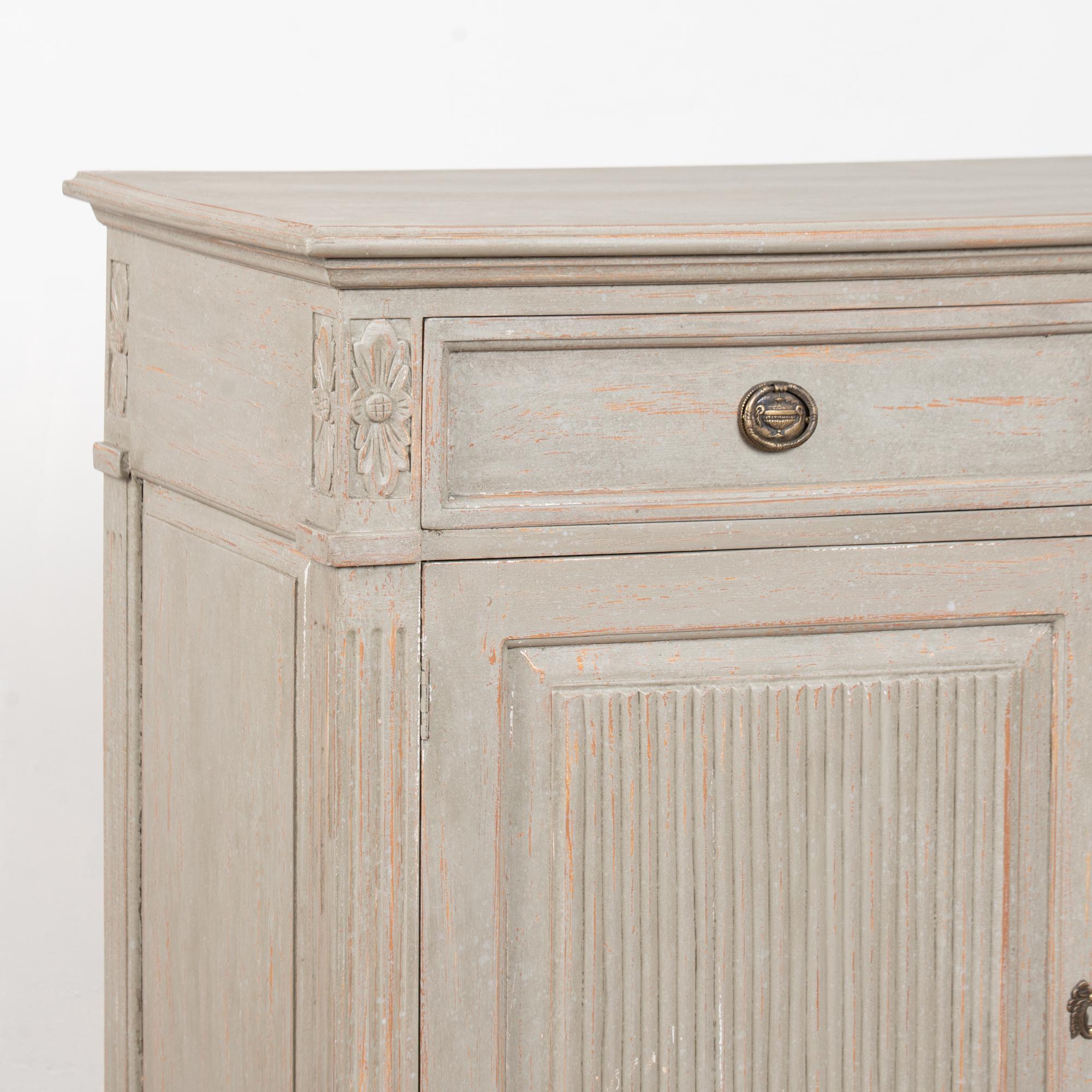 Late 19th century Swedish Gustavian style sideboard or buffet crafted in pine with two drawers over fluted cabinet doors. The case features fluted side columns topped with carved floral medallions and a decorative skirt detailed with an egg-and-dart pattern, all resting on fluted tapered feet. The sideboard presents well from the sides, with additional carved detail visible in profile.