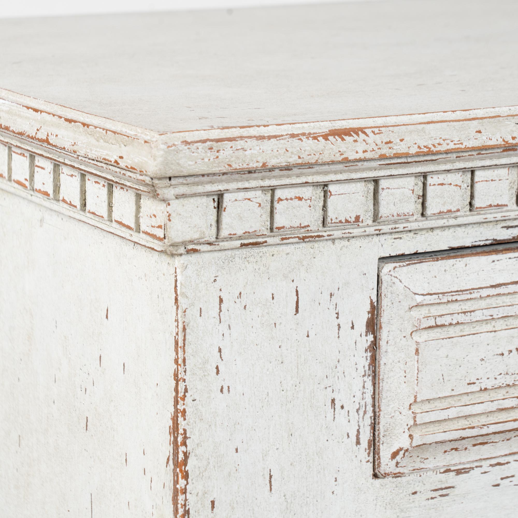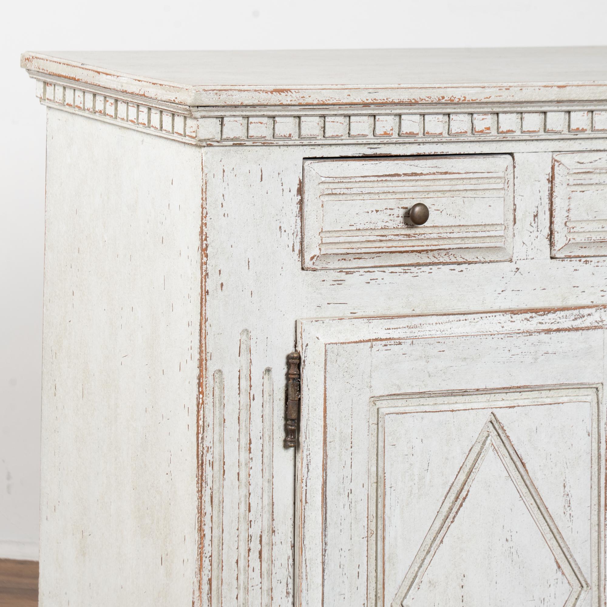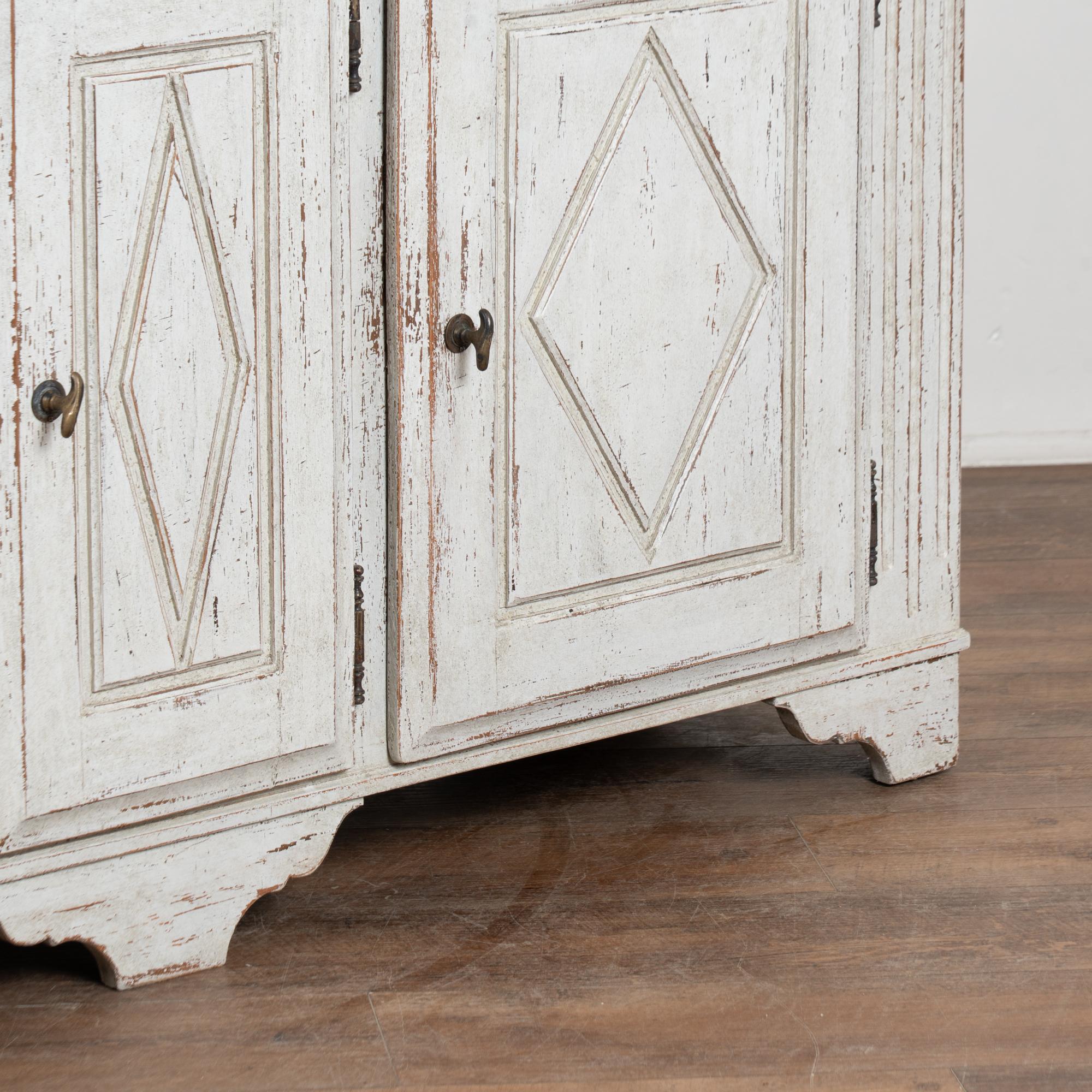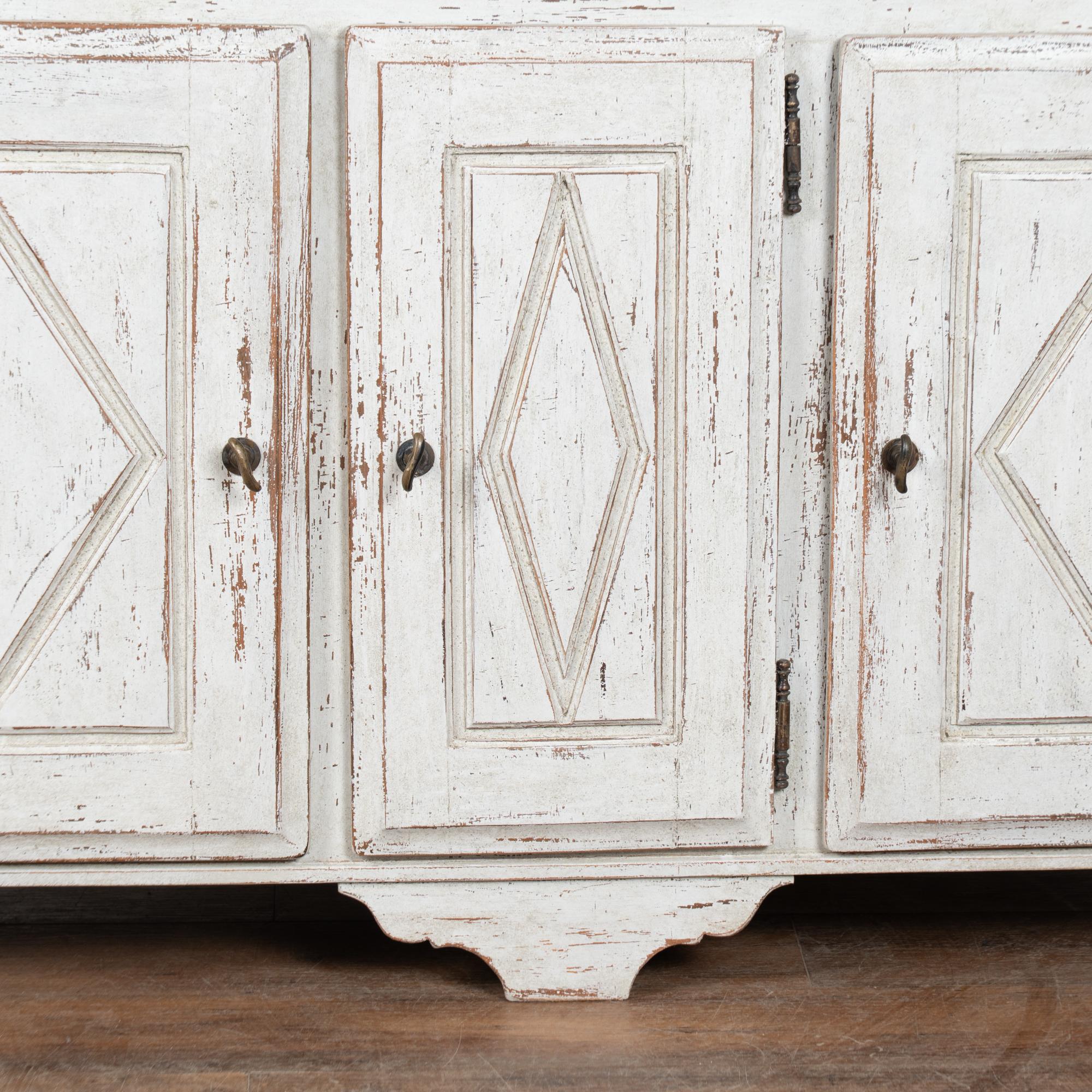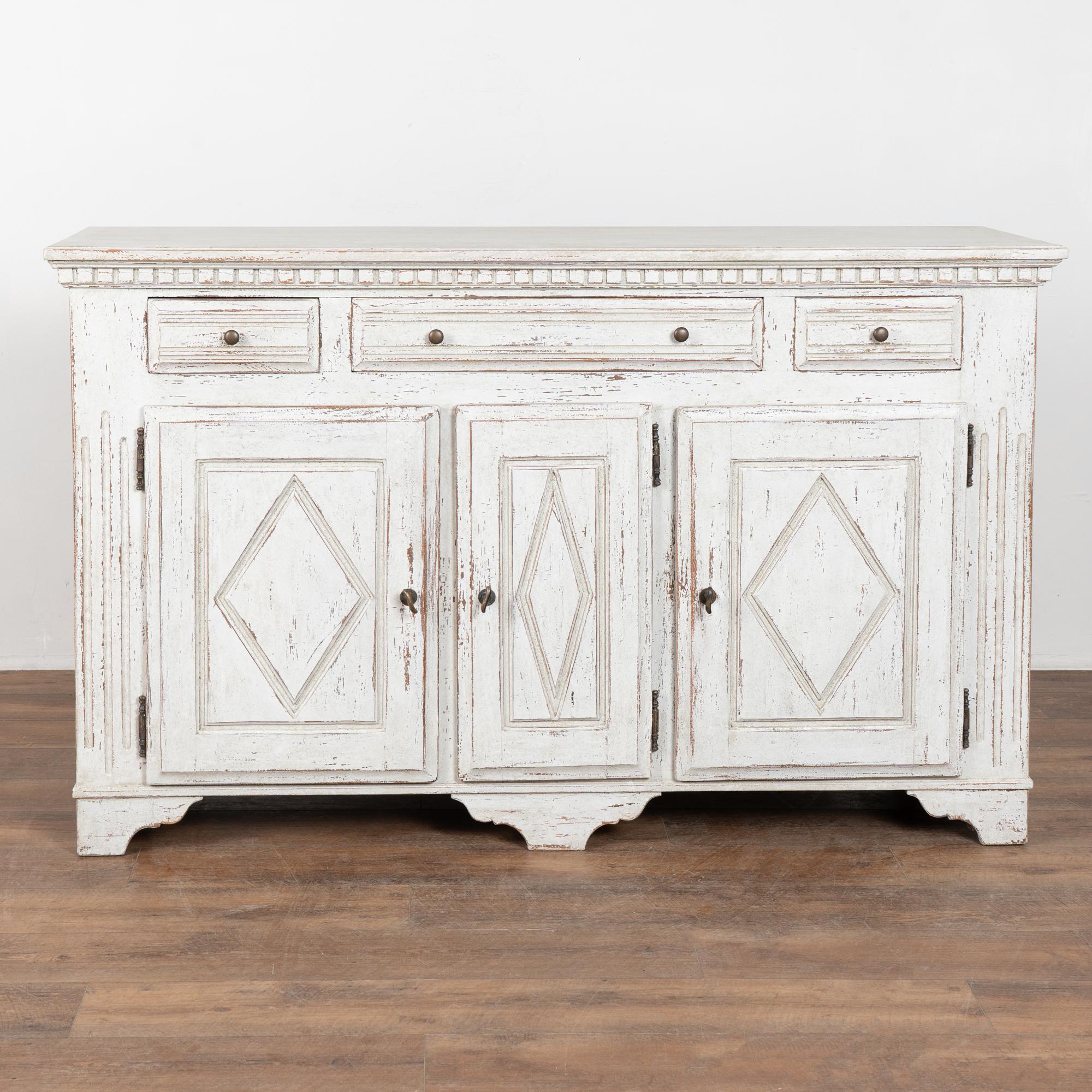The exterior has a newer professionally applied antique white painted finish with light gray undertones, gently distressed throughout to reveal natural wood beneath and suit the character and age of the piece. The three cabinet doors open and secure with turning brass latches. All drawers open easily.