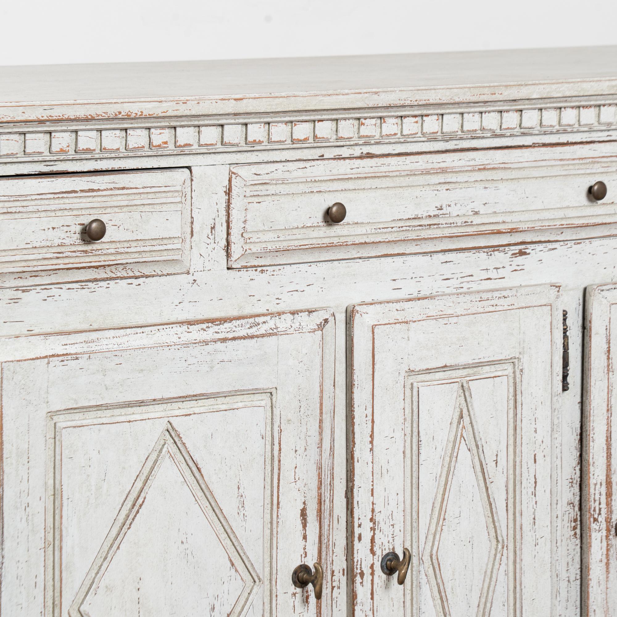 20th-century Swedish sideboard buffet crafted in oak with a three-drawer over three-door configuration. The case is finished with carved dental molding along the crown and simple fluted detailing along the sides. Each cabinet door features carved diamond panels, a traditional Swedish design element of the era.