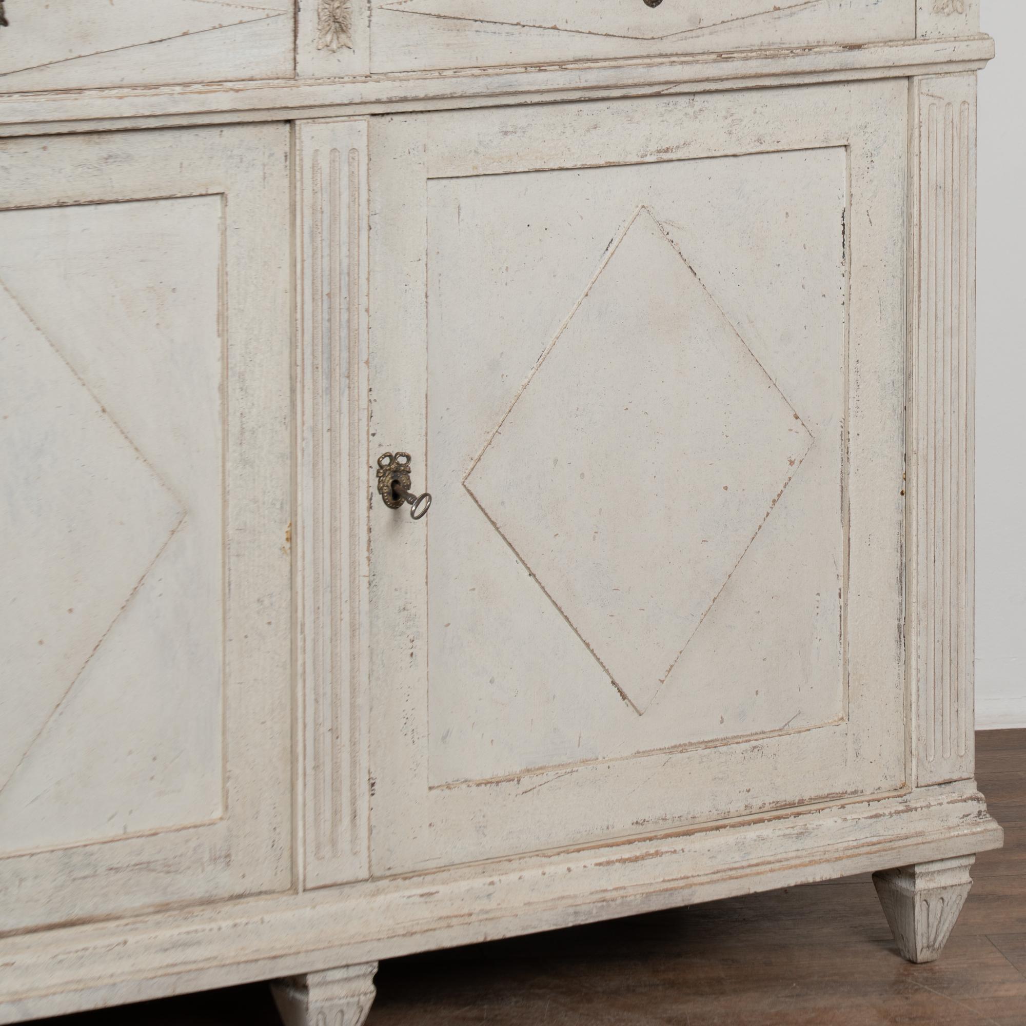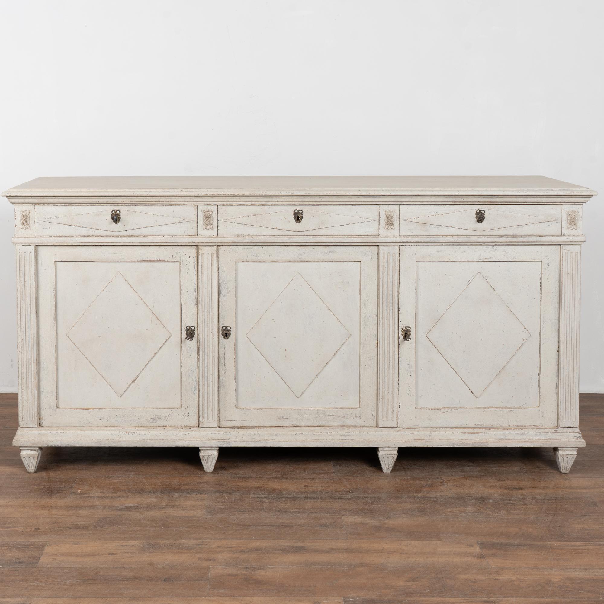 A newer professionally applied antique white painted finish with soft gray undertones has been lightly distressed throughout to suit the age and graceful character of the buffet. Age-related cracks are visible along the top, with additional minor cracking on the sides. Minor scratches and surface wear reflect years of use.
