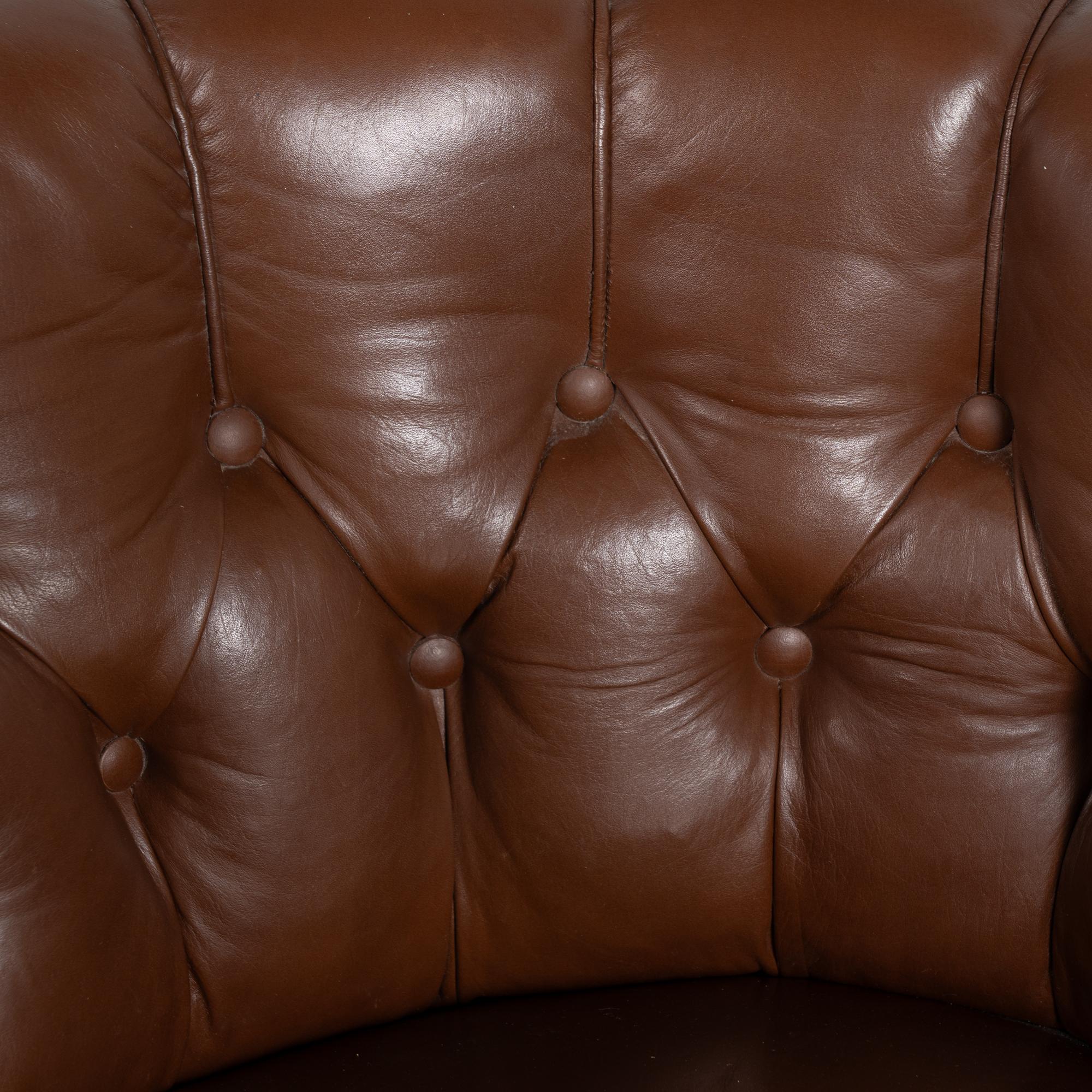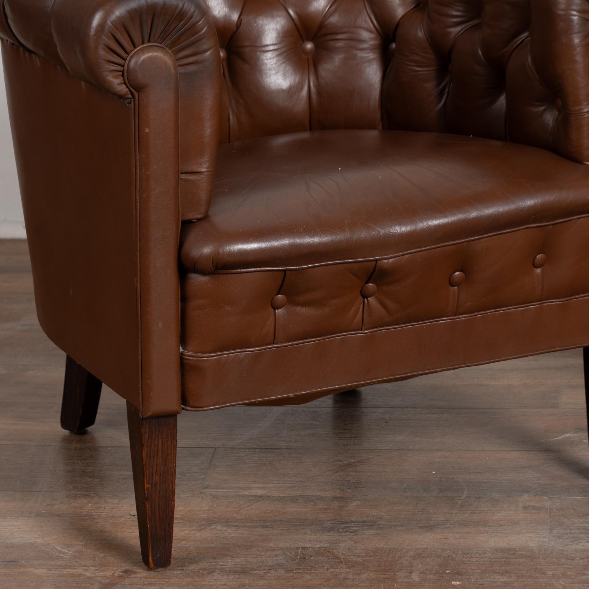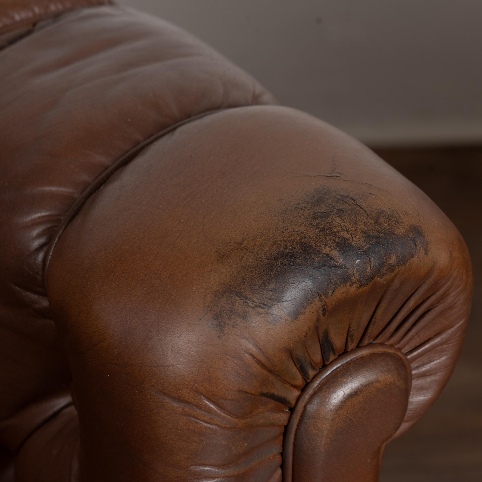 The vintage brown leather shows age-appropriate crackling and surface scratches, with darker stains visible on the front arms from years of use. Buttons remain tight and intact. Seat cushions are fixed and not removable. Some fabric sagging underneath.
