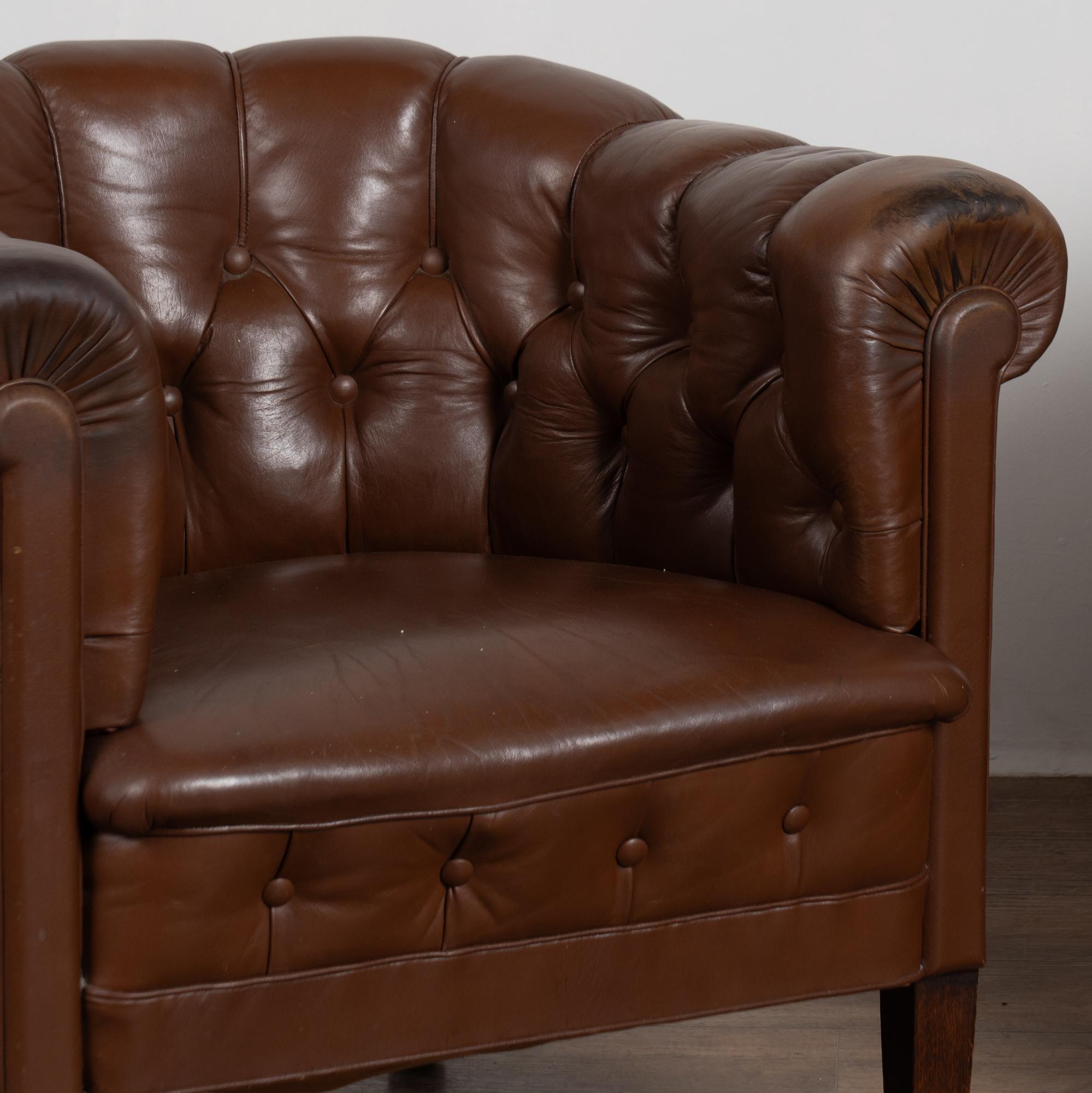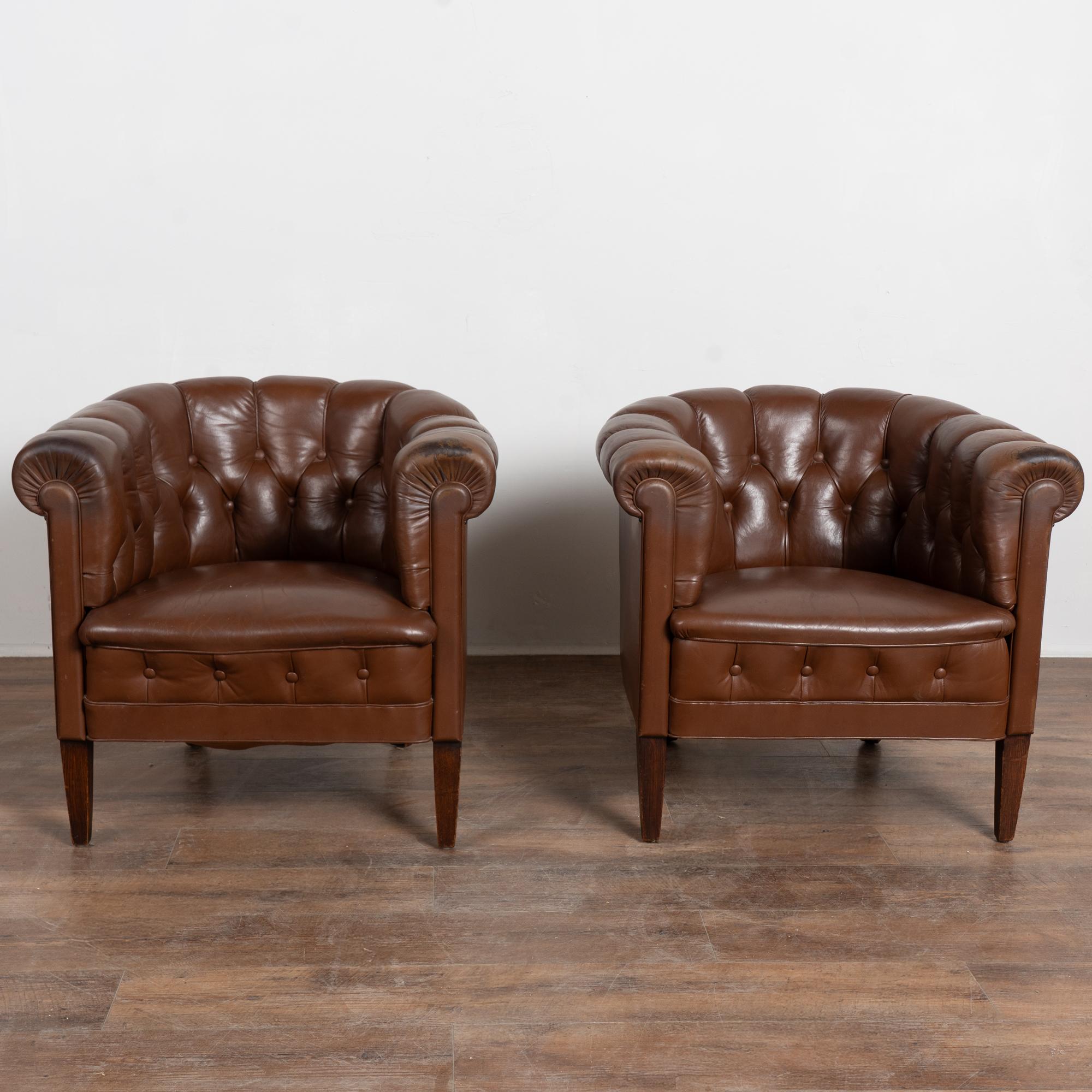 Pair of vintage brown leather barrel back club chairs featuring tufted button backs, self piping, and brass nail head trim under the rolled arms. The chairs rest on tapered hardwood feet and have a low, comfortable profile.