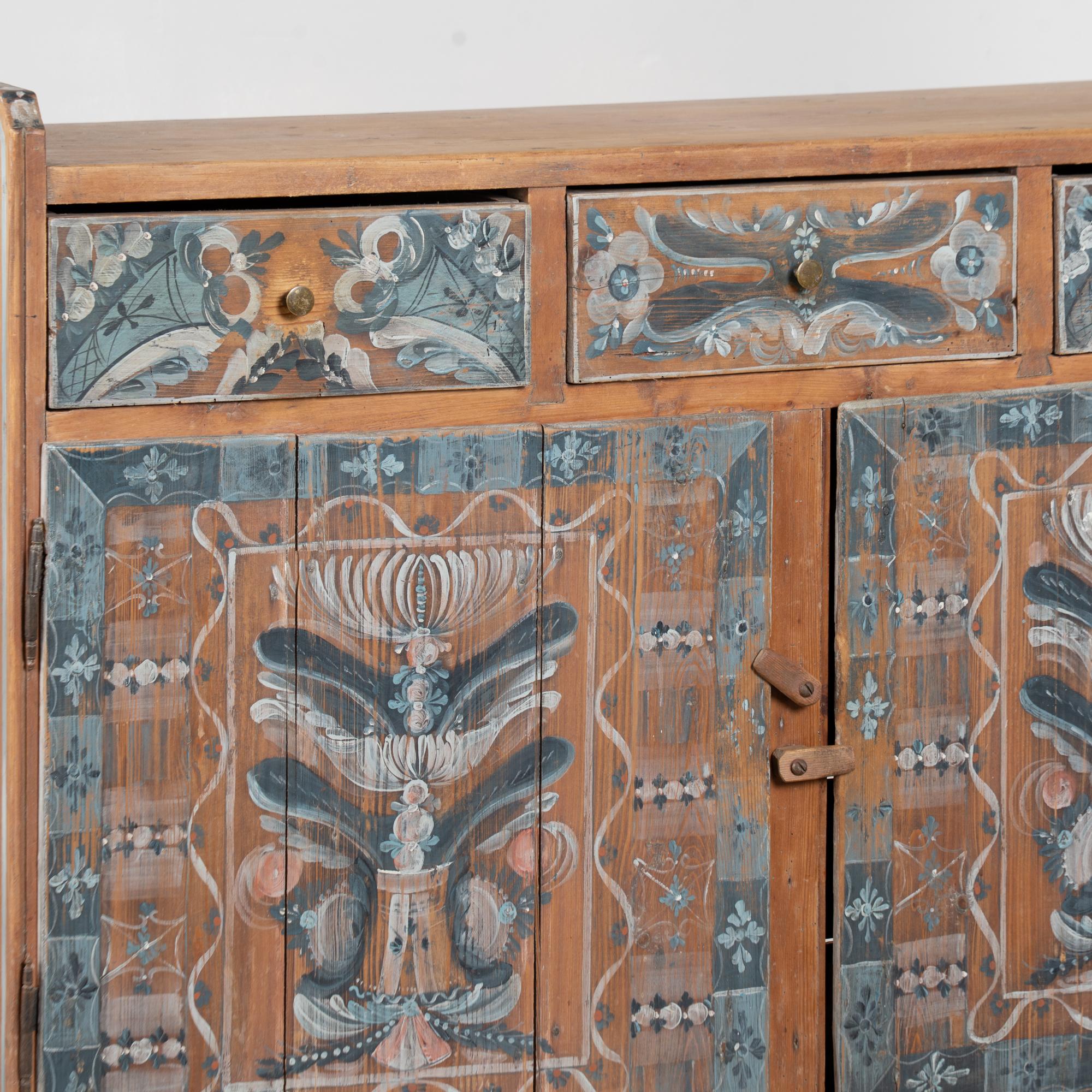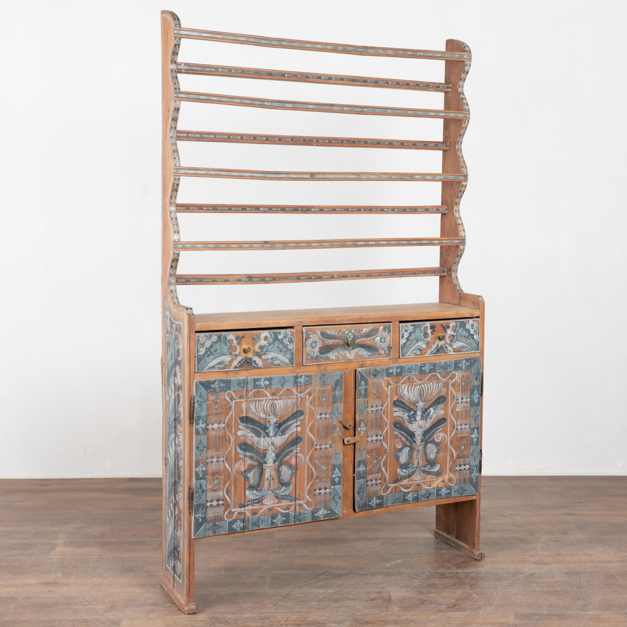 Early 19th-century Swedish narrow cupboard crafted in pine, featuring an upper plate rack, three small drawers, and lower cabinet doors. The piece retains its original hand-painted finish in soft blues and grays, distinctive of northern Sweden and likely associated with the Dalarna region. The interior is painted brick red, creating a strong visual contrast.