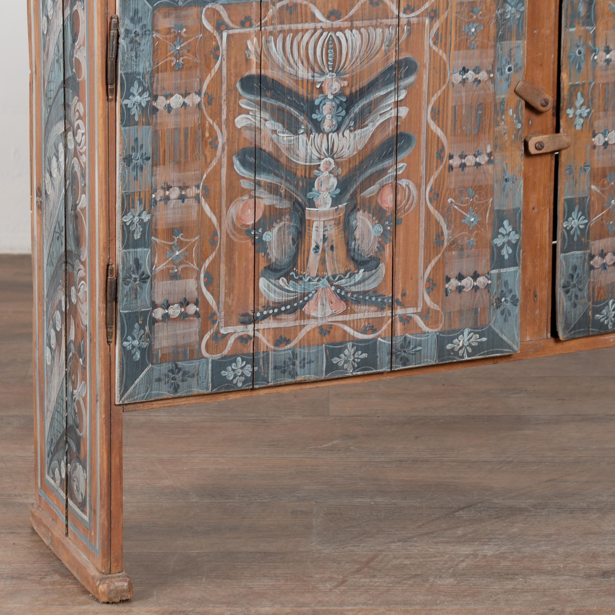 The pine shows age-related cracks, scratches, and separation along the sides, with an earlier repair visible along the back. Two wooden latches secure the cabinet doors; the left door shows age-related separation, and both doors display minor cracking consistent with age. It is the original painted surface that defines this cupboard’s character and appeal. Restored strong, stable, and ready for use. Back restored at earlier point in time (wood appears newer).