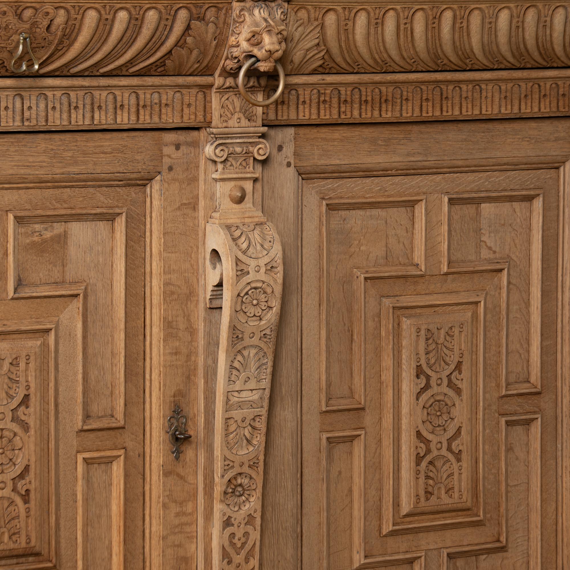 Late 19th-century French large bleached oak display cabinet featuring extensive carved decoration throughout, including floral medallions, lion heads, claw motifs, and additional ornamental detailing. The cabinet is built in two sections for easier transportation and installation. The upper section has four glass-pane doors with adjustable shelving for display. Below are four curved drawers, followed by a lower section with large, heavily paneled cabinet doors. The cabinet rests on five bun feet in front and four block feet in back, giving it a strong architectural presence. Locks and keys no longer function; keys are included and used as pulls only. Typical scratches, nicks, separations reflect generations of use and do not detract from the timeless appeal of this grand display cabinet.