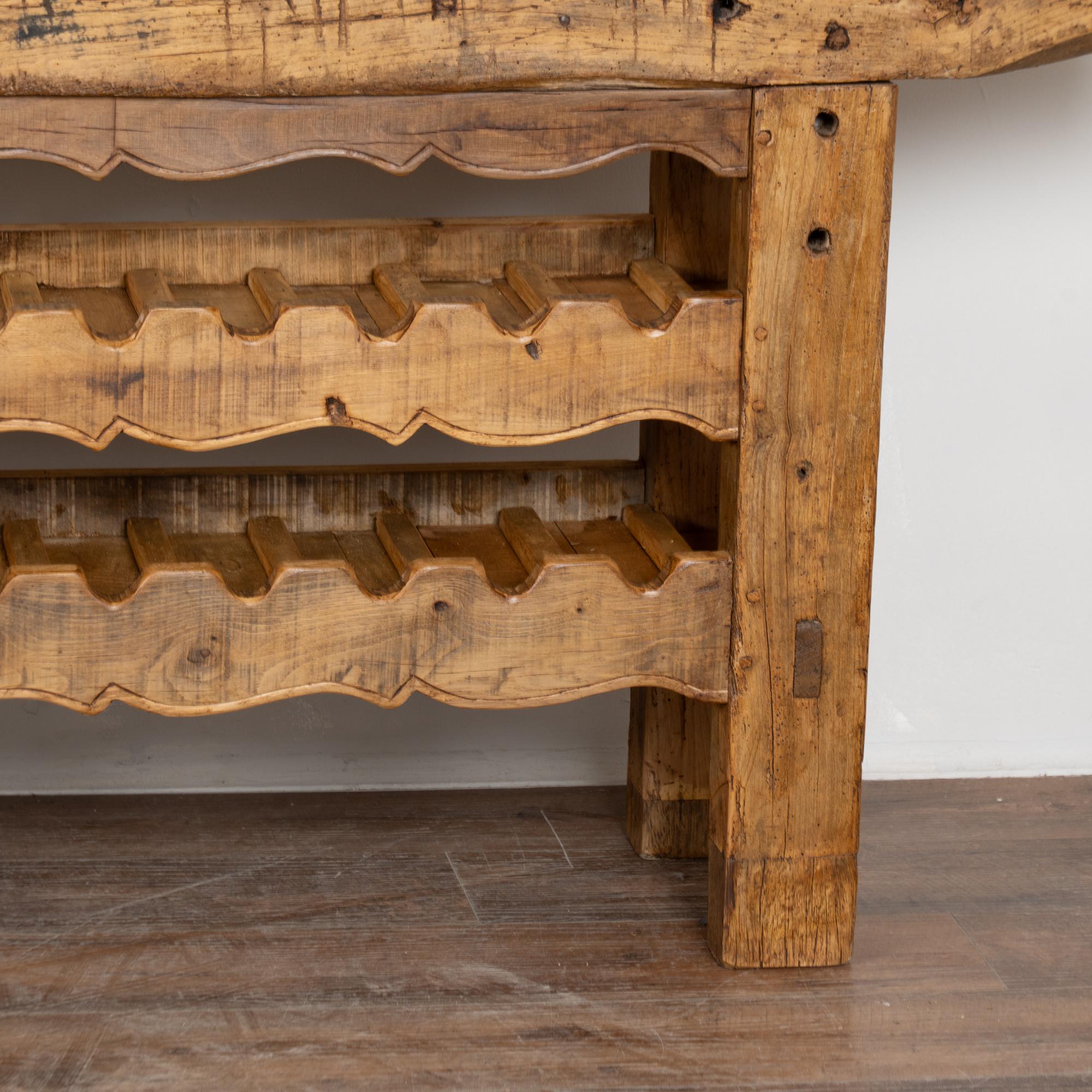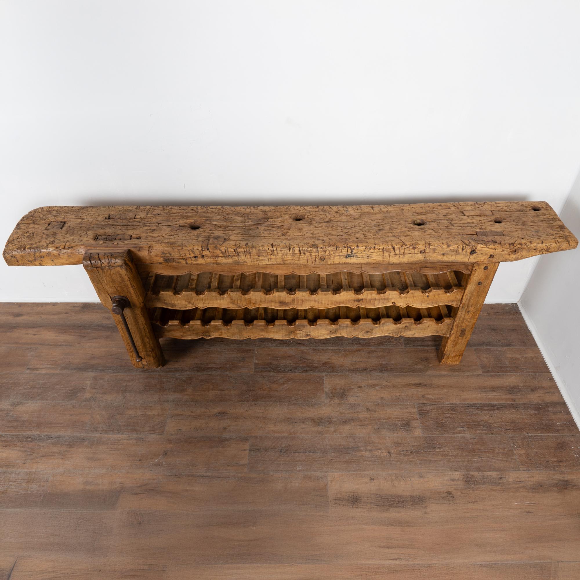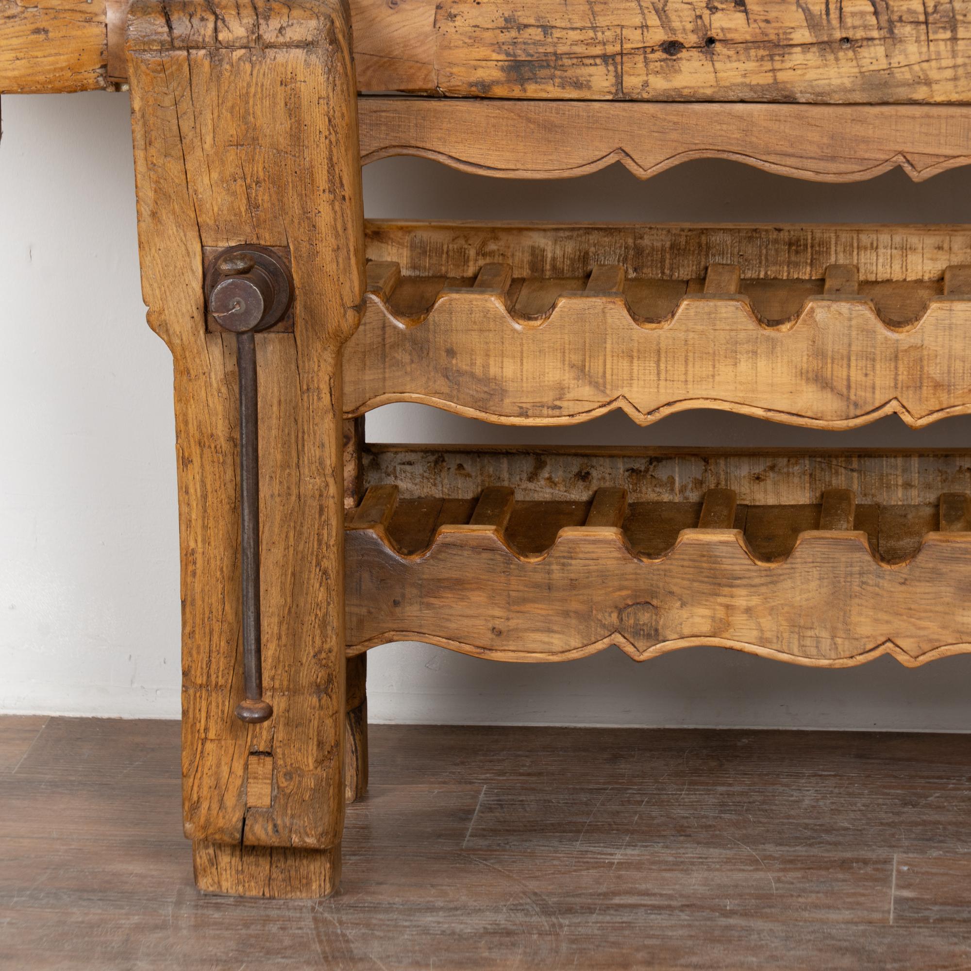 It is the years of constant use revealed in every ding, gouge, gnarl, deep crack, and scratch that enrich the character of this impressive carpenters' workbench from France. Unique to this console is the (newer) two shelves serving as a wine rack; decorative scalloped carving along the front.