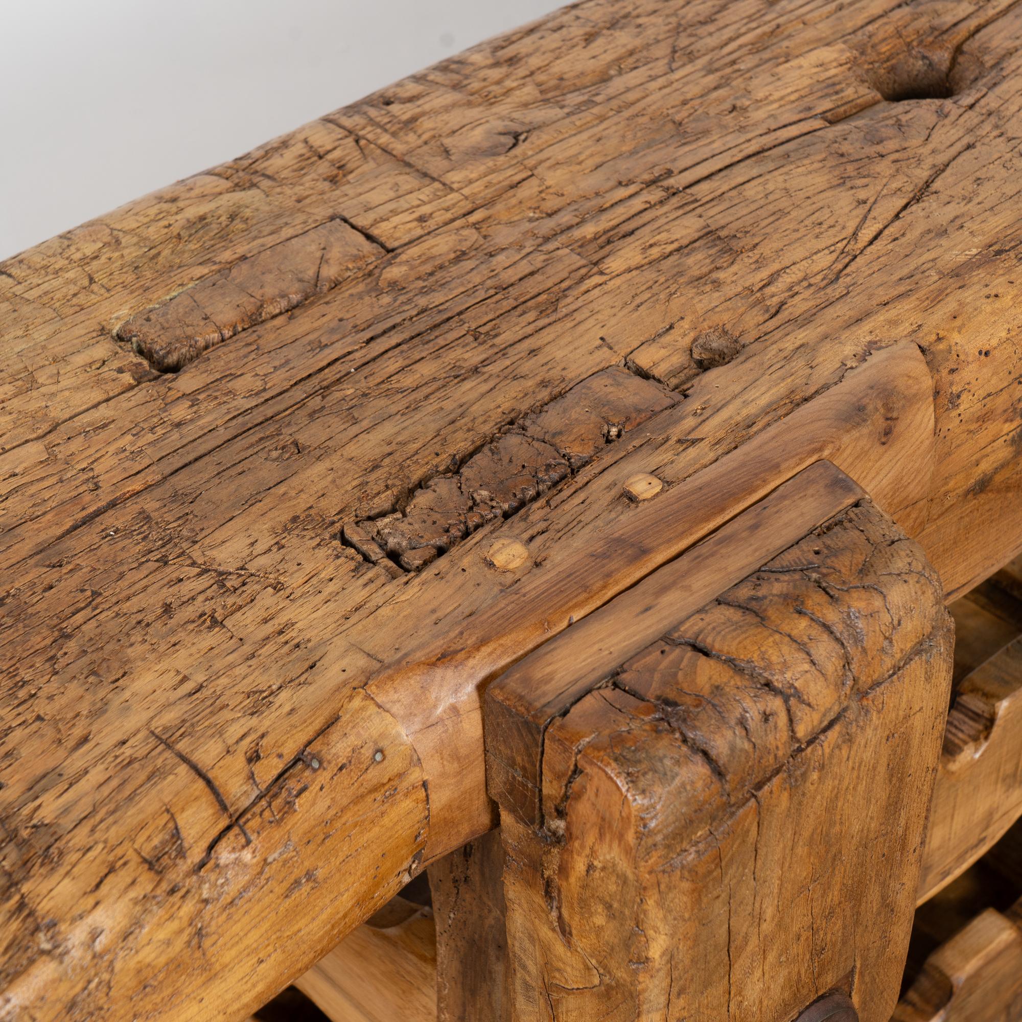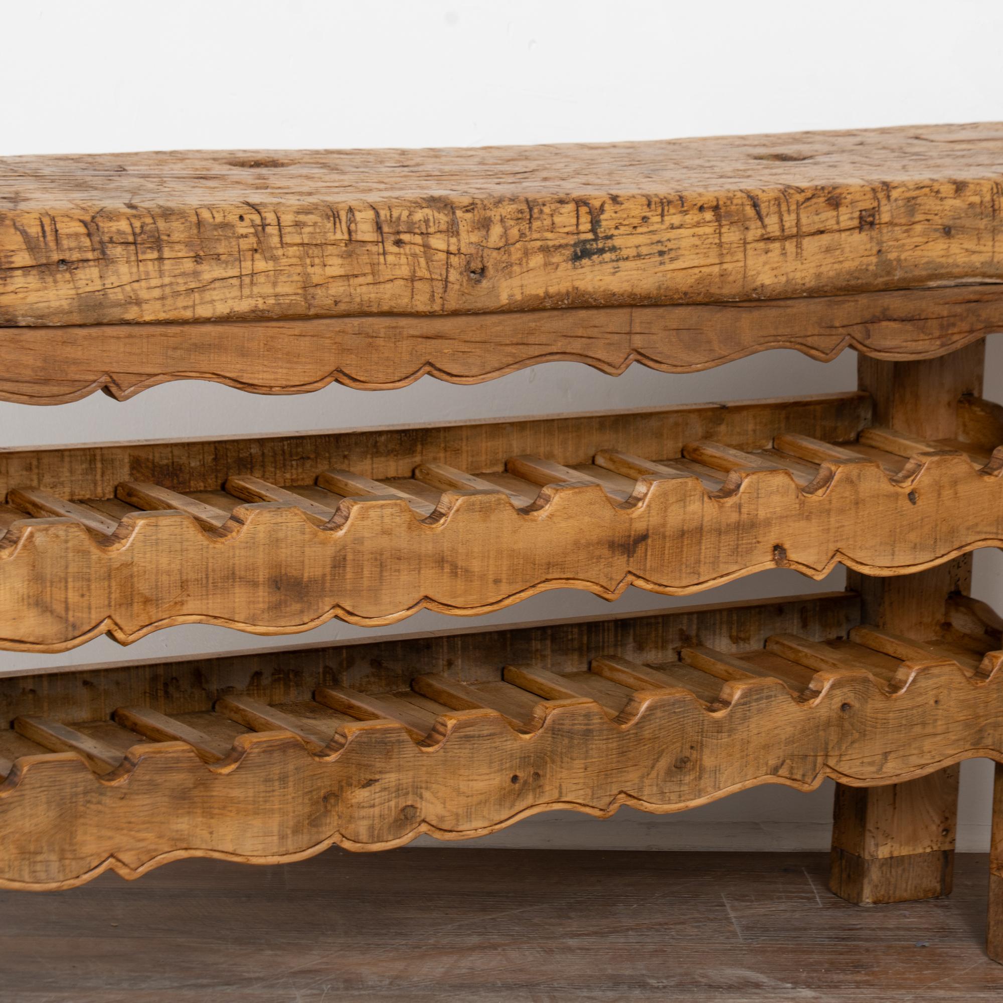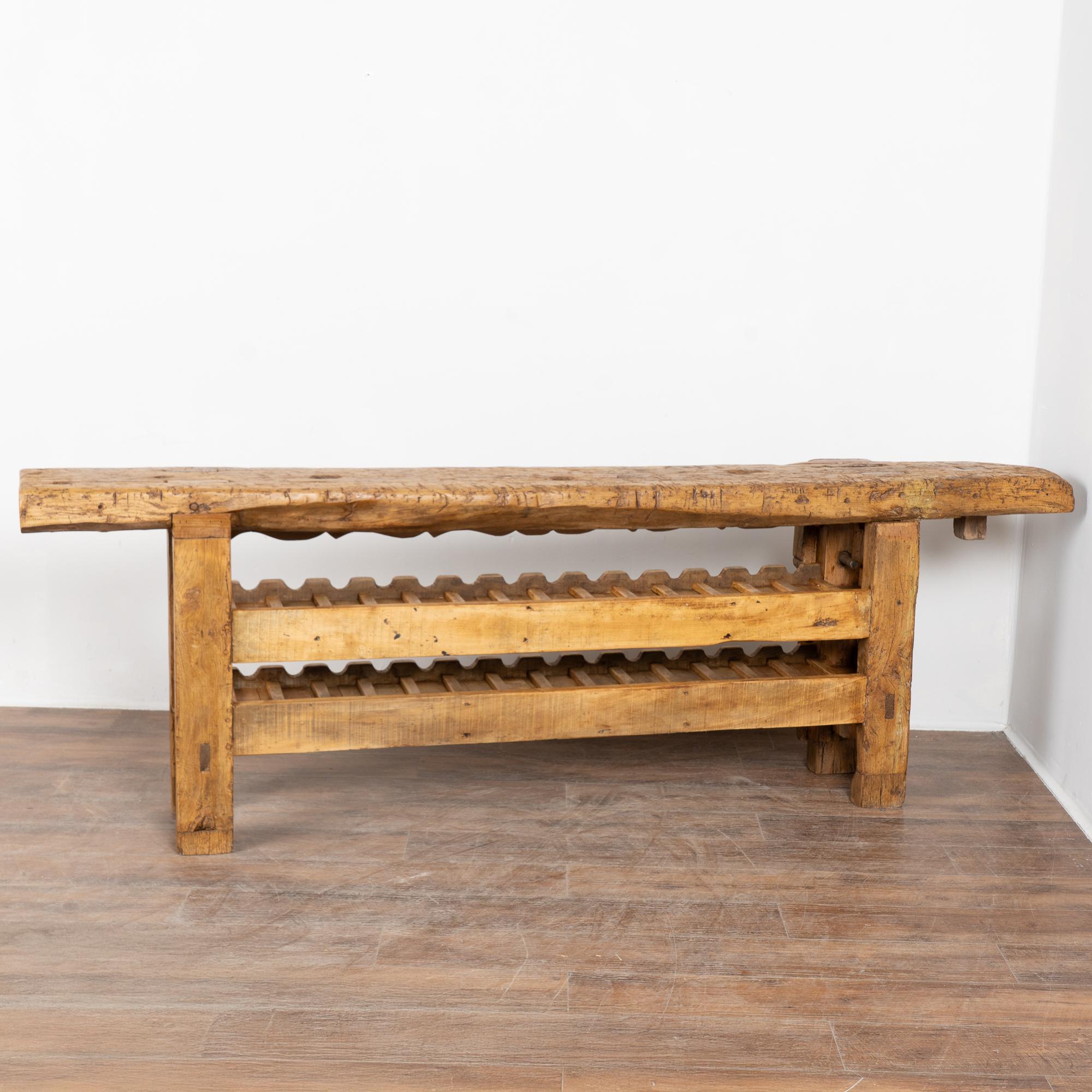 It is the years of constant use revealed in every ding, gouge, gnarl, deep crack, and scratch that enrich the character of this impressive carpenters' workbench from France. Unique to this console is the (newer) two shelves serving as a wine rack; decorative scalloped carving along the front.