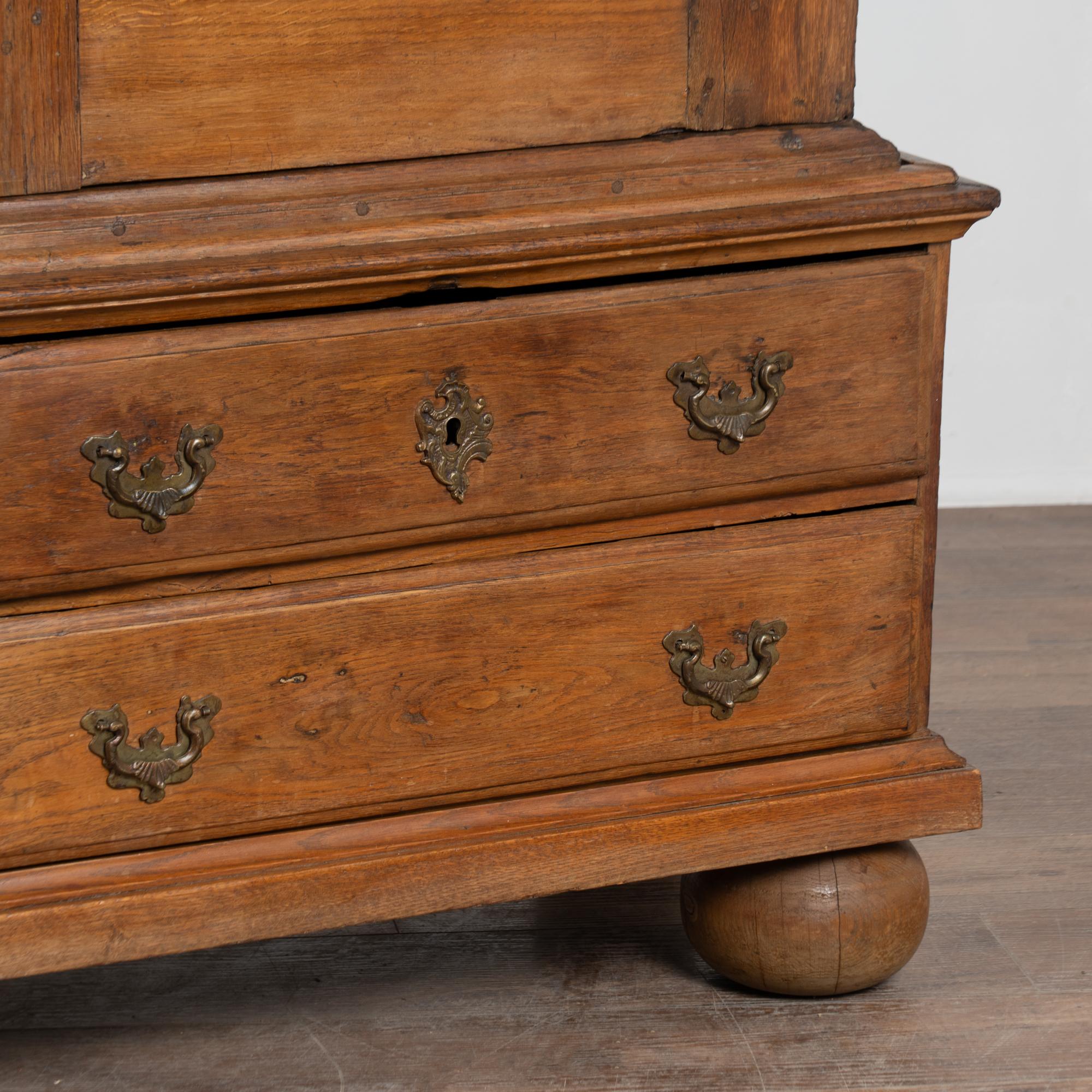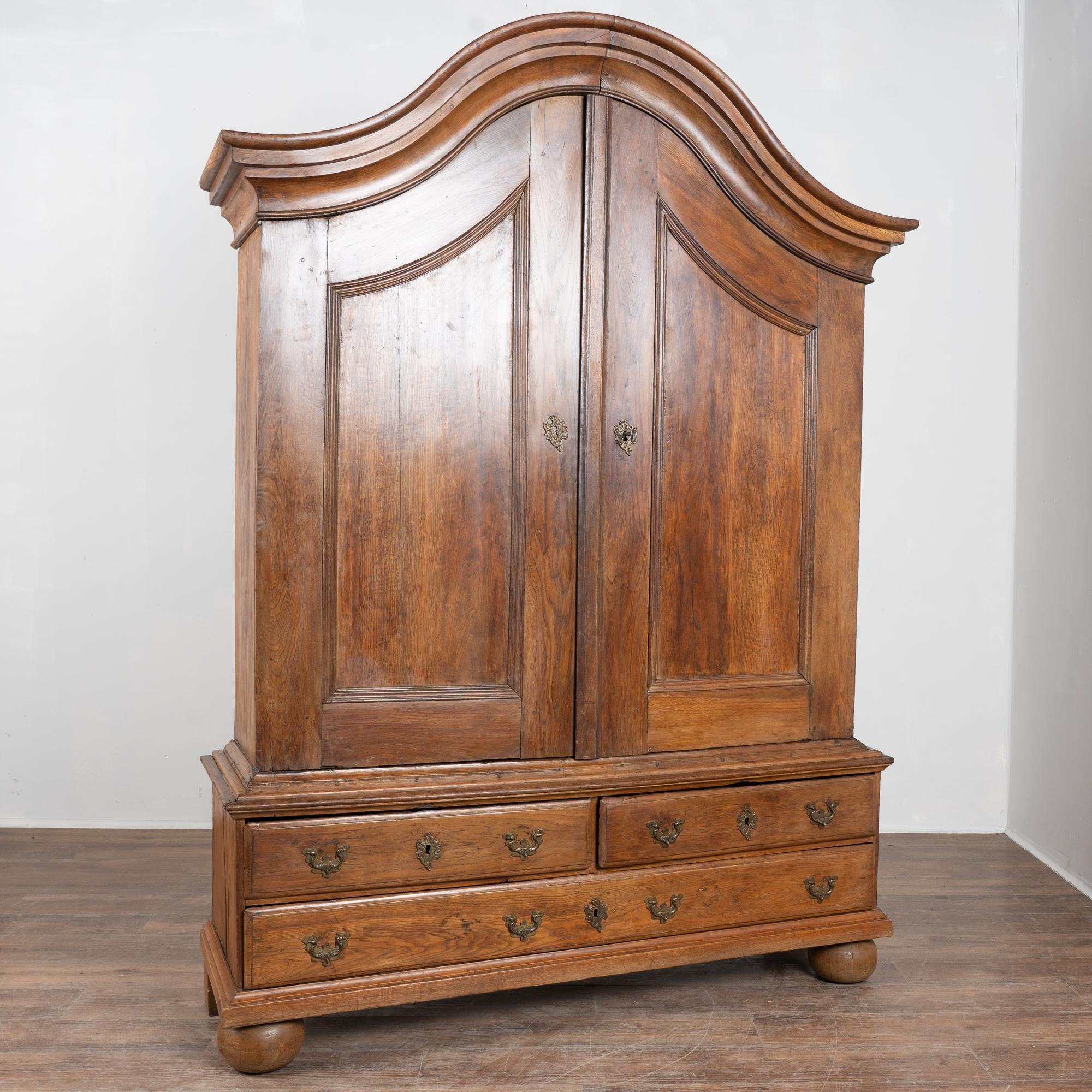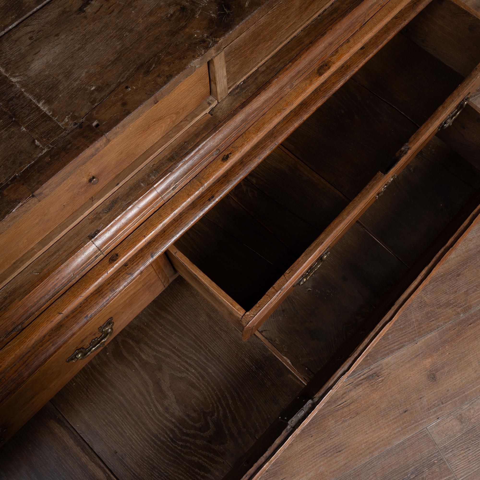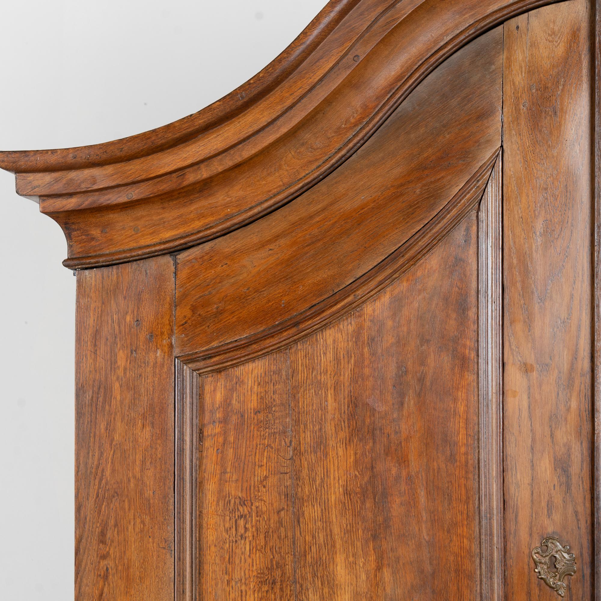 Late 18th-century Swedish oak tall Rococo cabinet with deep aged patina and a dramatic curved bonnet crown. The lower section features two drawers over one long drawer, each opening with brass pulls. Drawer bottoms show extensive age-related separation typical of oak furniture from this period. The upper cabinet doors still lock with the original key and open to reveal three interior drawers. This stately cabinet has stunning patina and grand presence.