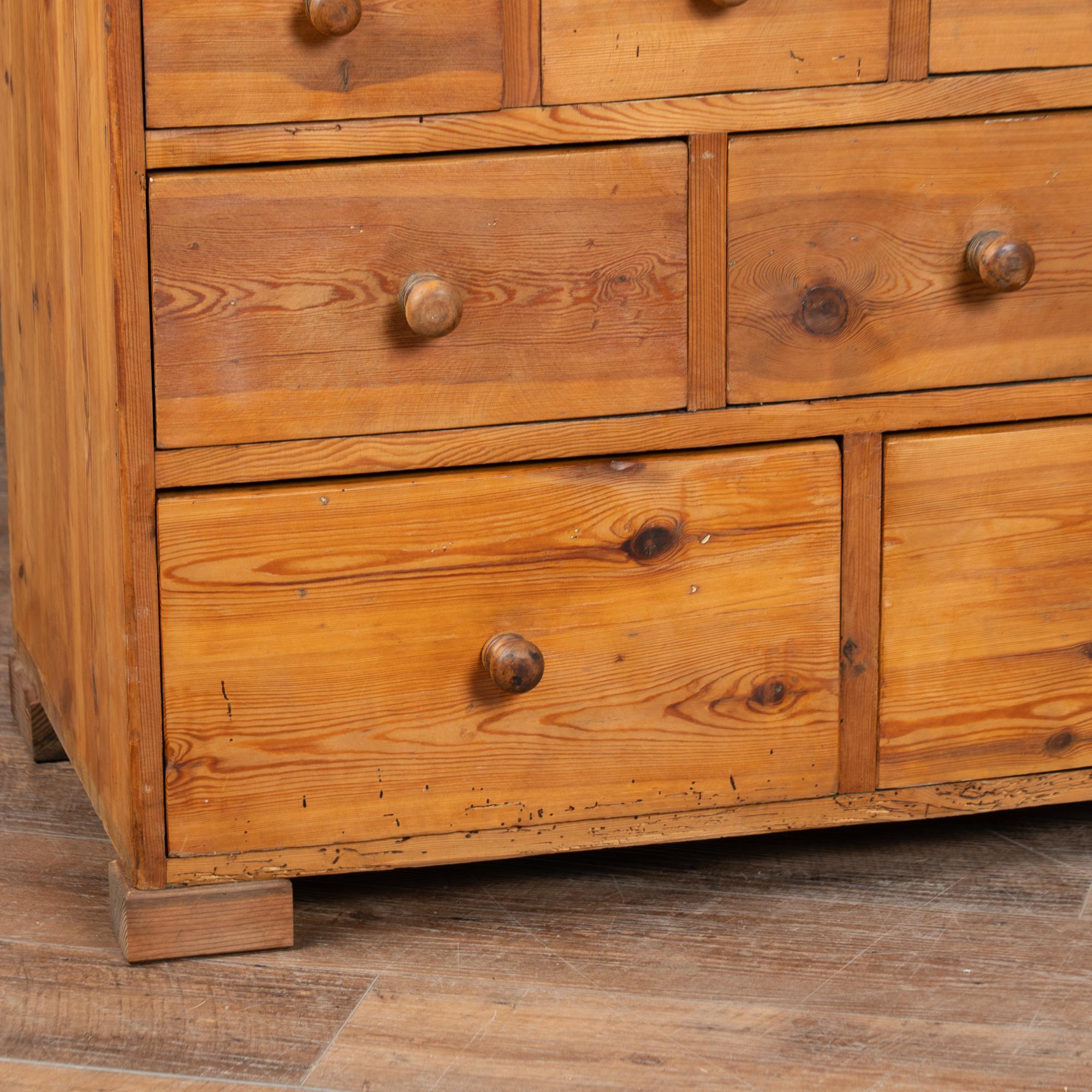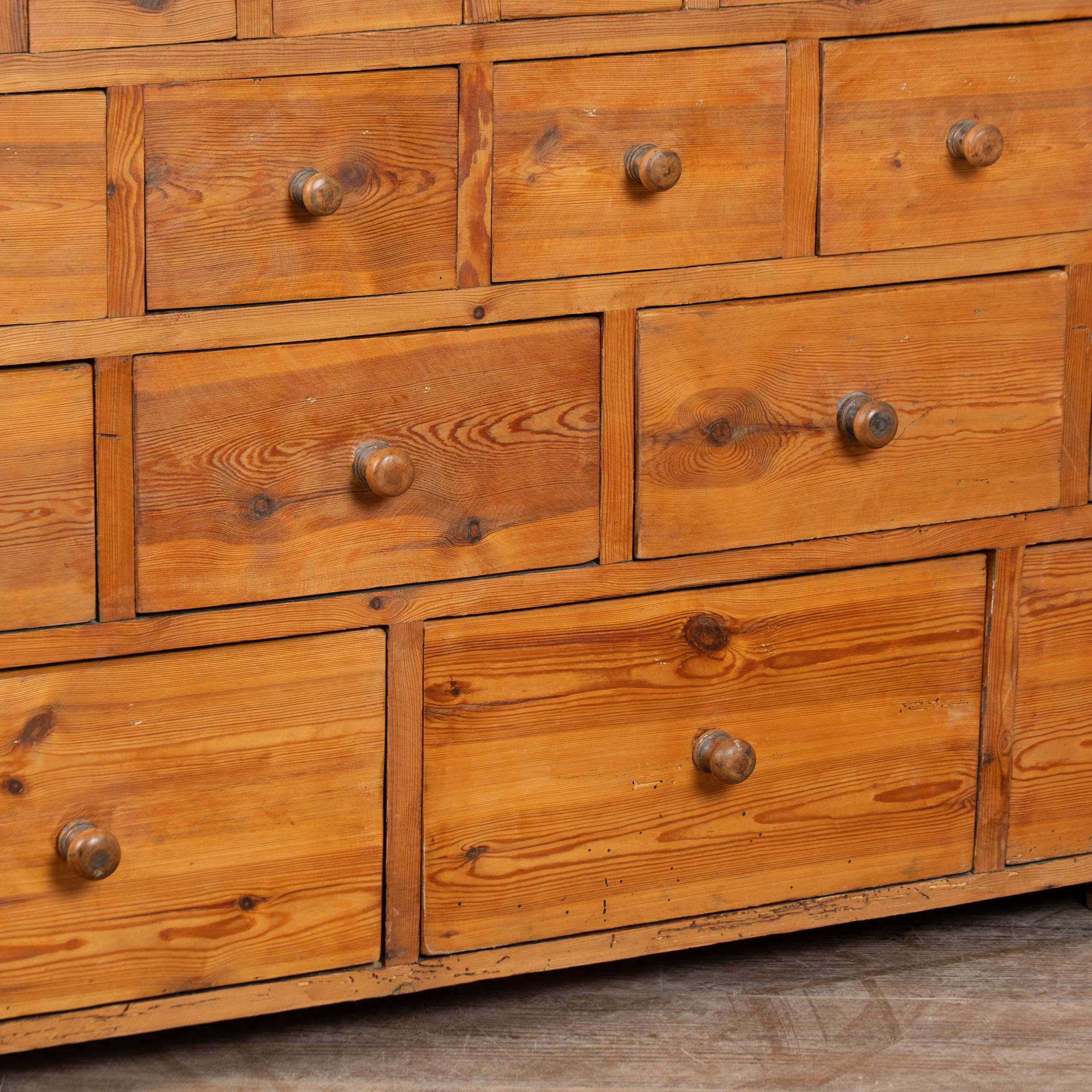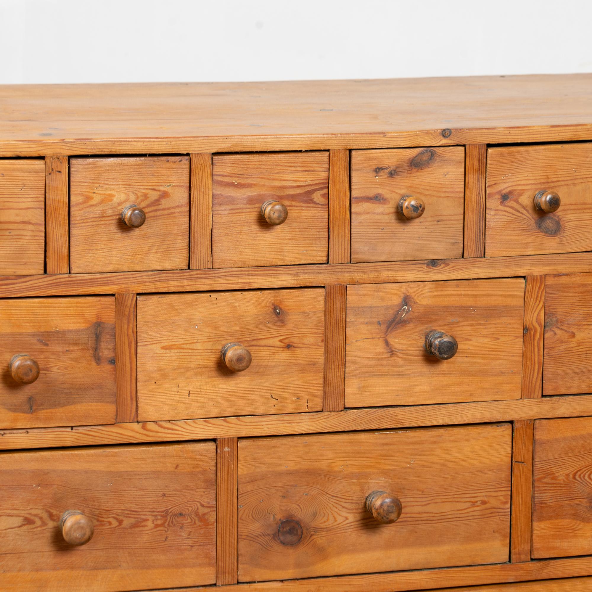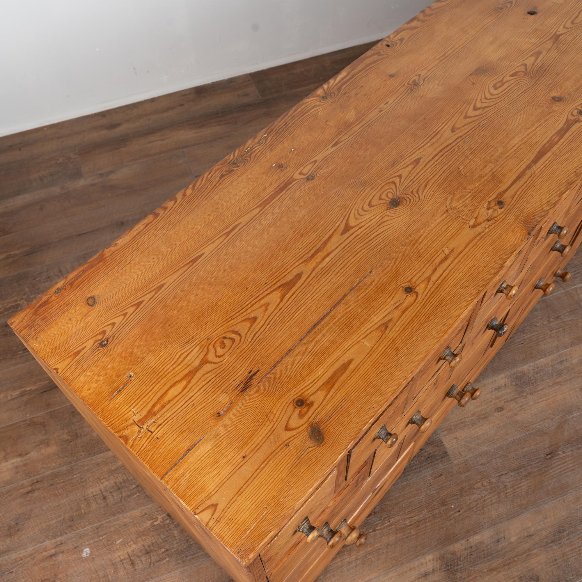 19th-century Swedish pine apothecary counter of impressive scale, featuring fifty-one drawers in varying sizes. Constructed with traditional dovetail joinery throughout, this substantial counter measures over ten feet in length, making it an unusually large and rare example. The pine top is built in two sections and shows stains, gouges, scratches, and evidence of old dried wormhole activity, all contributing to the warm, deeply aged patina. Some old knots in the wood have fallen out, creating small holes consistent with age and use. All drawers function smoothly. Restored strong, stable, and ready for use. Old repairs seen along back.