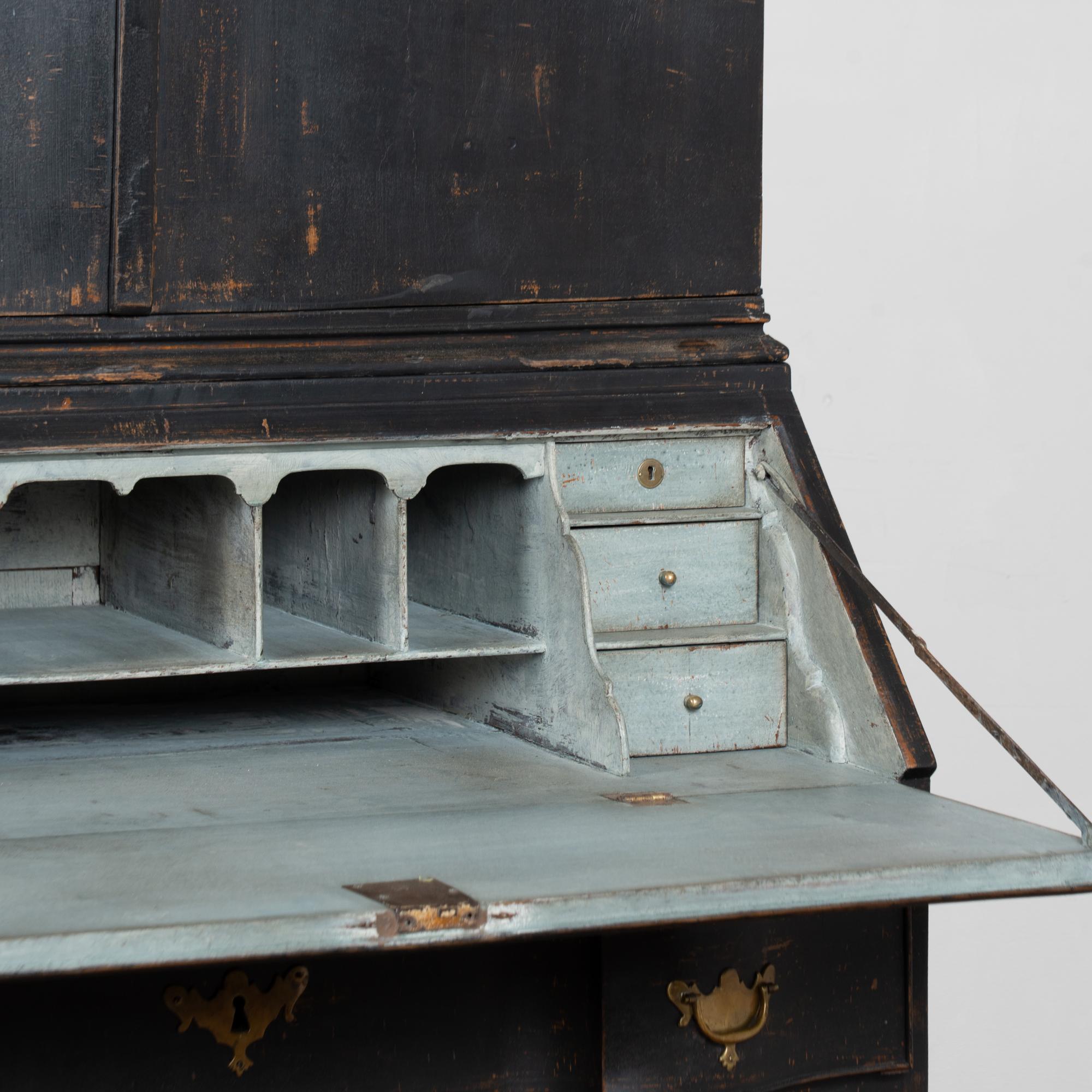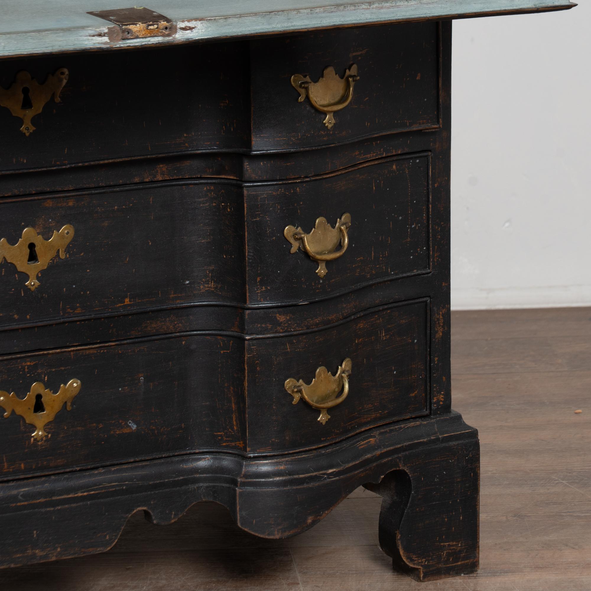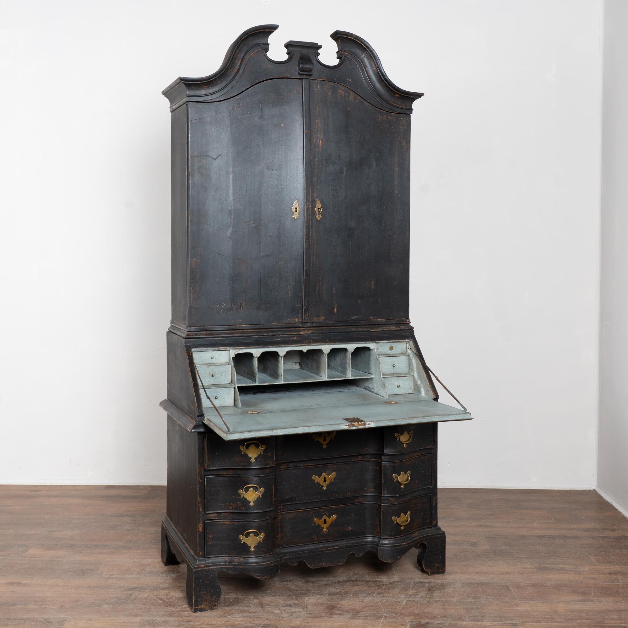 Late 18th-century Danish oak bureau or secretary featuring a newer professionally applied black layered painted finish, lightly distressed to reveal natural oak beneath and suit the age of the piece. The interior is painted a contrasting pale blue with gray undertones. The desktop opens on long hinges to reveal petite drawers and cubbies for storage and organization.
