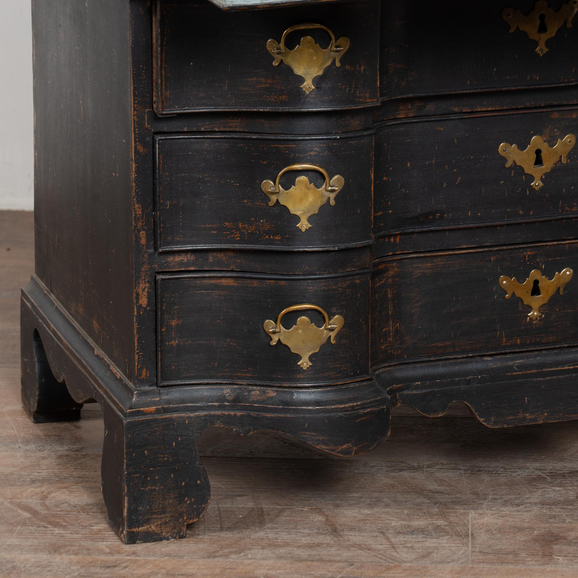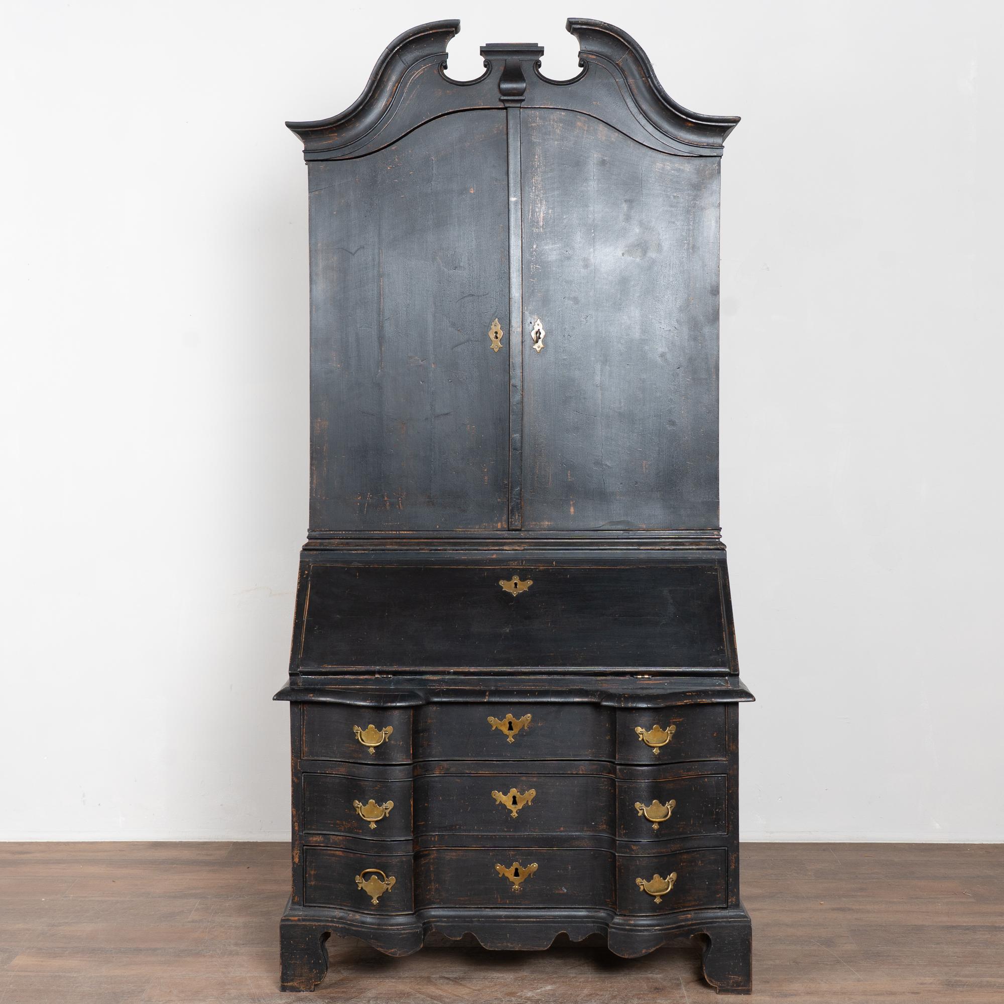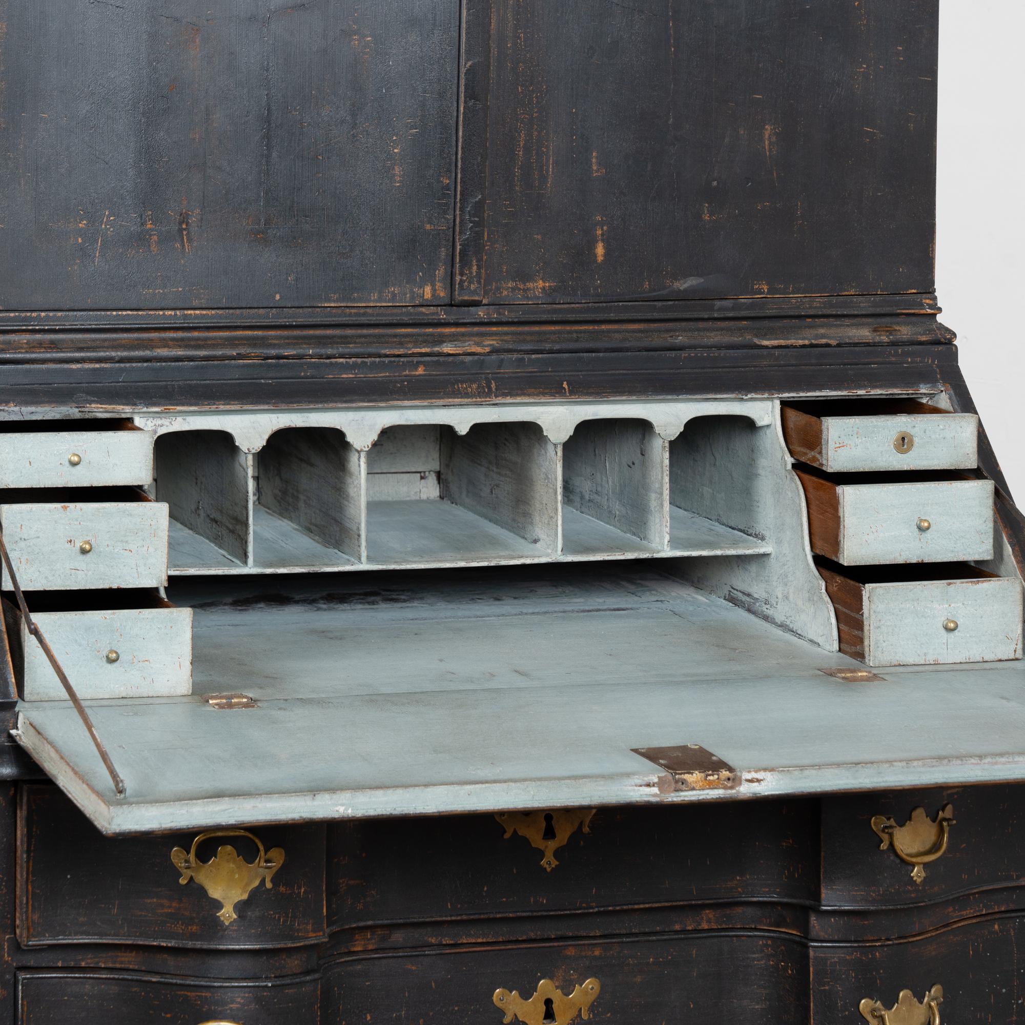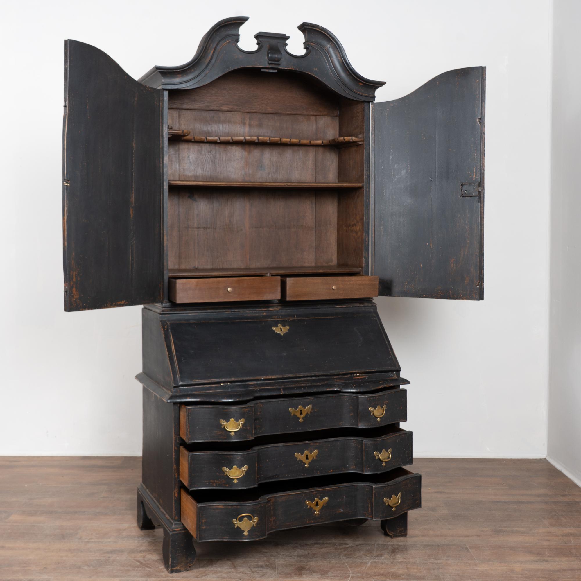 Late 18th-century Danish oak bureau or secretary featuring a newer professionally applied black layered painted finish, lightly distressed to reveal natural oak beneath and suit the age of the piece. The interior is painted a contrasting pale blue with gray undertones. The desktop opens on long hinges to reveal petite drawers and cubbies for storage and organization.