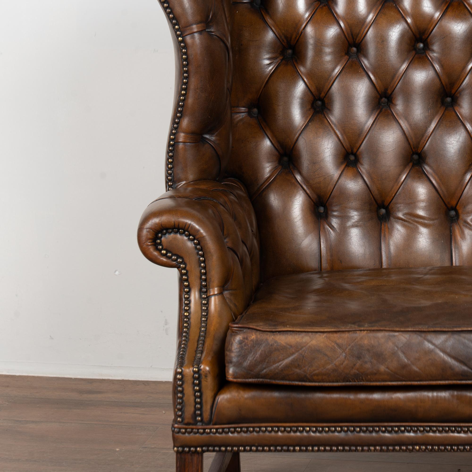 Vintage Chesterfield loveseat and matching club chair upholstered in rich brown leather with tufted button backs, wingback style, and rolled arms. Both pieces feature nail head trim throughout, enhancing their classic Chesterfield styling. The brown leather displays a warm, varied patina that shifts in tone depending on lighting, reflecting age and use. Visible wear includes creasing, staining, scratches, and scuffs, with an old repair noted on the right cushion of the loveseat.