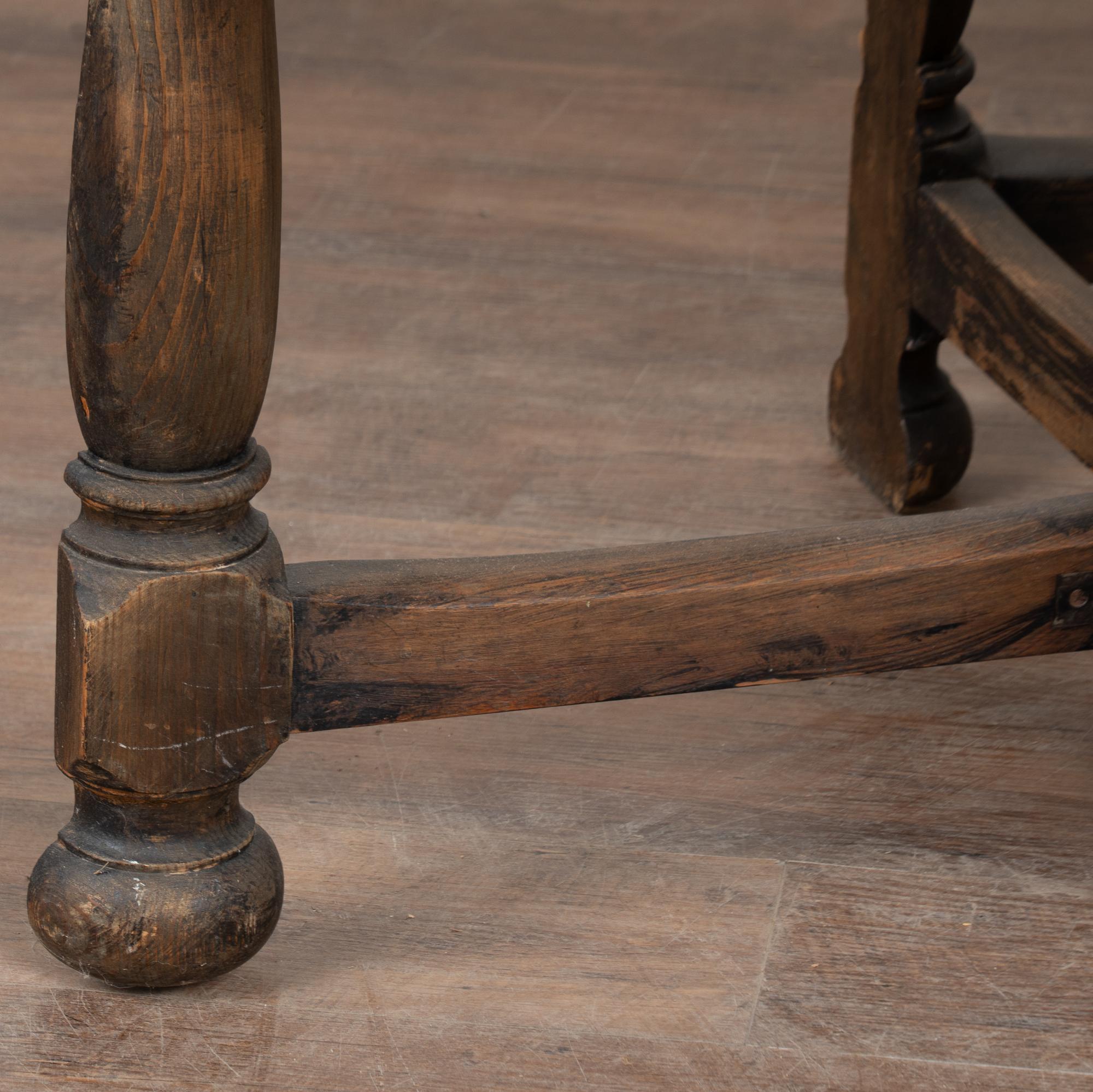 19th-century Swedish pine drop-leaf gate leg table with a versatile, functional design. The gate leg base allows the legs to adjust as the leaves are raised or lowered. A single drawer is present on each end. The pine top shows a rich aged patina with visible cracks, stains, nicks, and old repairs. The base was painted black at some point in time and now shows significant wear and fading, contributing to the table’s character. With both leaves down, the table serves well as a 25.5" deep console ; fully opened, it functions comfortably as a kitchen or dining table just under 6' long. Restored strong, stable, and ready to use.