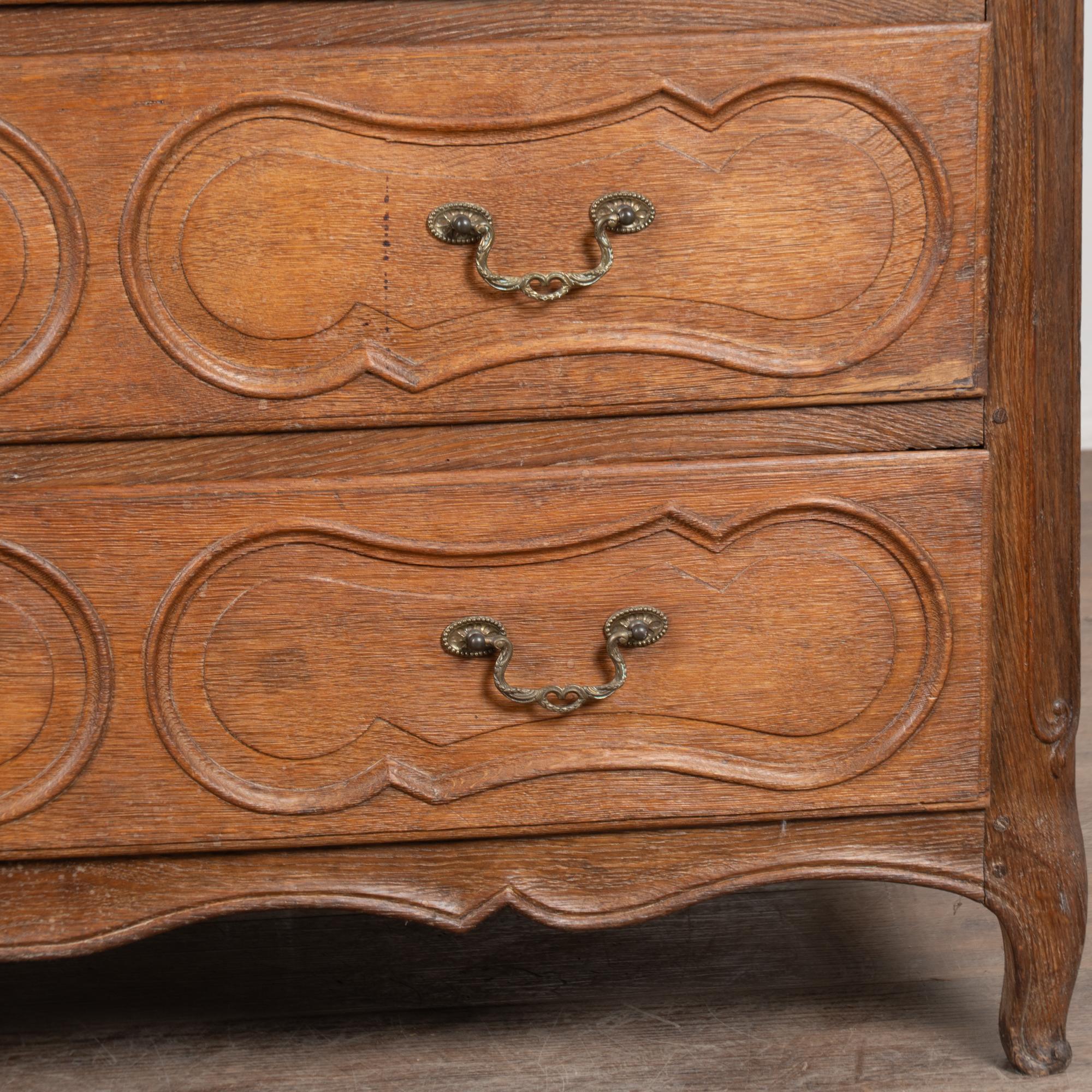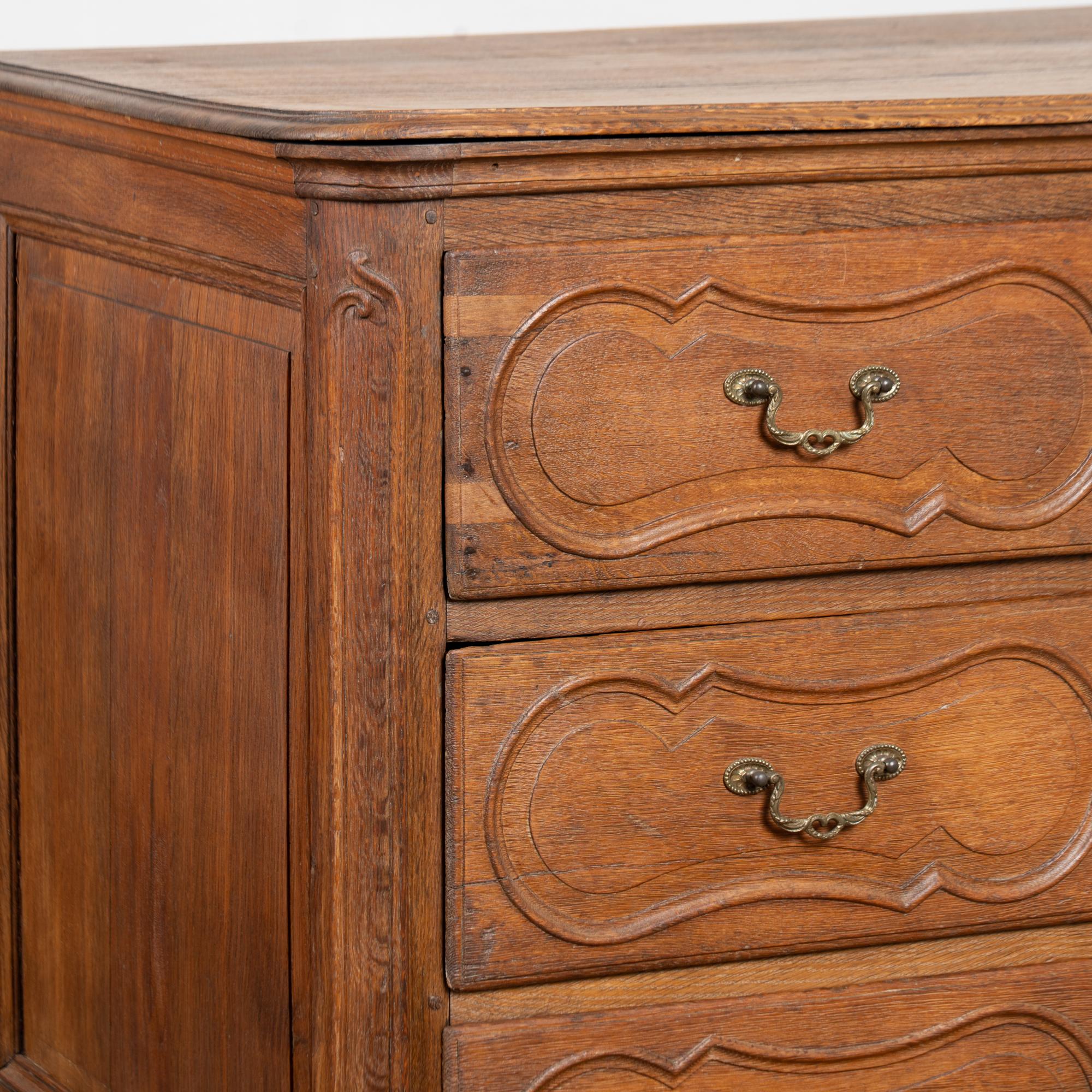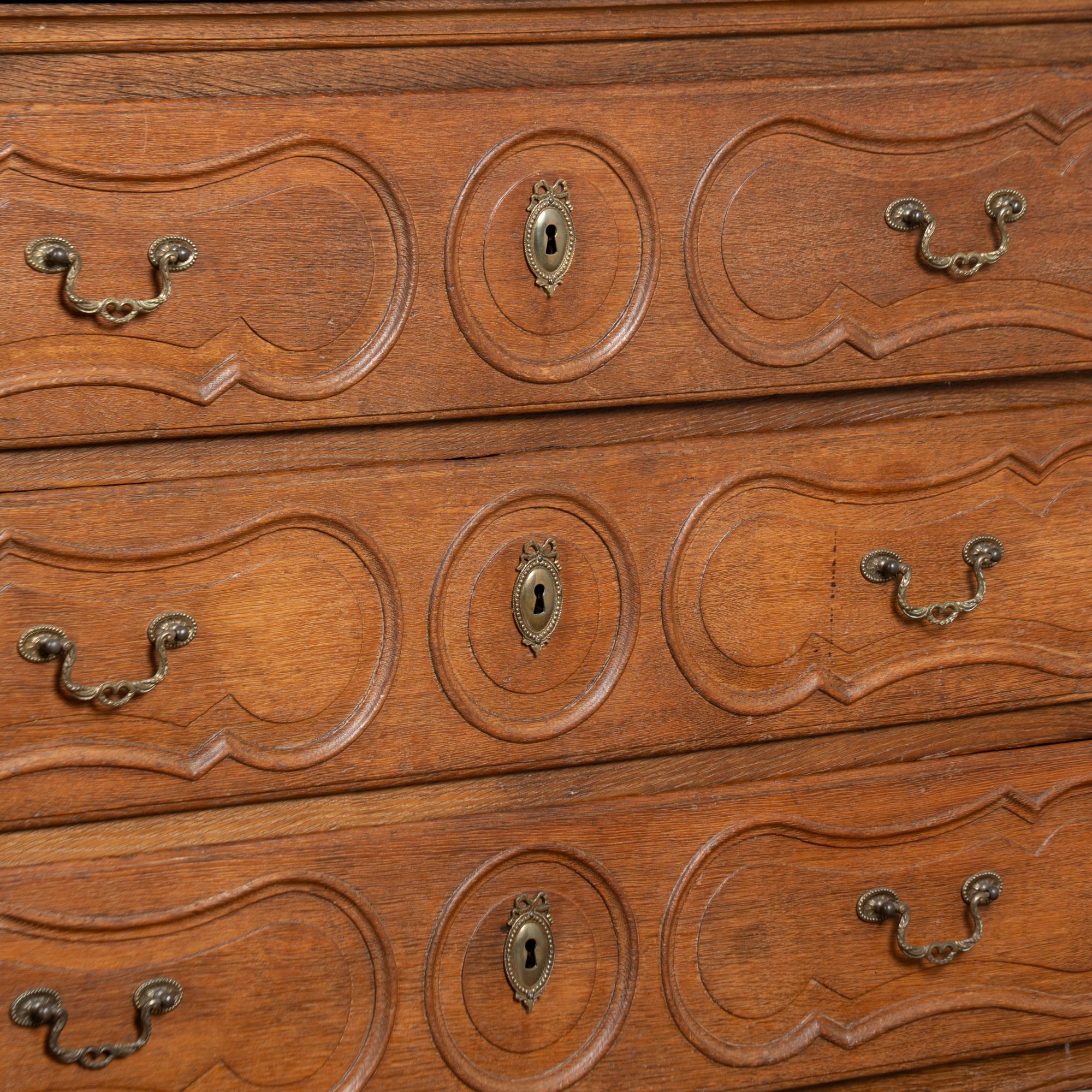 Late 18th-century French oak chest of three drawers featuring decorative paneled drawer fronts and curved canted sides with subtle detailing. The chest rests on cabriole feet that show visible wear from centuries of use. The oak top displays old repaired cracks, scratches, stains, and nicks, while the sides and back show typical age-related cracking and separation common to oak furniture of this period. Interior drawer bottoms also show age-related separation and cracks. The carved panels lend a romantic French character to the piece. Restored strong and stable, this chest is ready for use and enjoyment.