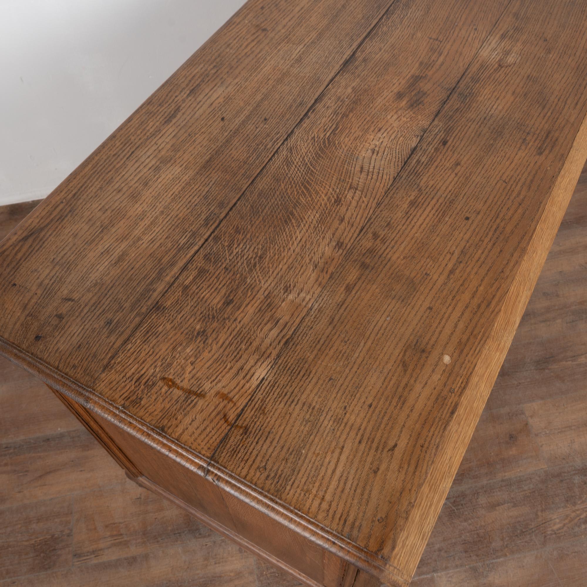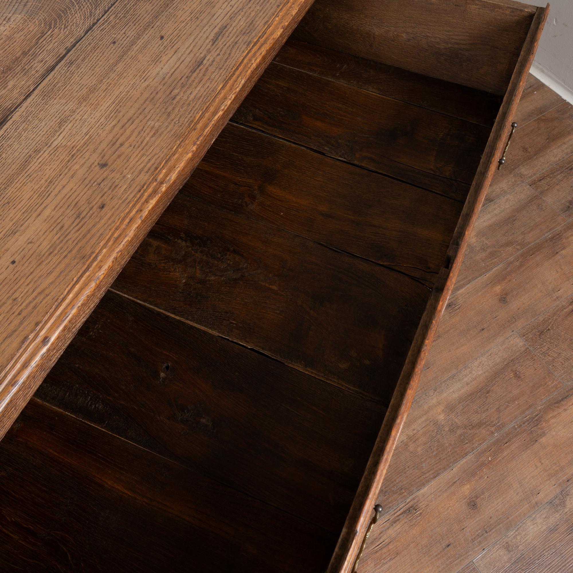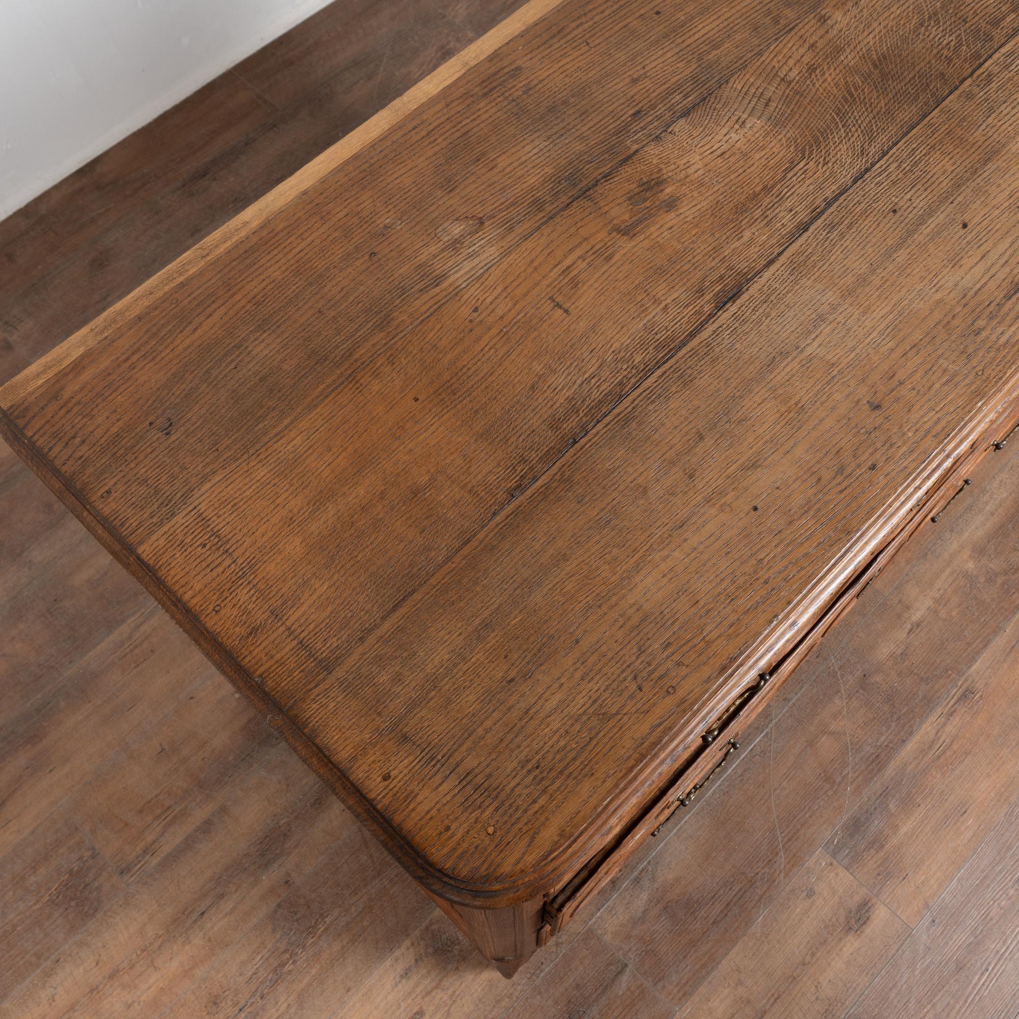 Late 18th-century French oak chest of three drawers featuring decorative paneled drawer fronts and curved canted sides with subtle detailing. The chest rests on cabriole feet that show visible wear from centuries of use. The oak top displays old repaired cracks, scratches, stains, and nicks, while the sides and back show typical age-related cracking and separation common to oak furniture of this period. Interior drawer bottoms also show age-related separation and cracks. The carved panels lend a romantic French character to the piece. Restored strong and stable, this chest is ready for use and enjoyment.