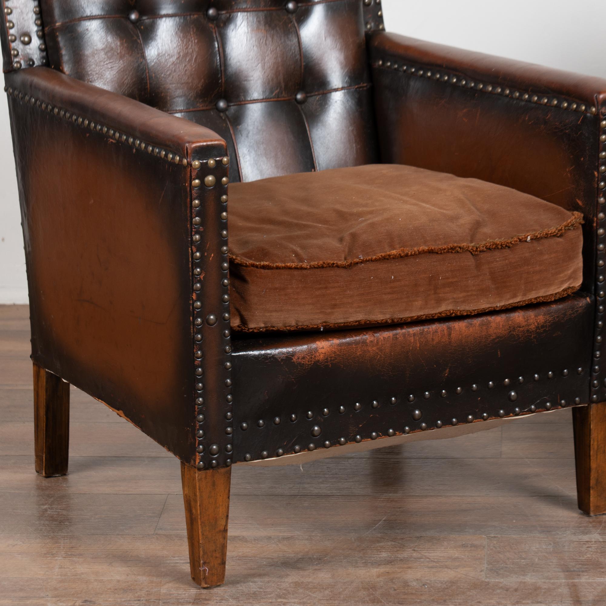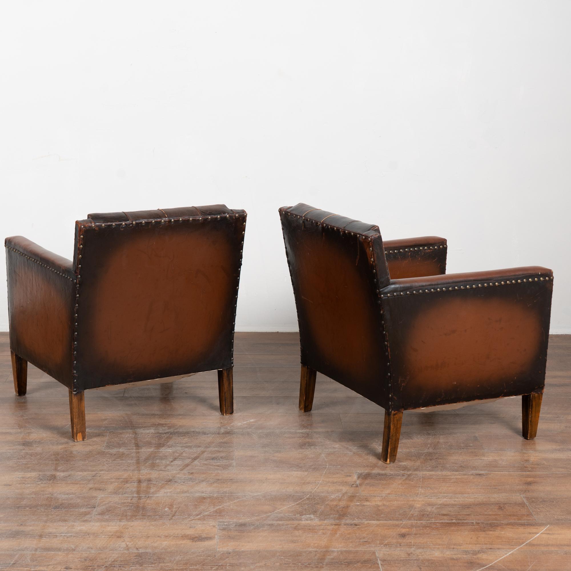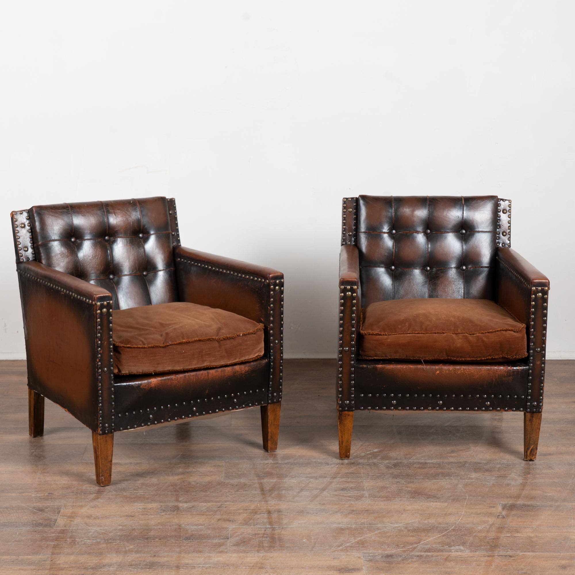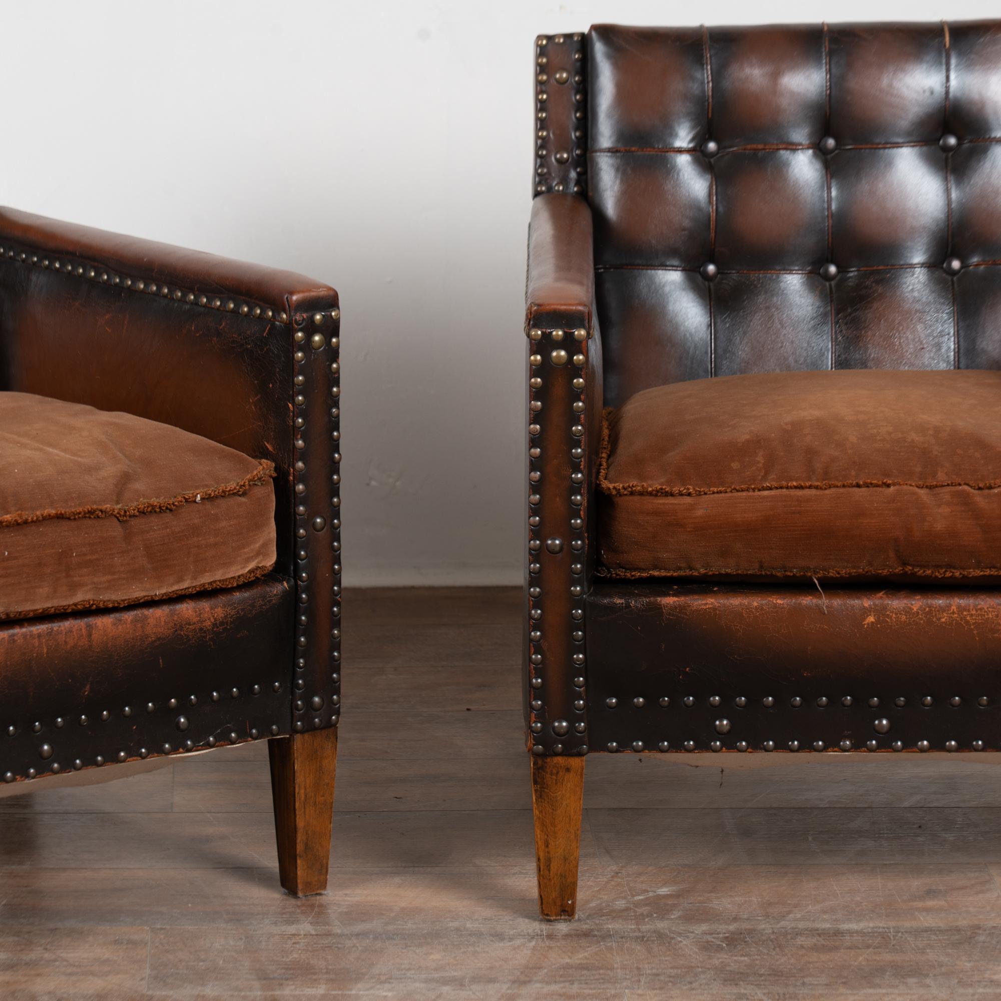 20th century pair of vintage leather club chairs featuring button-tufted backs, decorative nailhead trim, and self-piped upholstery. The chairs sit low and have a relaxed, somewhat square profile. The leather shows extensive age-related wear, including crackling, abrasions, and surface distress, with areas where piping is fully exposed from years of use. Seat cushions are heavily worn and will likely be replaced by the buyer. Hardwood feet show nicks and distress, with a notable gouge on the rear left leg of one chair. Despite the wear, the chairs retain strong structure and exceptional character, making them ideal for those seeking authentic vintage presence. Sold in original vintage condition.