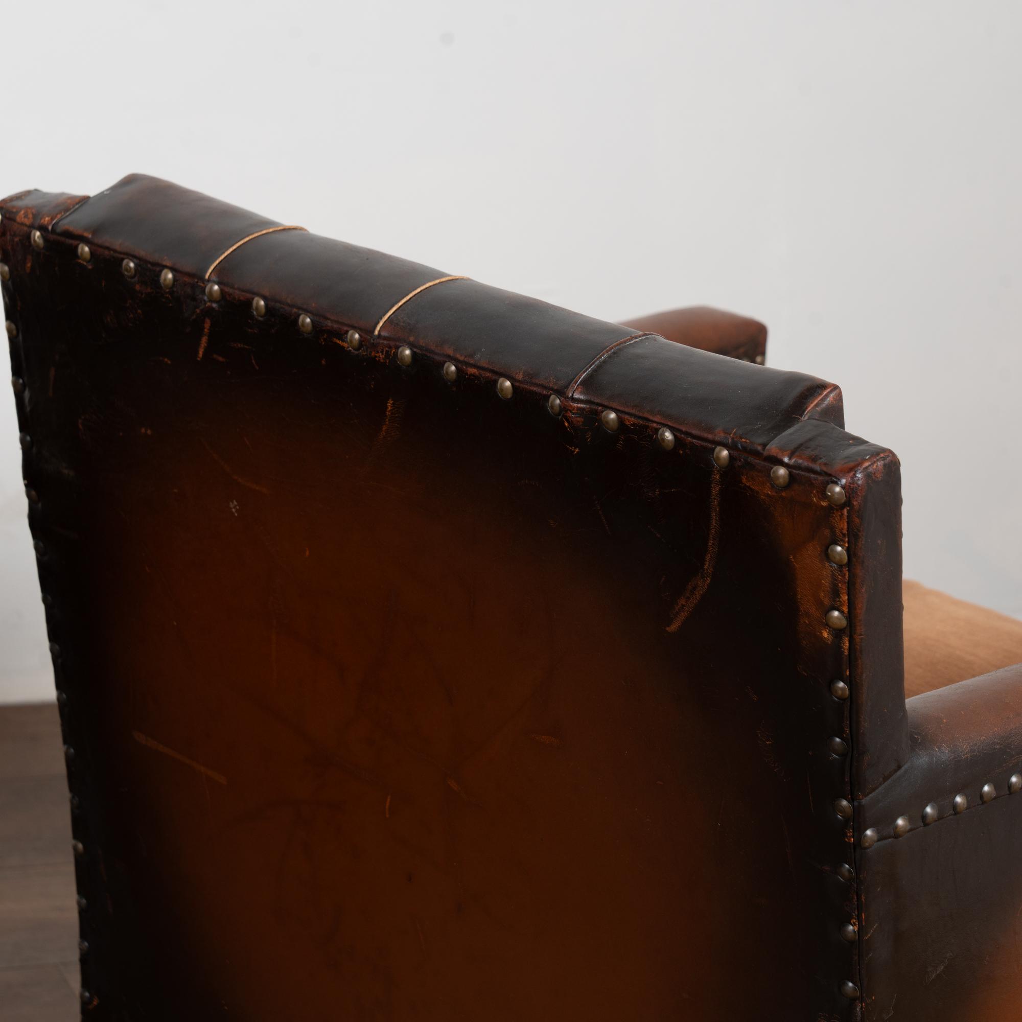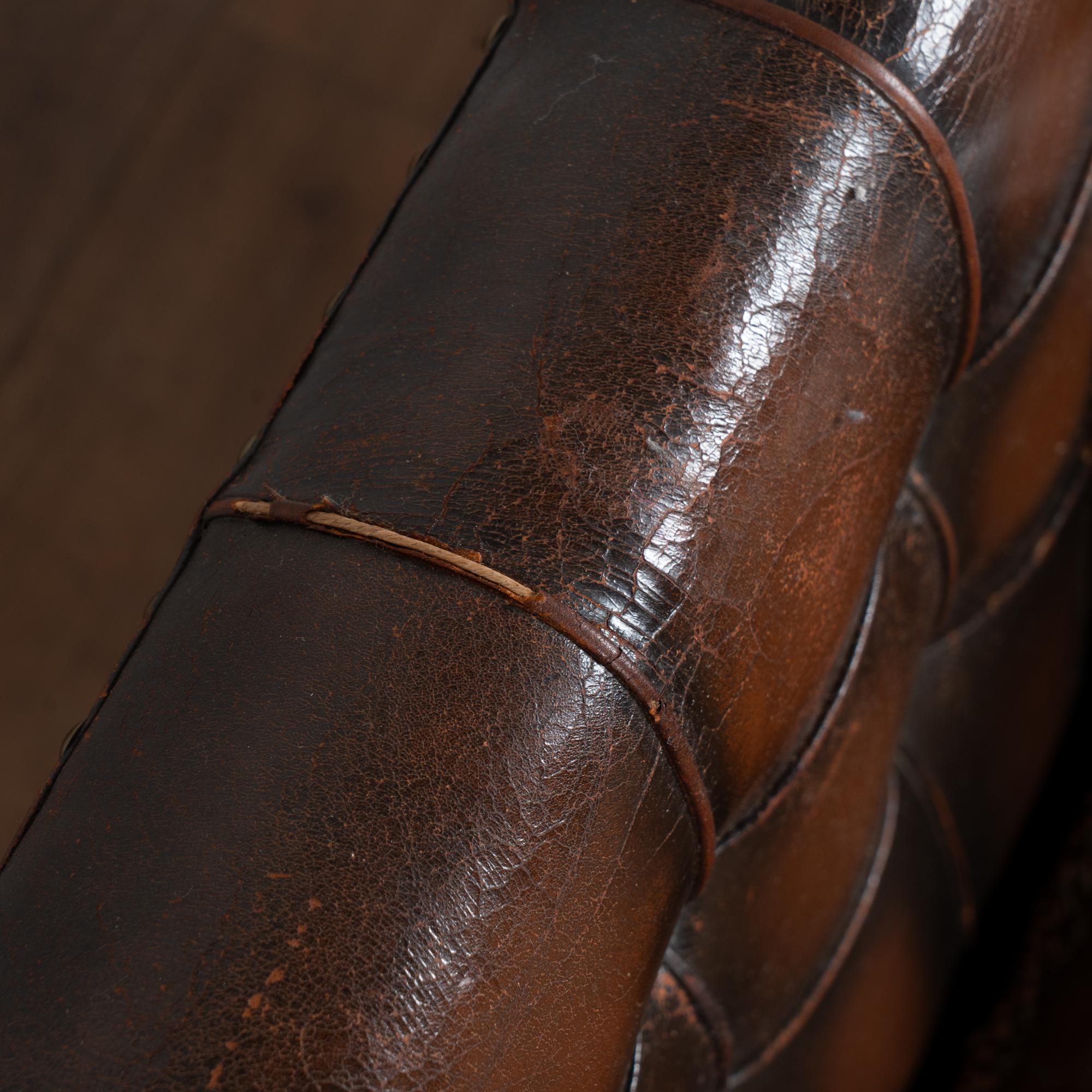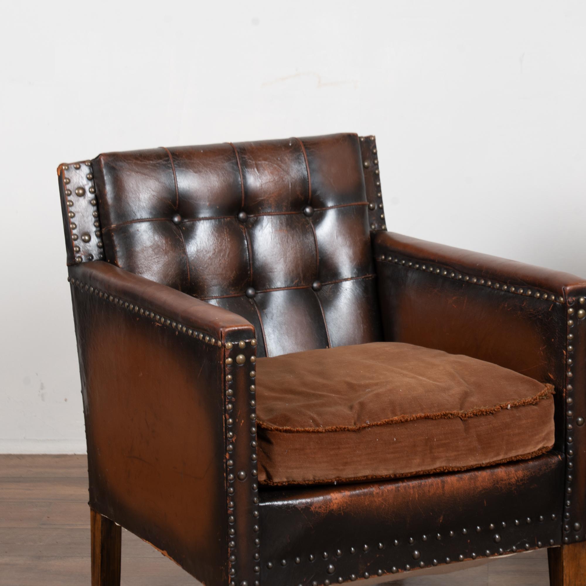 20th century pair of vintage leather club chairs featuring button-tufted backs, decorative nailhead trim, and self-piped upholstery. The chairs sit low and have a relaxed, somewhat square profile. The leather shows extensive age-related wear, including crackling, abrasions, and surface distress, with areas where piping is fully exposed from years of use. Seat cushions are heavily worn and will likely be replaced by the buyer. Hardwood feet show nicks and distress, with a notable gouge on the rear left leg of one chair. Despite the wear, the chairs retain strong structure and exceptional character, making them ideal for those seeking authentic vintage presence. Sold in original vintage condition.