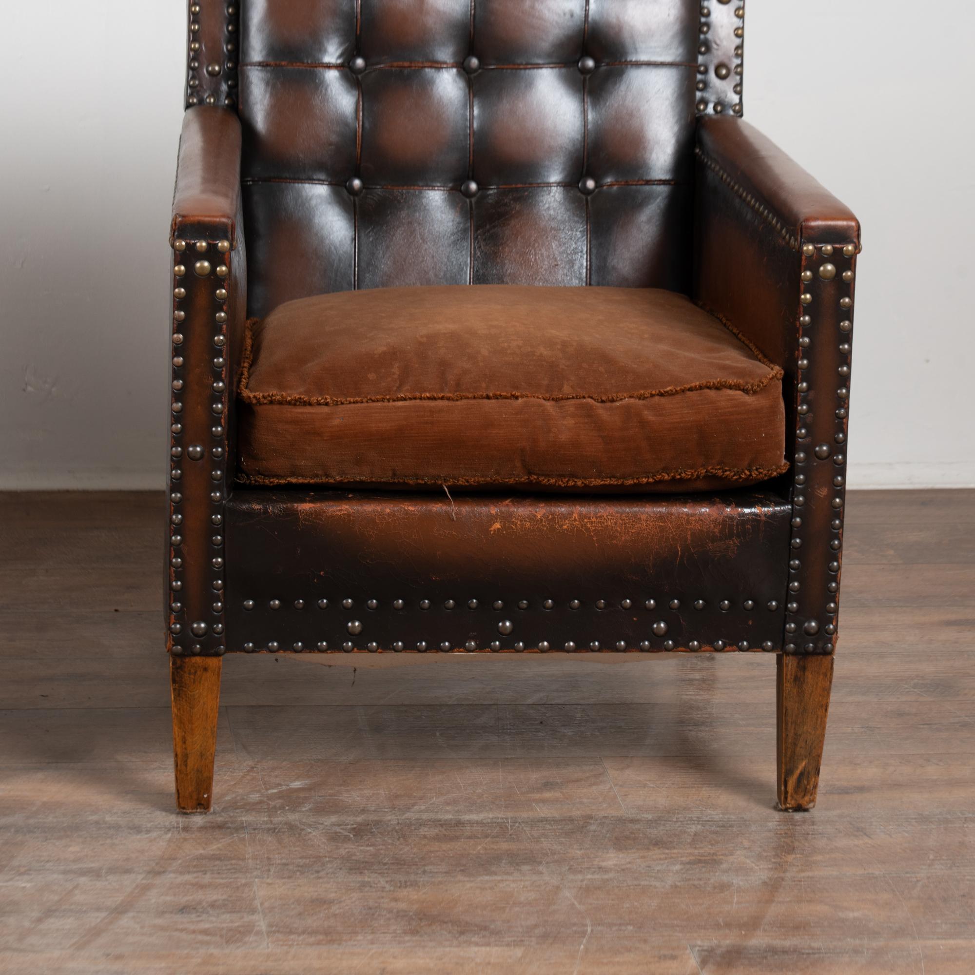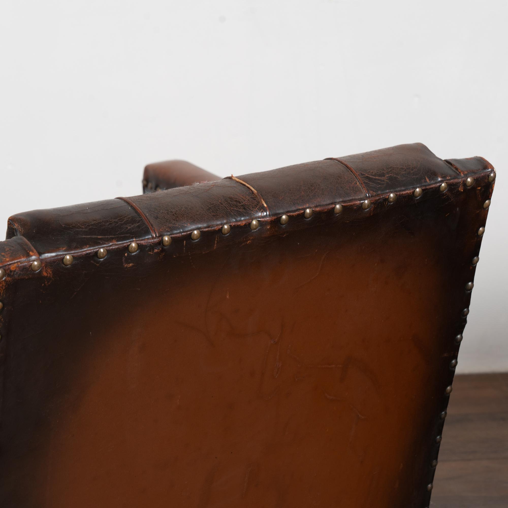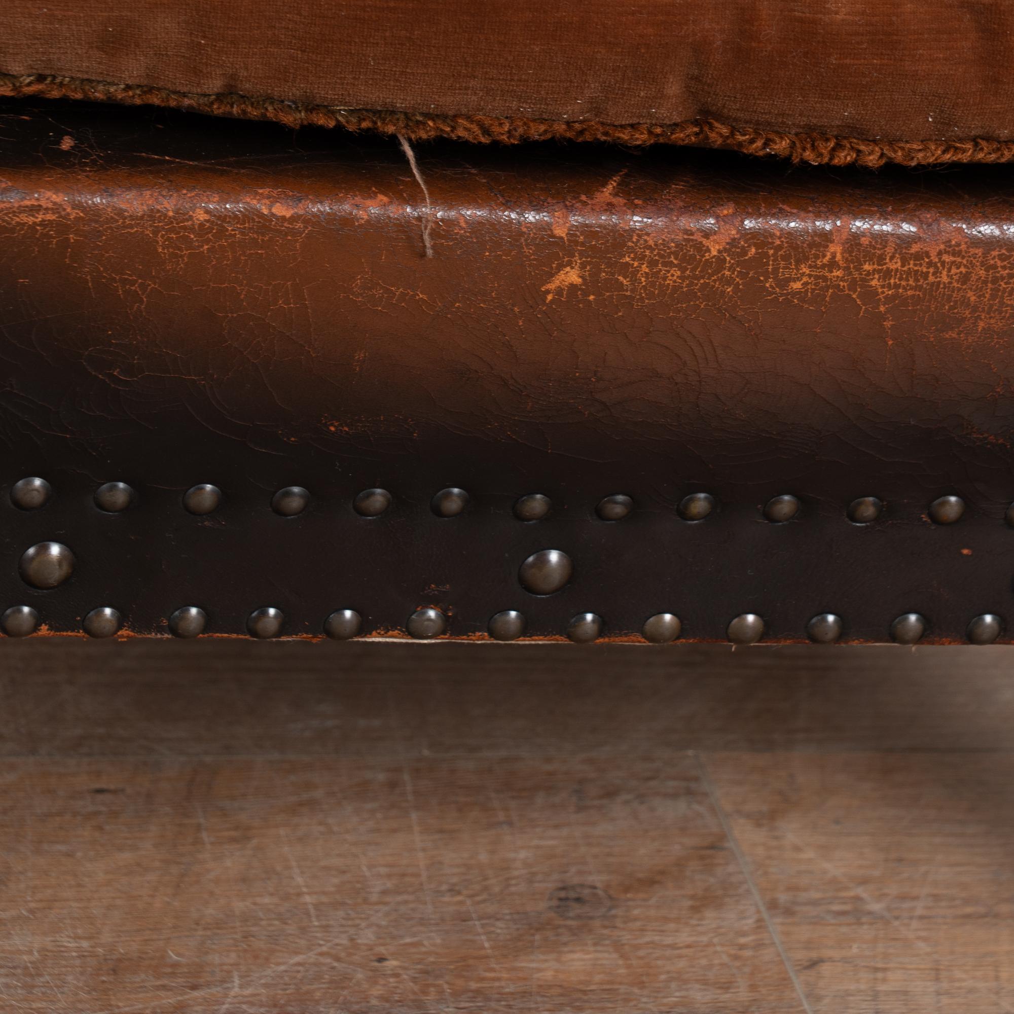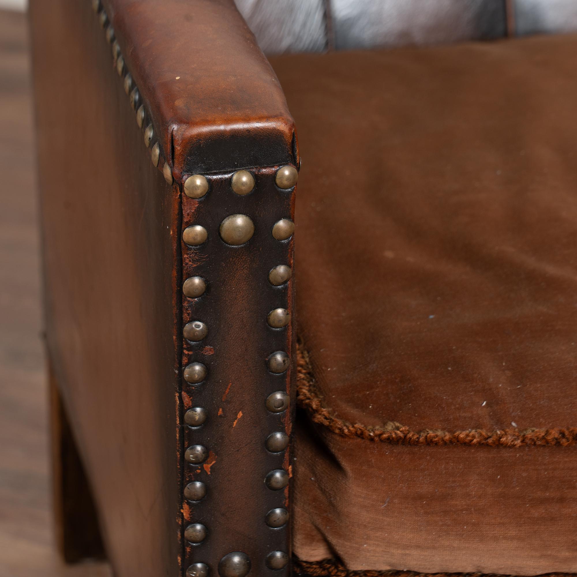 20th century pair of vintage leather club chairs featuring button-tufted backs, decorative nailhead trim, and self-piped upholstery. The chairs sit low and have a relaxed, somewhat square profile. The leather shows extensive age-related wear, including crackling, abrasions, and surface distress, with areas where piping is fully exposed from years of use. Seat cushions are heavily worn and will likely be replaced by the buyer. Hardwood feet show nicks and distress, with a notable gouge on the rear left leg of one chair. Despite the wear, the chairs retain strong structure and exceptional character, making them ideal for those seeking authentic vintage presence. Sold in original vintage condition.