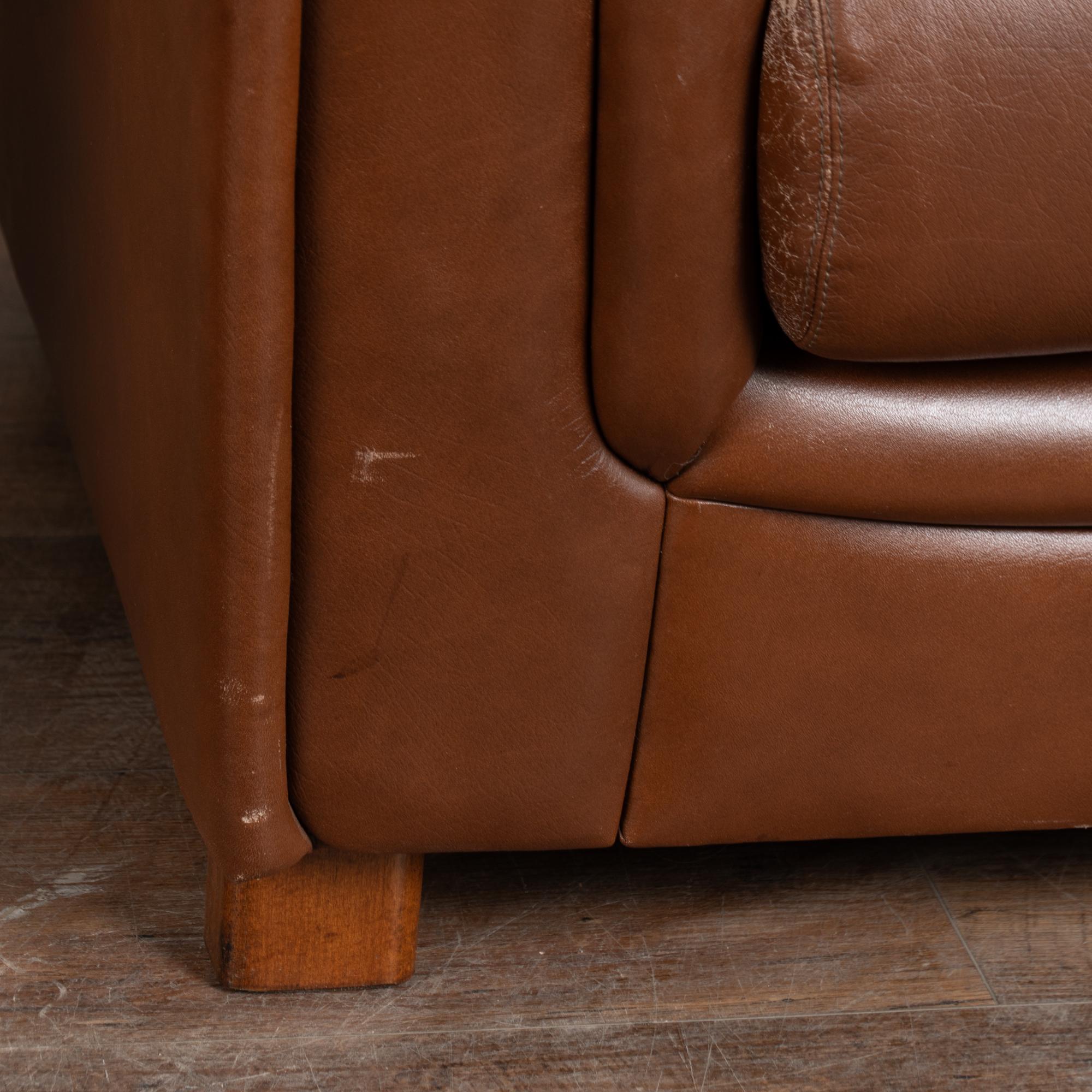 Pair of English club chairs upholstered in vintage brown leather. Each chair features a tufted button back, rolled arms, and self-piped upholstery. The seating is comfortable, with zipper-enclosed cushions, and all buttons remain intact. The leather exhibits typical age-related wear, including crackling, abrasions, and surface distress that contribute to its authentic vintage character. Hardwood feet show scuffs and wear consistent with use, and some impression from the leather is visible. These chairs are sold in comfortable vintage condition and offer a classic, inviting silhouette suitable for everyday living.