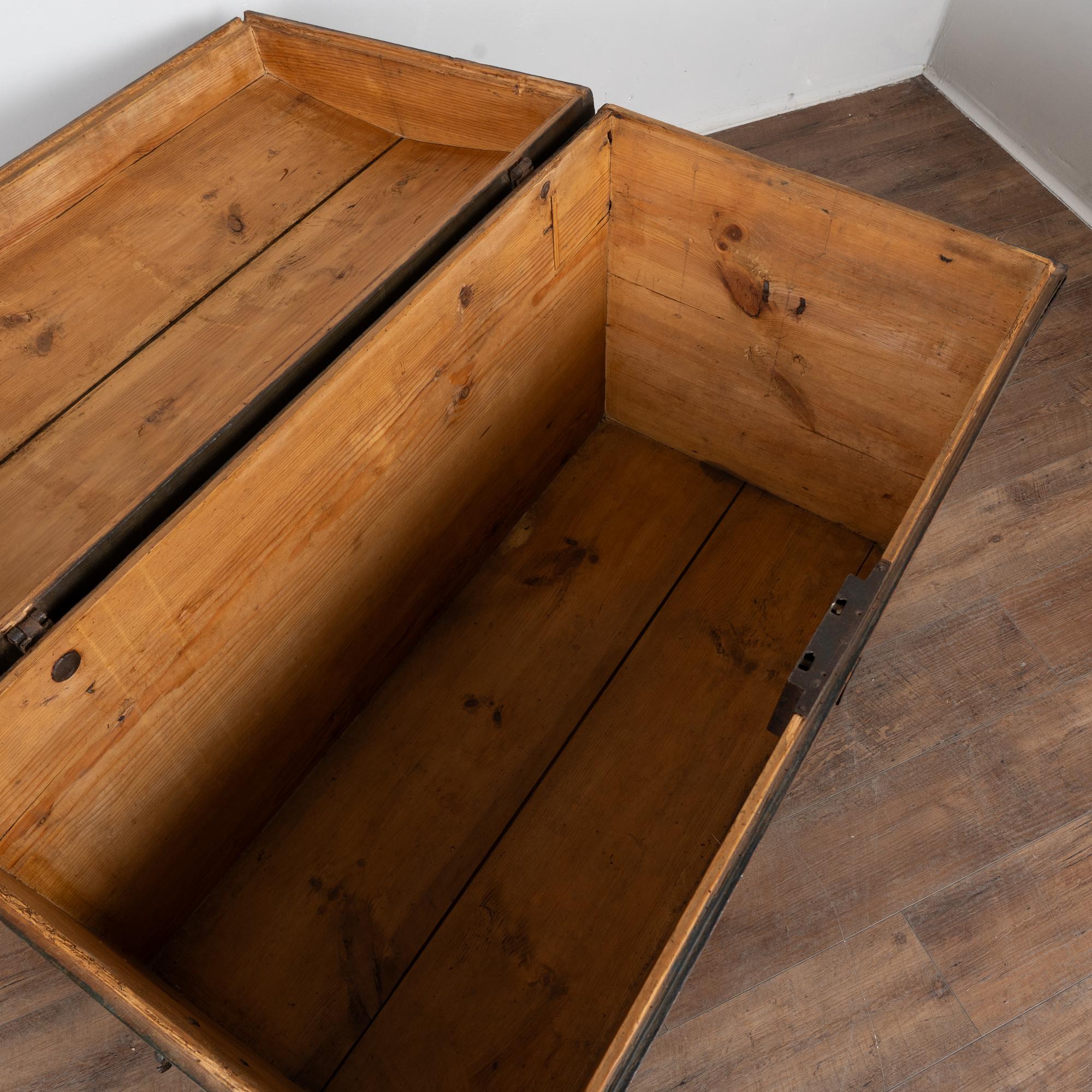 Constructed with large dovetail joinery and fitted with heavy wrought iron side handles, long strap hinges, and reinforced iron corner elements. The trunk is raised on simple feet. Two age-related separations are visible along the top, typical of dome-top trunks from this period; the iron straps hold the structure firmly in place. A similar horizontal separation is visible along the front panel.