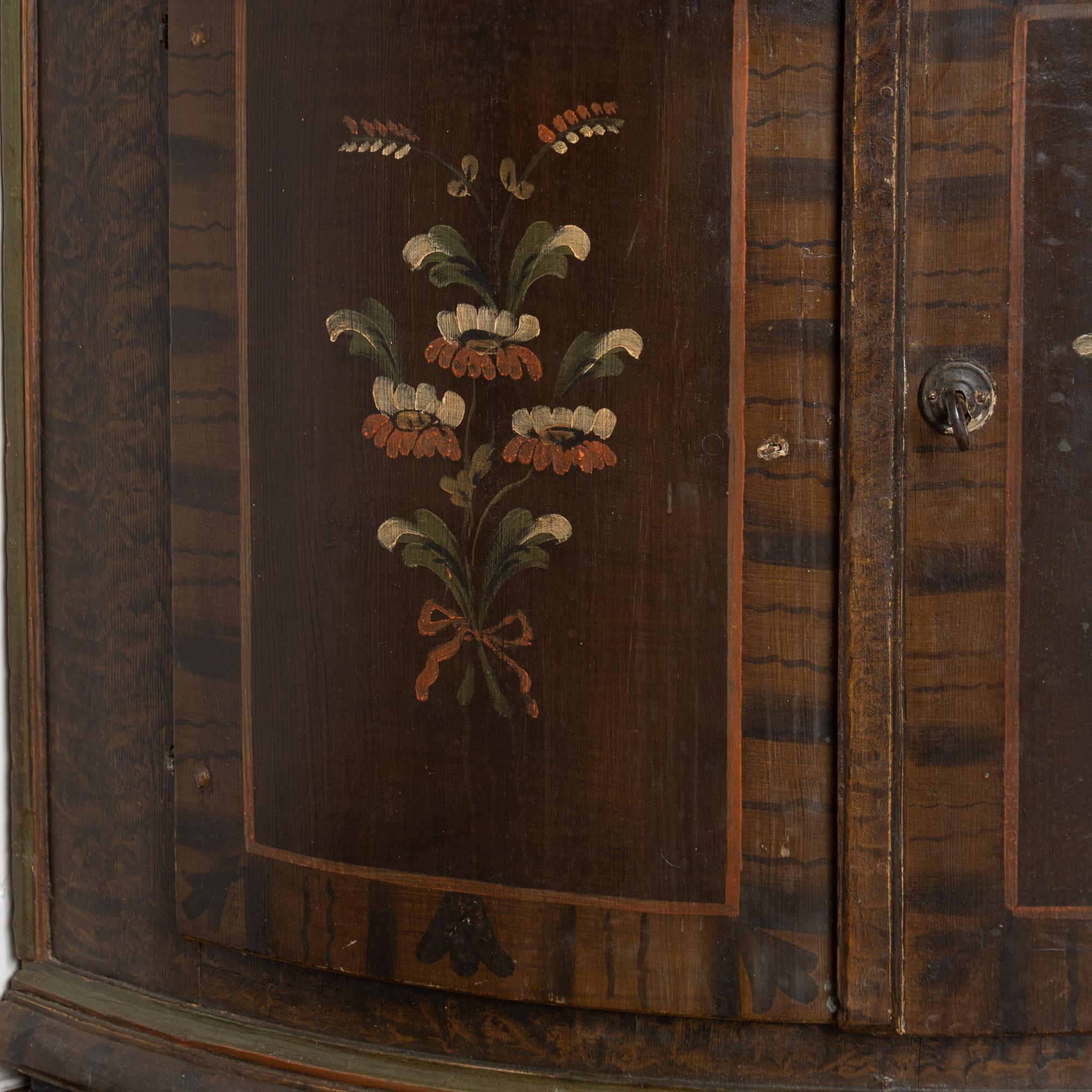Original 19th-century Swedish pine corner cabinet dated 1846, featuring its original hand-painted folk art finish. The exterior displays a traditional faux wood brown painted background typical of the era, with bowfront cabinet doors and painted floral bouquets centered within each of the four front panels. The upper right interior door retains painted monograms and the date of 1846, adding historical significance.