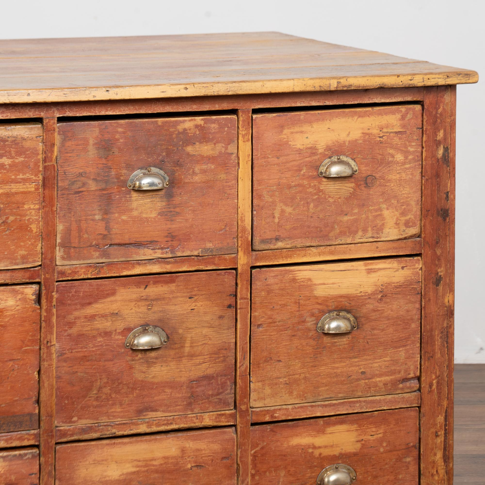 19th century Danish pine apothecary sideboard with twelve drawers. Constructed of pine with its original painted finish, now highly distressed, revealing the pine beneath. To the naked eye, the surface reads as brown with subtle reddish undertones. Designed as a freestanding counter, the form allows for versatile placement and could function well as a kitchen island. The top two center drawers feature divided interiors. The top shows evidence of extensive use, including gouges, scratches, cracks, and heavy surface wear, with similar distress visible across the drawer fronts. Age-related plank separation is present along the sides. The back reveals old repairs and signs of historic wormhole activity. The piece has been restored, is structurally strong, stable, and ready for use.