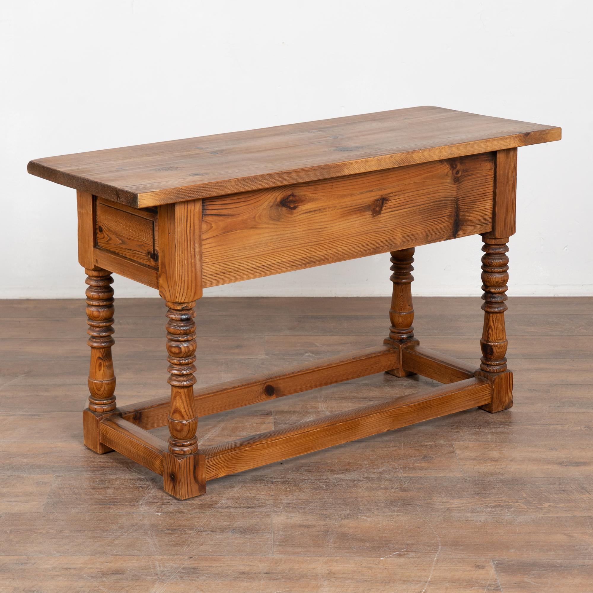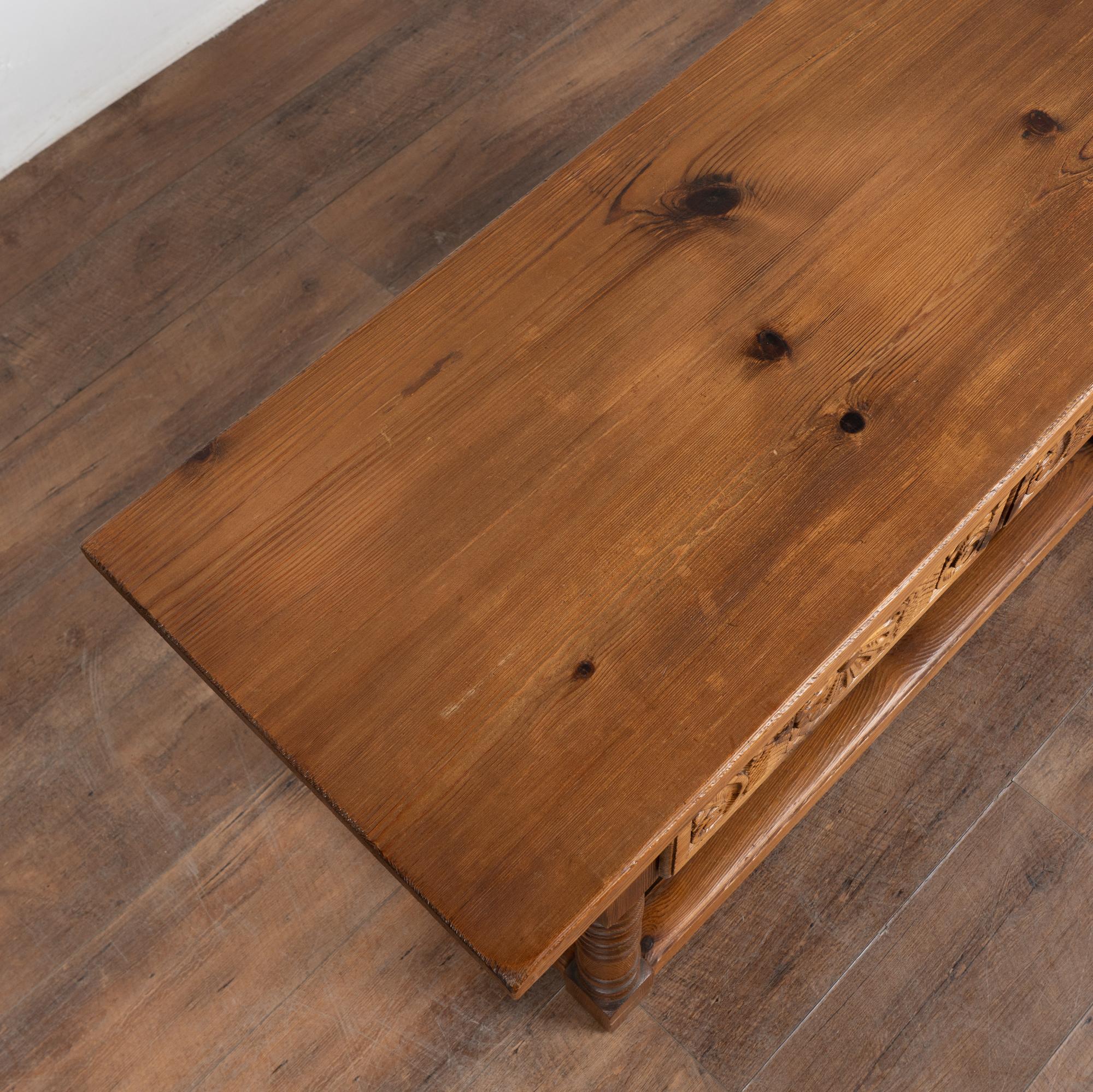 20th century Swedish small console side table constructed of mixed woods, including pine and oak. The table features two highly carved drawers (without pulls) and rests on distinctive turned legs joined by a rectangular stretcher base. Decorative carving on the drawer fronts and the attractive legs provide visual interest despite the compact scale. The top shows surface wear consistent with age and use, including scratches, stains, dark knots in the wood, and cracks. The piece has been restored, is structurally strong, stable, and ready for use.