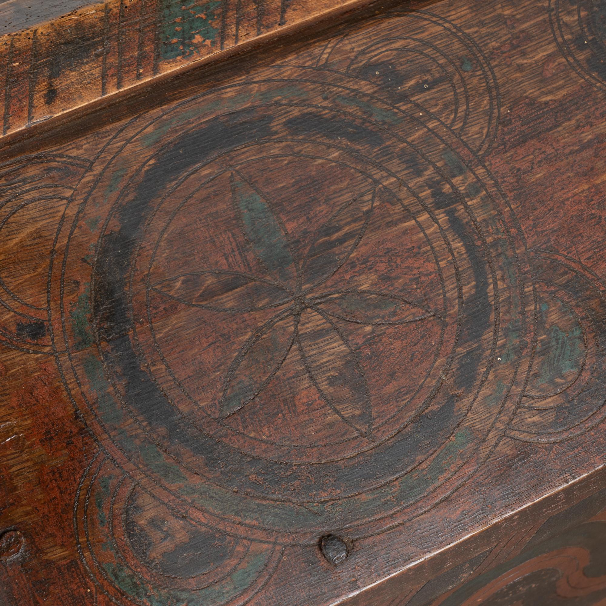 19th century painted and carved rustic Hungarian dome top trunk. Constructed primarily of pine with original painted and carved decoration. The exterior features geometric carving with circular medallion motifs and additional carved elements, with a crisscross lattice carving along the sides. The painted surface presents a brick-toned reddish background with remaining traces of teal blue and dark green. The domed top form is traditional to Eastern European examples. A wrought iron latch allowed the trunk to be locked for security. The trunk stands on legs showing surface wear, scratches, cracks and old, dried wormhole activity. The back is marked with monogram "K I” and dated 1903. The interior has been cleaned and waxed; old repair evident in top. The piece has been restored and is structurally strong, stable, and ready for use.