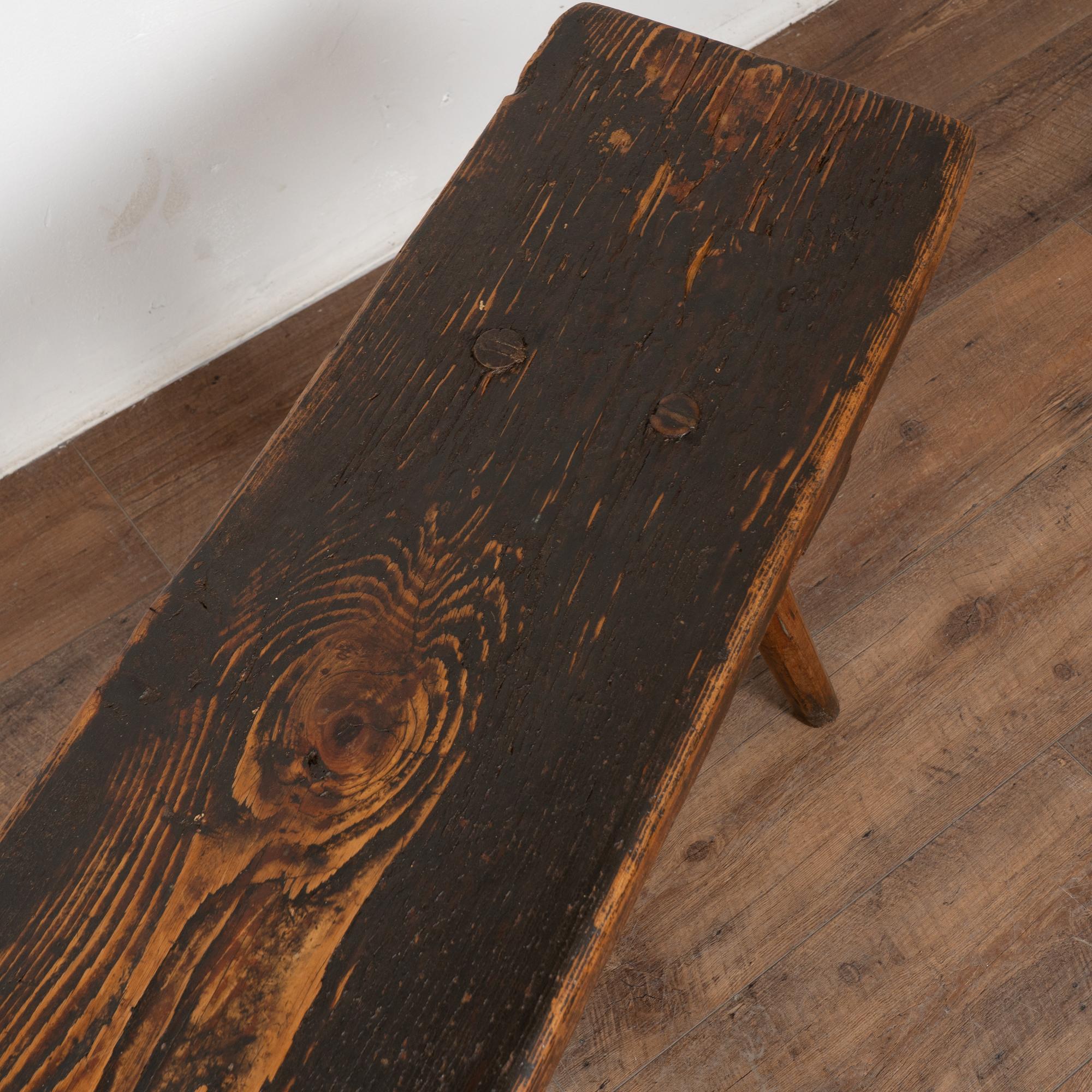 Rustic plank top bench with splay peg legs. Residual dark brown paint still evident, with minor red undertones.
