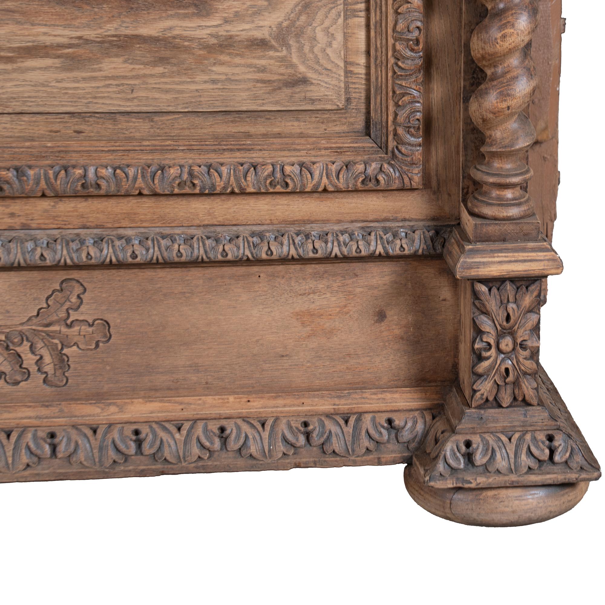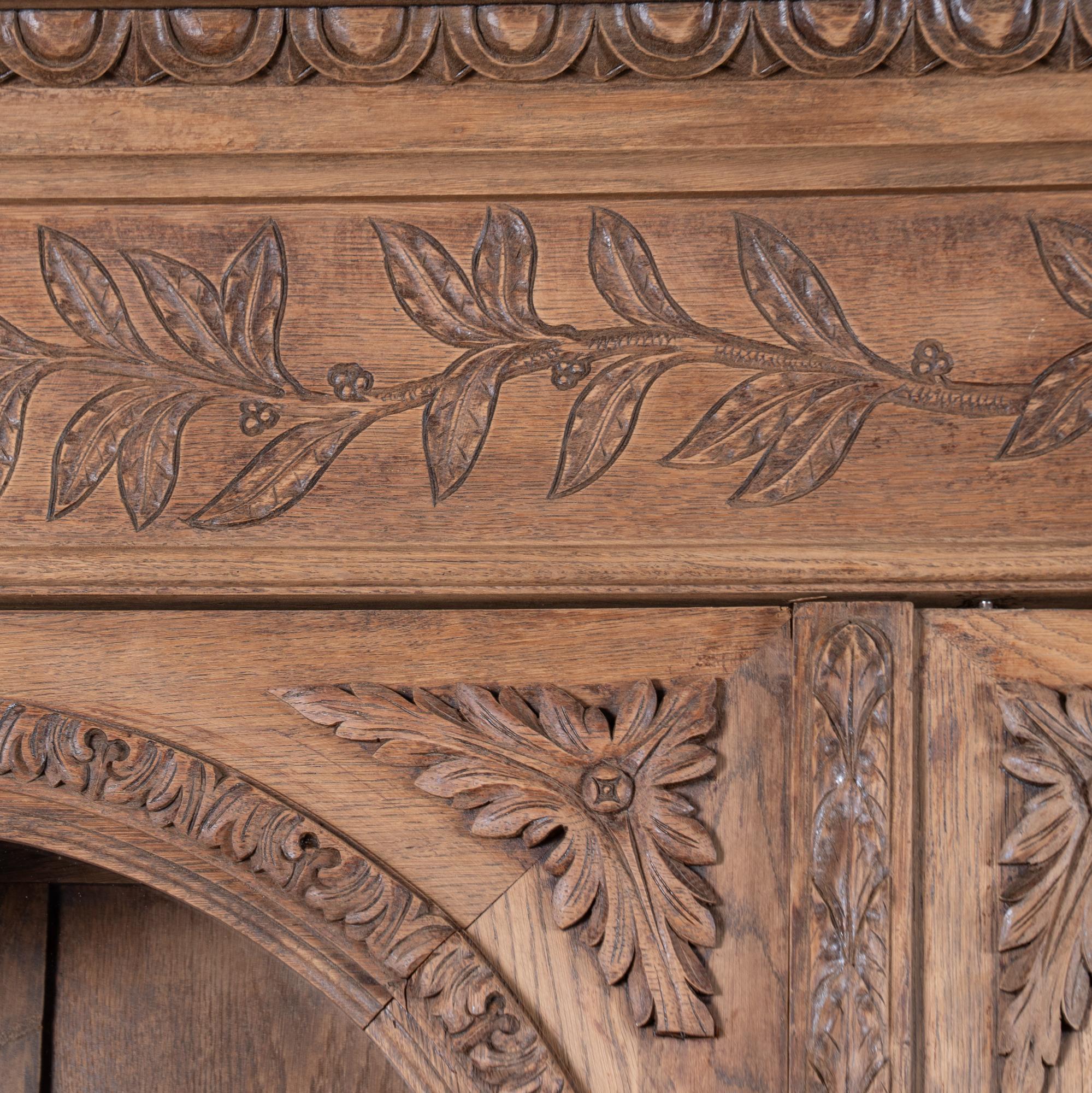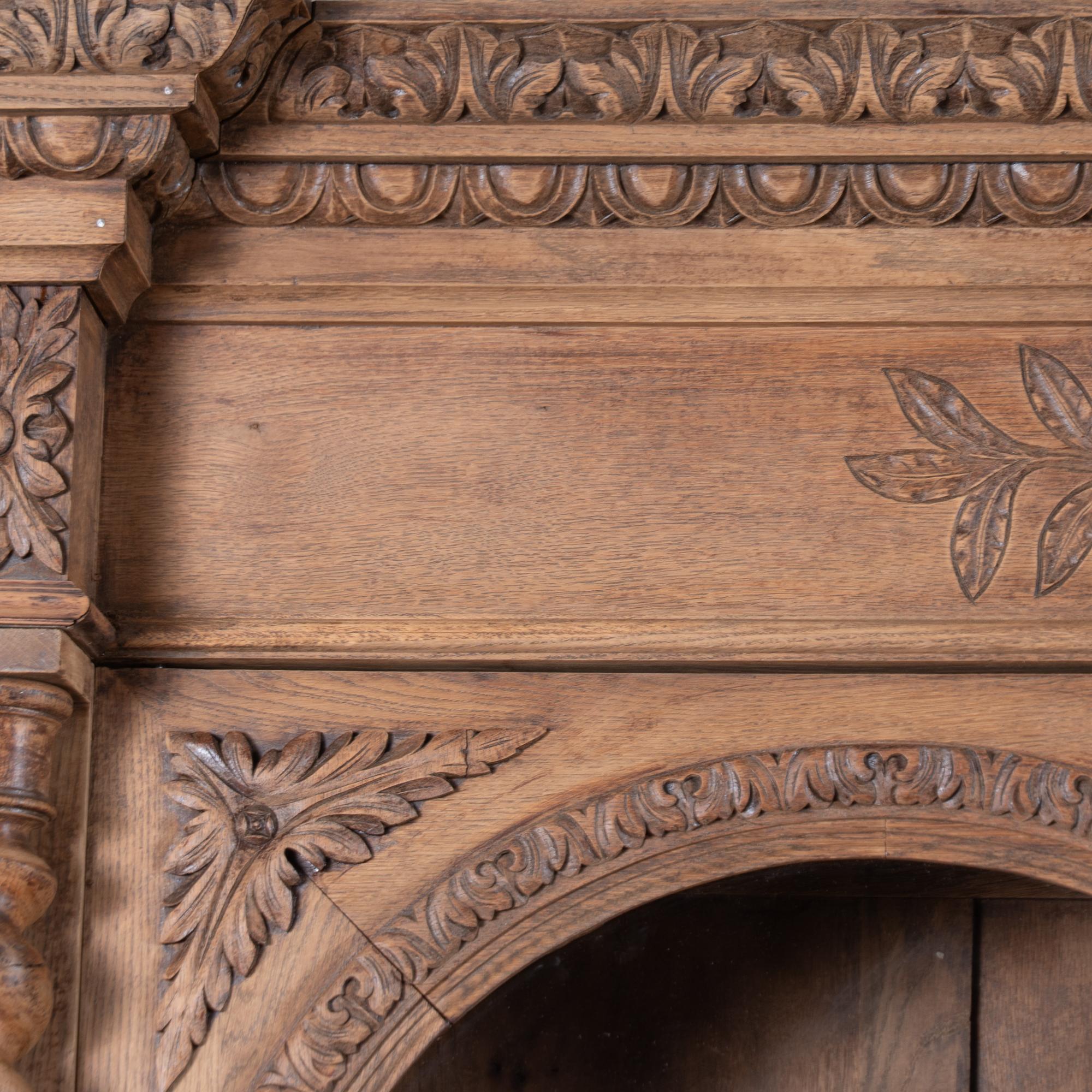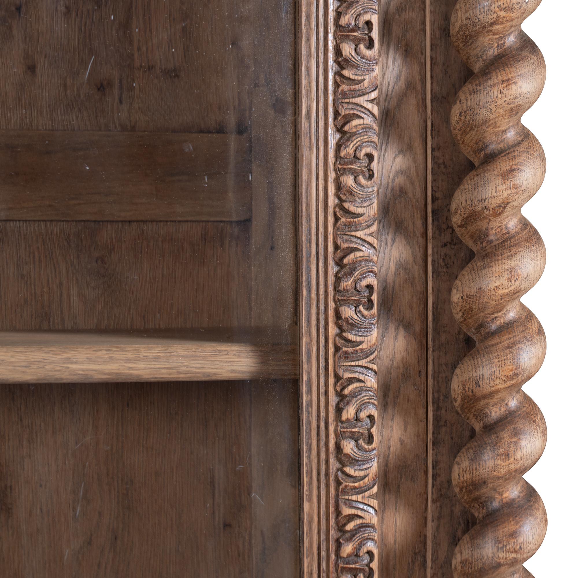 19th-century large French bookcase crafted in bleached French oak. This impressive display cabinet features extensive hand-carved detail throughout, including vine and acanthus-style motifs, a carved shield or medallion centered at the upper crown, and dramatic barley twist columns flanking both sides. Four arched glass panel doors allow for expansive display, with traditional adjustable shelving inside to accommodate books or collections. The cabinet is massive in scale and was originally constructed in multiple sections, including sides, back, doors, crown, and base, allowing for easier transportation and installation. Raised on large front bun feet, the crown and overall silhouette are bold and architectural. Traditional long French interior locks no longer function smoothly; keys are best used as pulls only. Typical age-related separation at joints and corners is present, along with scratches, nicks, cracks, and minor evidence of old wormhole activity along the sides and back, all consistent with age. The cabinet has been restored, is strong, stable, and ready for use as a dramatic display piece.