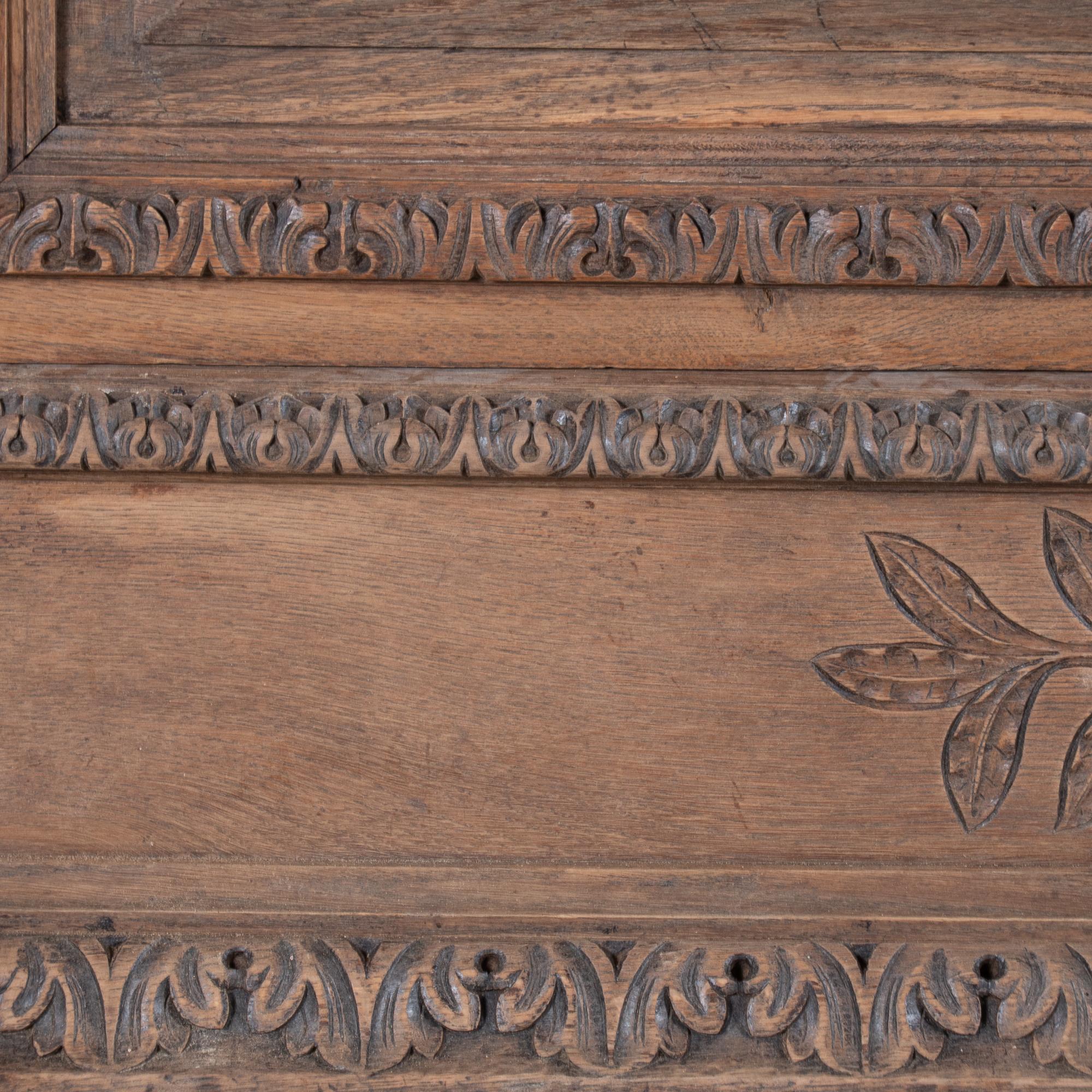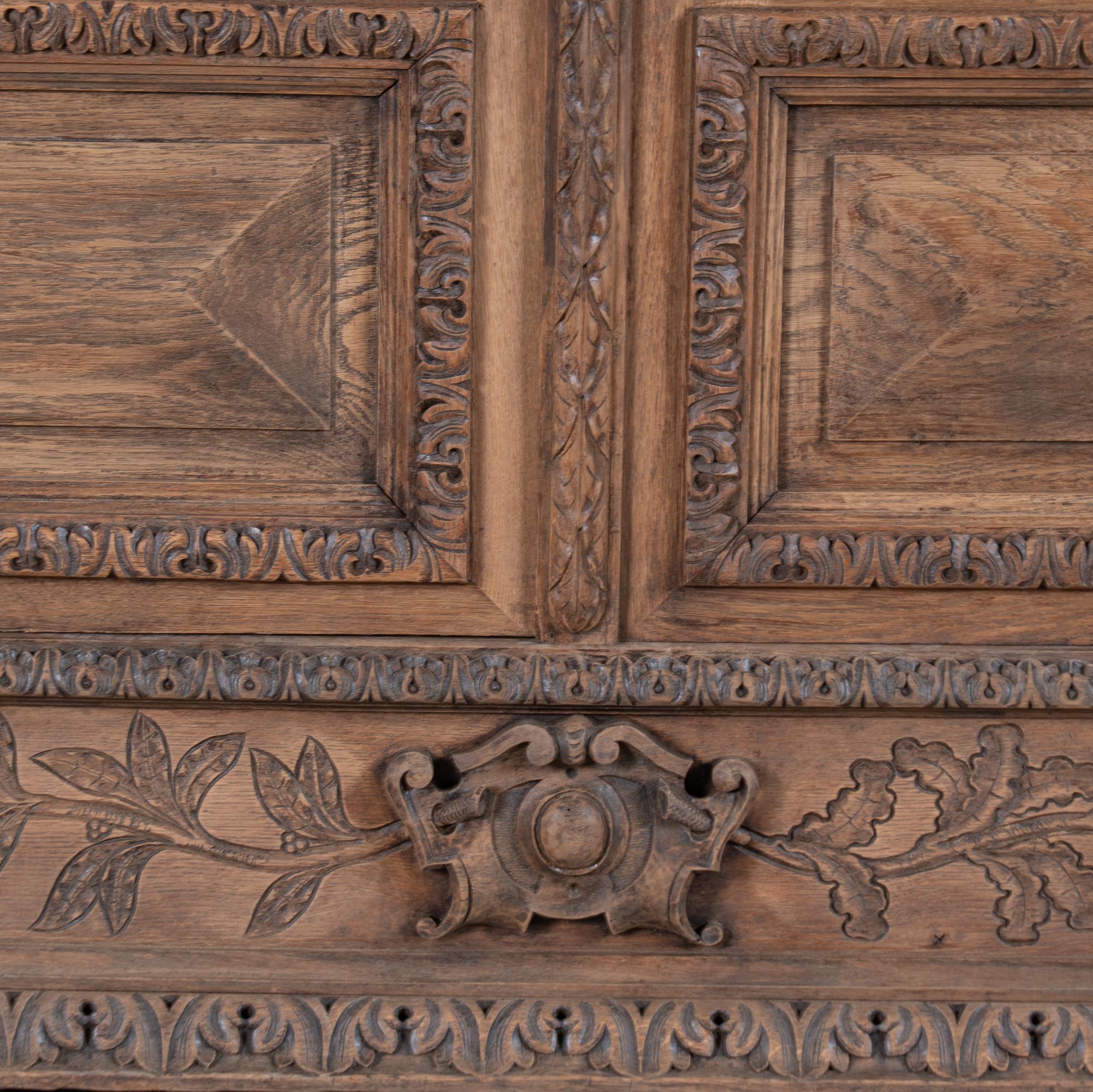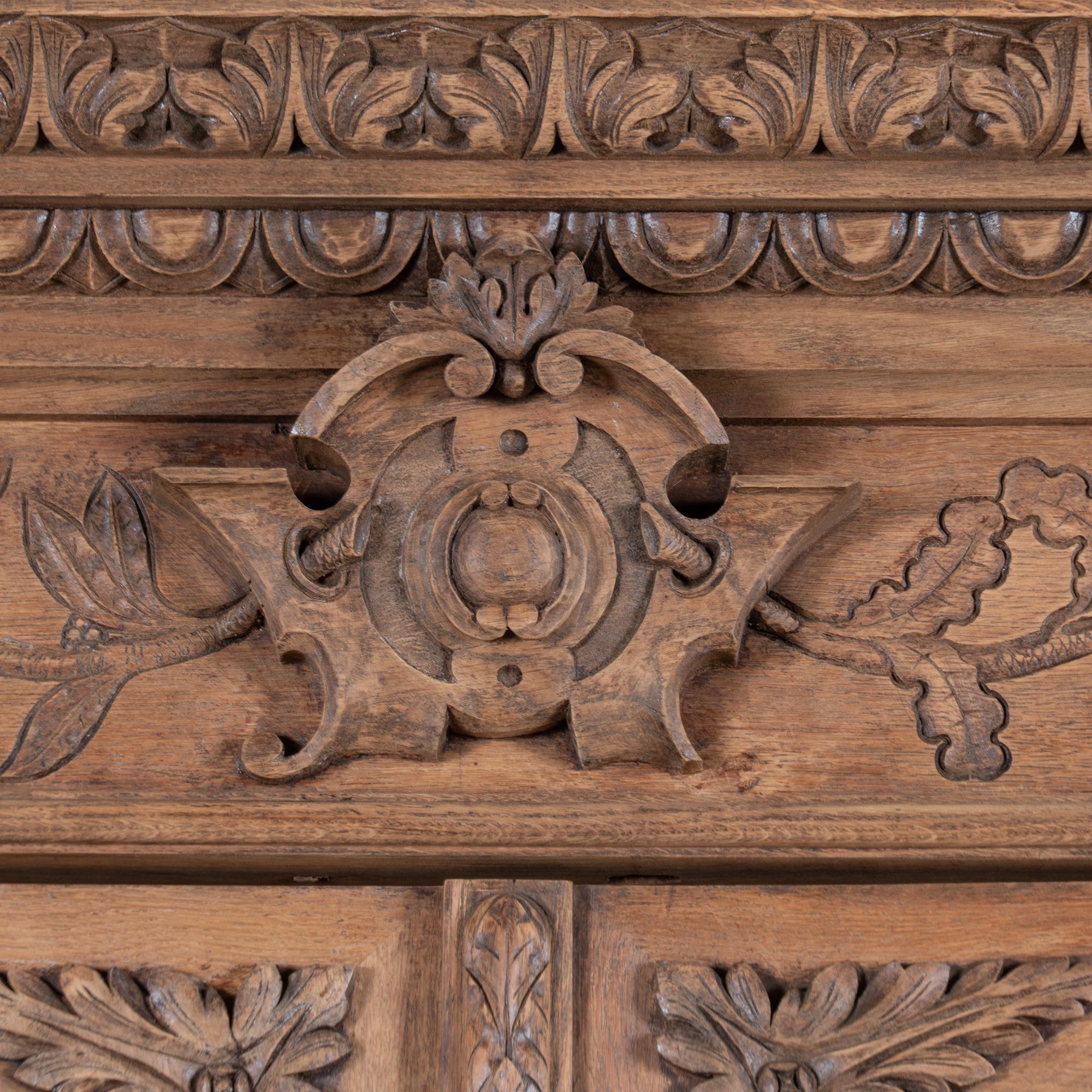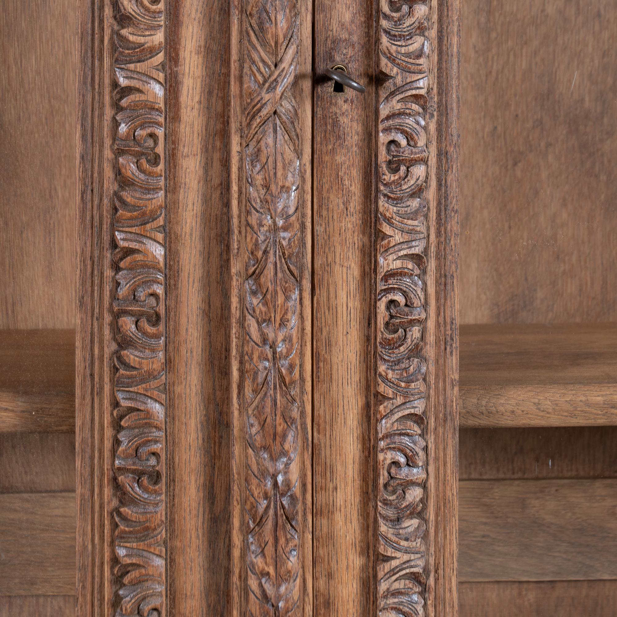 19th-century large French bookcase crafted in bleached French oak. This impressive display cabinet features extensive hand-carved detail throughout, including vine and acanthus-style motifs, a carved shield or medallion centered at the upper crown, and dramatic barley twist columns flanking both sides. Four arched glass panel doors allow for expansive display, with traditional adjustable shelving inside to accommodate books or collections. The cabinet is massive in scale and was originally constructed in multiple sections, including sides, back, doors, crown, and base, allowing for easier transportation and installation. Raised on large front bun feet, the crown and overall silhouette are bold and architectural. Traditional long French interior locks no longer function smoothly; keys are best used as pulls only. Typical age-related separation at joints and corners is present, along with scratches, nicks, cracks, and minor evidence of old wormhole activity along the sides and back, all consistent with age. The cabinet has been restored, is strong, stable, and ready for use as a dramatic display piece.