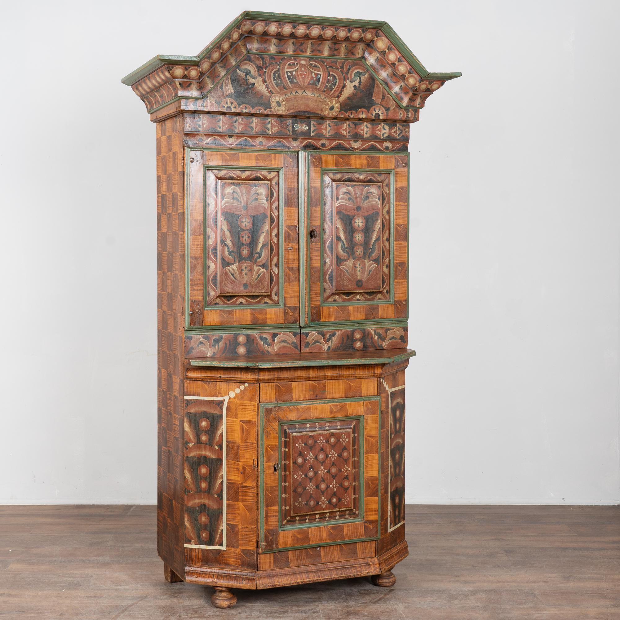 Original hand-painted Swedish Dalarna cabinet dated 1797, crafted from pine and retaining its authentic folk art finish. The exterior features traditional Dalarna rosemaling painting executed in earth tones, with a classic Swedish bonnet with hand painted crown and dated 1797. The cabinet is arranged with two upper doors over a single lower cabinet door. Upper cabinet doors open to reveal 2 traditional interior drawers that are accessible only when the doors are open, along with divided shelving and an upper half shelf which is notched, originally intended for the display of family silver spoons. The upper original lock and key remain in place and function stiffly. The lower cabinet lock no longer functions; the key is used as a pull only, and a newer snap closure secures the bottom door. Typical age-related separation is visible along corners, particularly at the crown and base. Distress to the painted surface, cracks along the sides, scratches, and nicks are present throughout and are consistent with an item over 200 years old. The cabinet has been restored, is strong, stable, and ready for use.