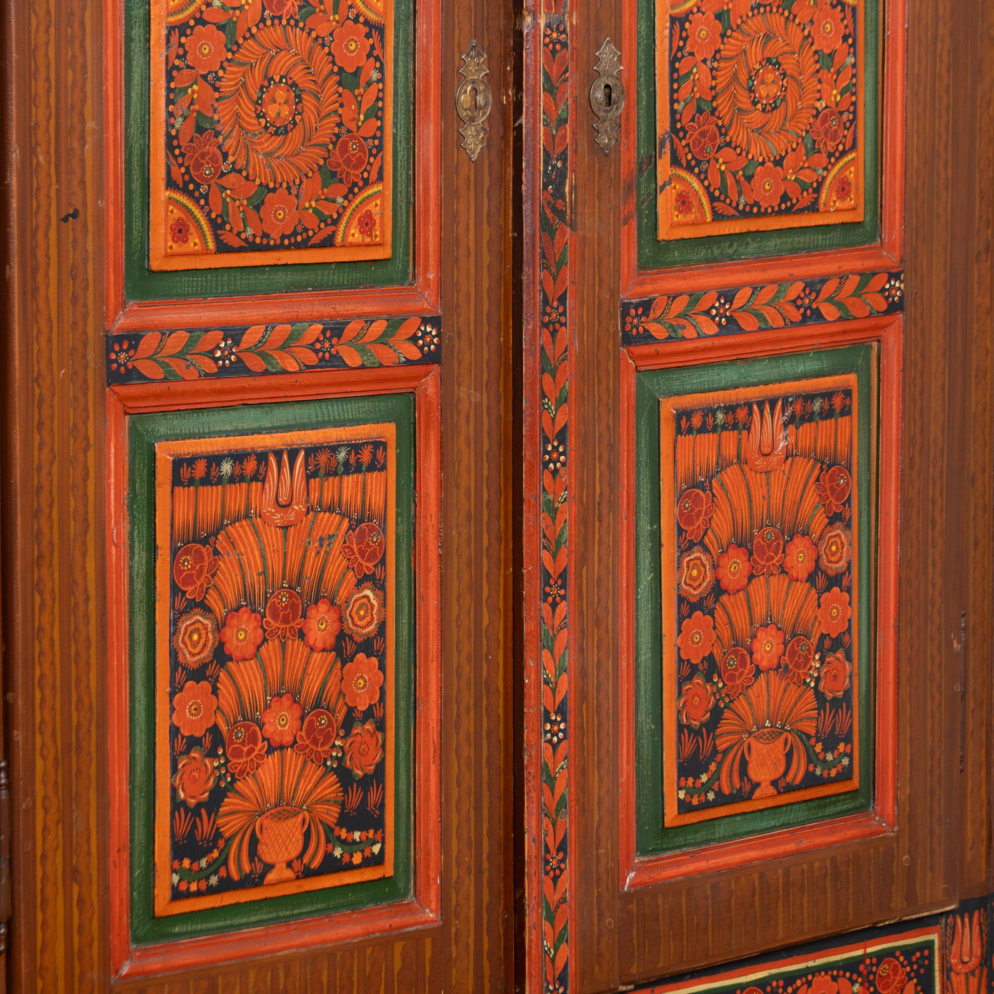 19th-century Hungarian pine armoire featuring its original hand-painted finish in vibrant tones of red, dark blue, yellow, and green throughout. Painted dental molding accents the crown, while carved and painted floral medallions decorate the upper section. The canted sides are fully painted, and the two front doors feature six painted panels in traditional Eastern European folk art style.