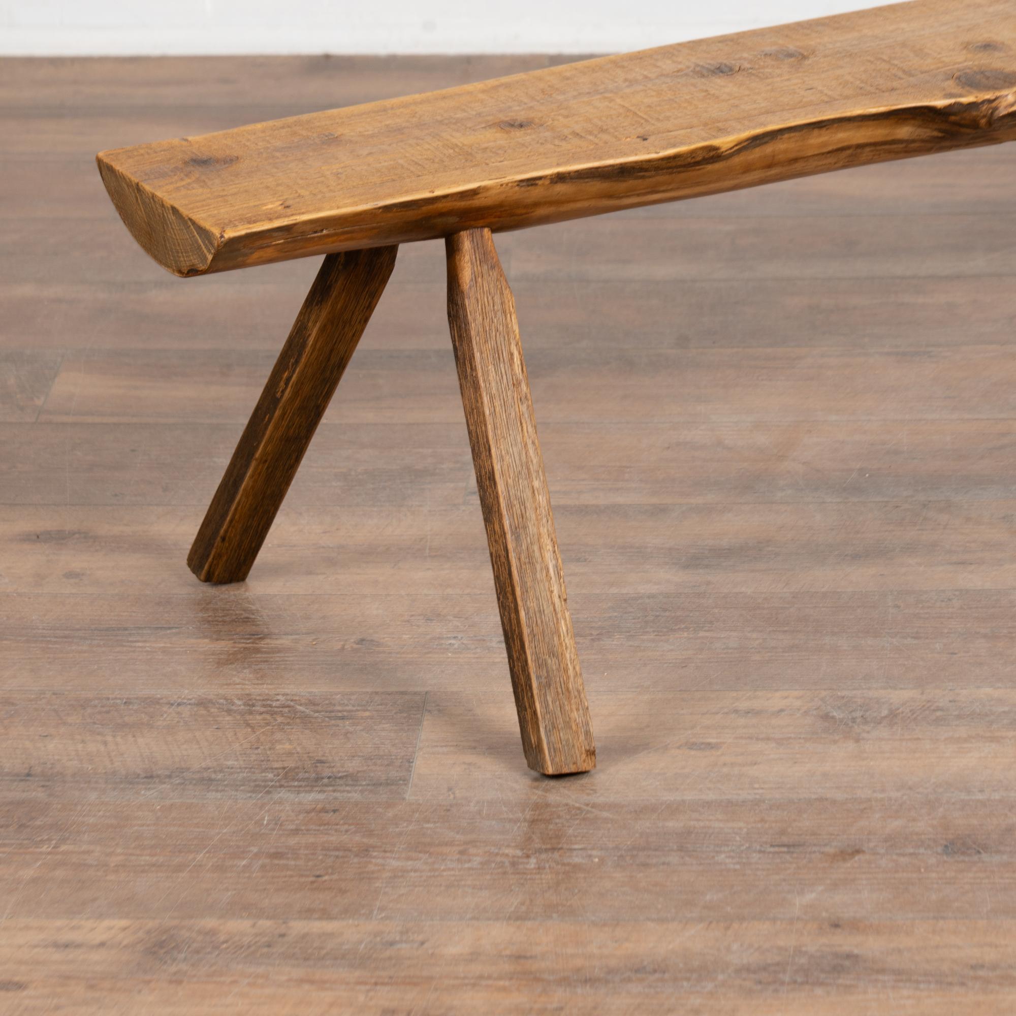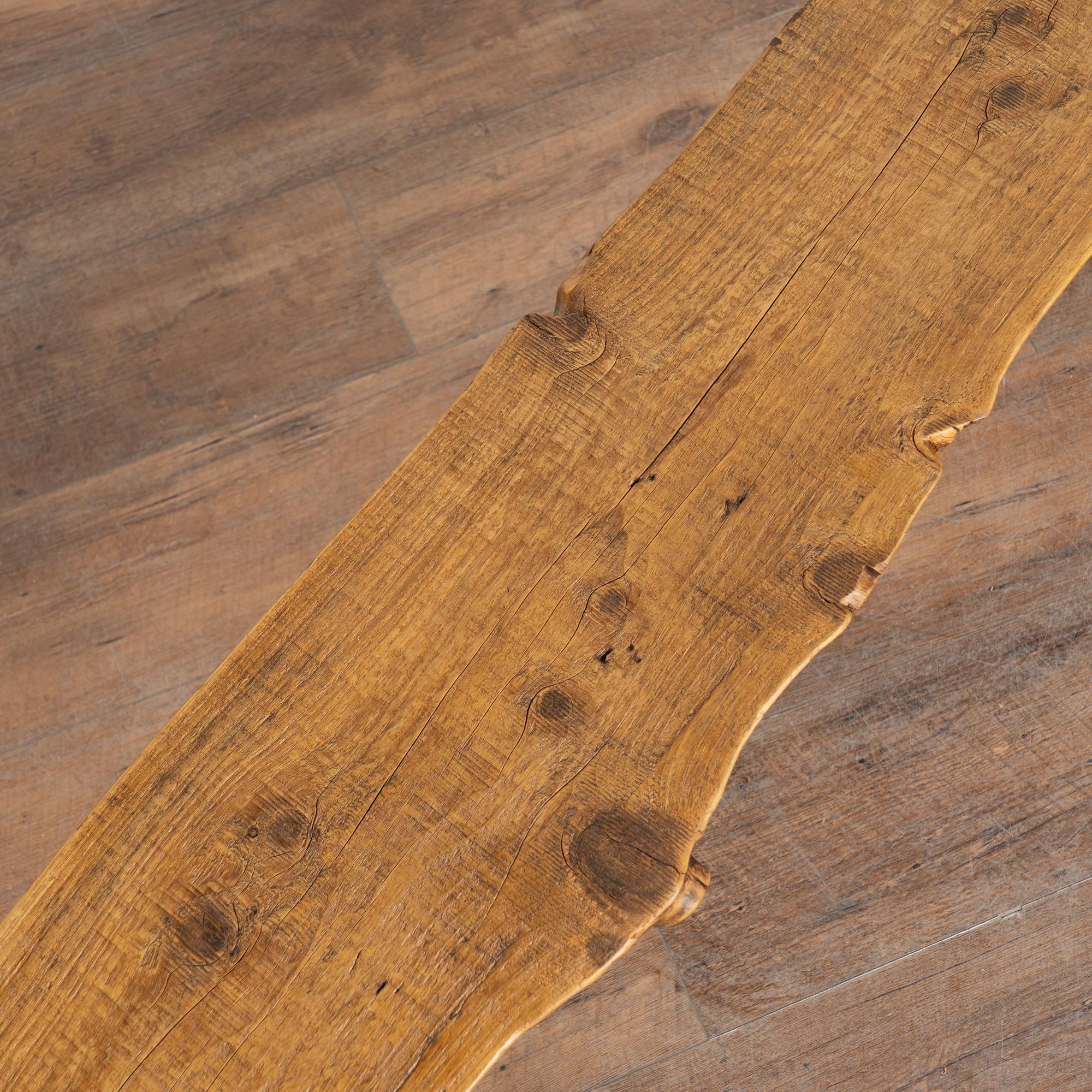 The top reveals old knots and surface cracks typical of aged pine, while the uneven edges follow the organic flow of the original wood. The overall appearance is rustic and natural. While the seat averages approximately 9 inches deep, the splayed display legs extend the overall depth to approximately 18 1/2 inches. The bench has been restored, is strong and stable, and suitable for seating or display.