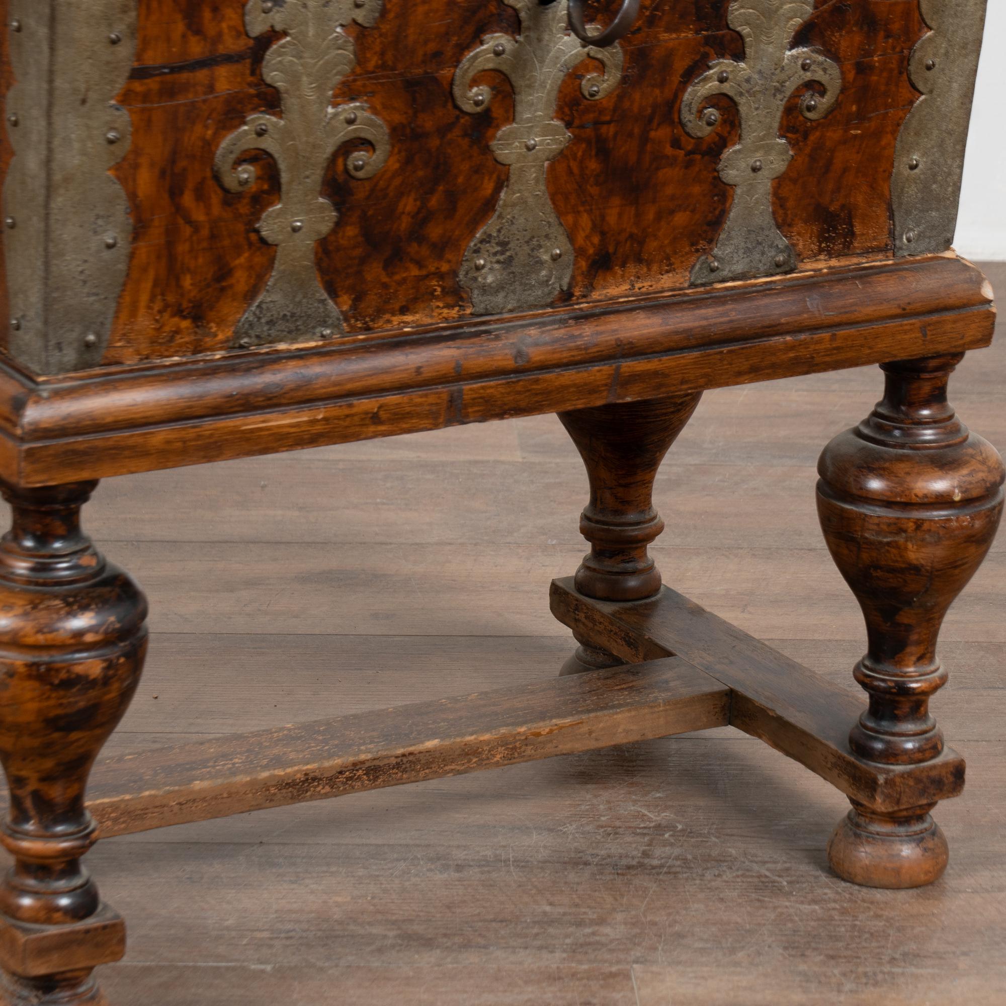 Early 19th-century Swedish trunk or lockbox crafted in pine and raised on turned legs with a stretcher base, creating a distinctive and functional side table. The trunk retains its original faux wood painted finish, adding depth and character to the piece.