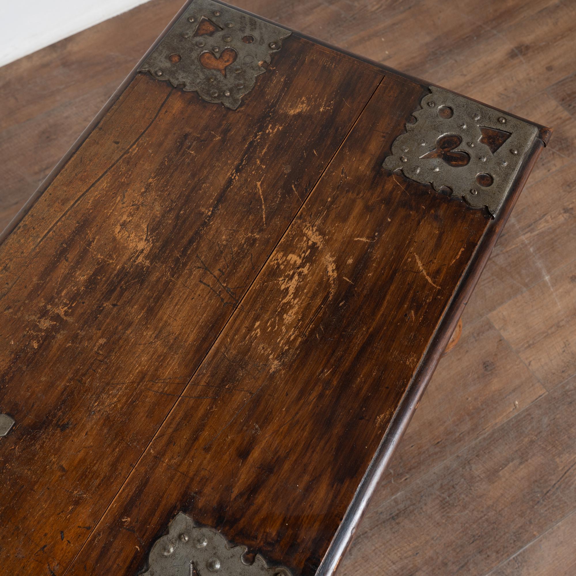 Heavy decorative metal corners, side handles, and iron accents reinforce its original purpose as a secure lockbox intended to protect household valuables and important papers. The original key is included for display; however, the lock is no longer present.