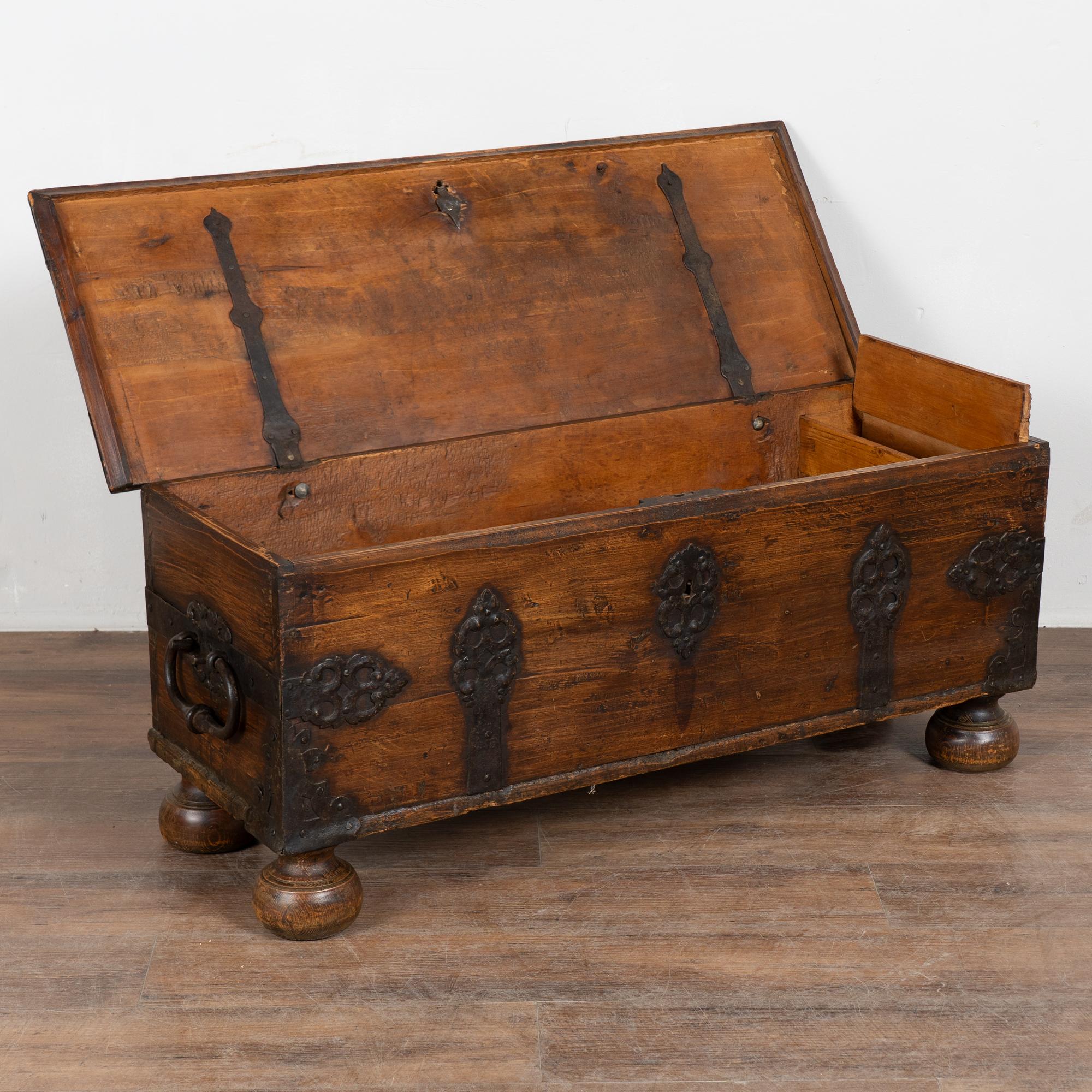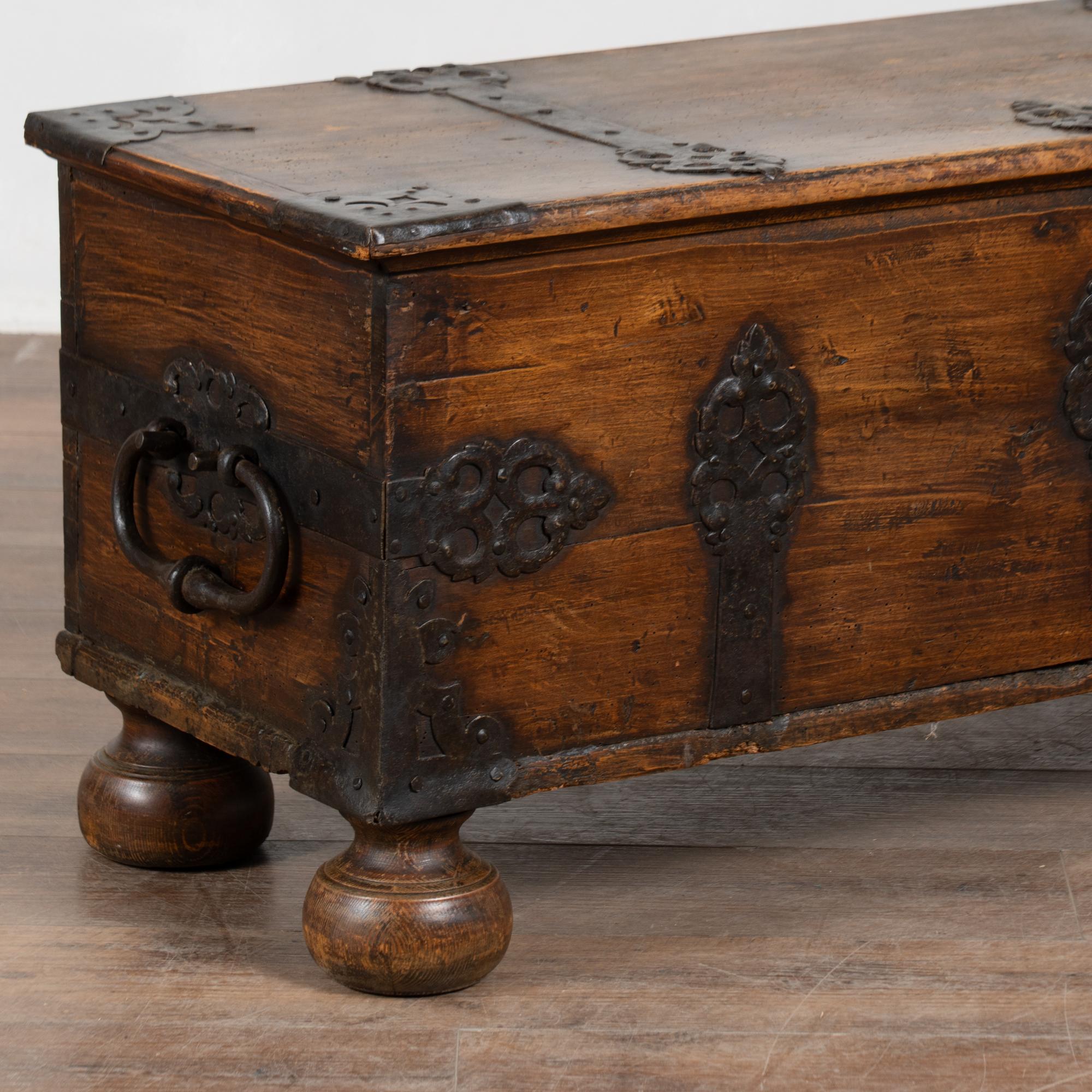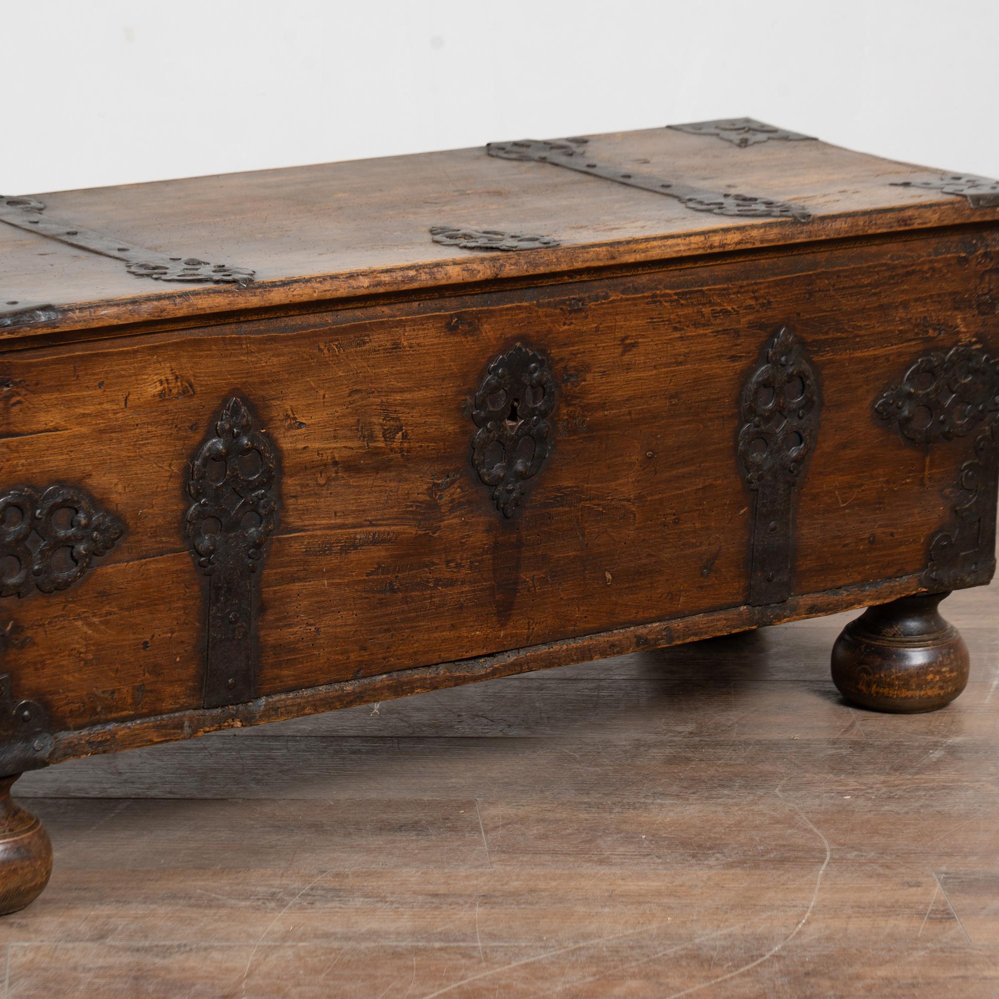The age of this trunk is revealed in the deep, dark patina of the aged pine. The heavy chest rests on four large bun feet. Typical age related cracks, gouges, and distress are seen throughout commensurate with generations of use. Dried old wormhole activity is present throughout, in particular the interior bottom and back, but does not impact the strength or integrity of the trunk itself.