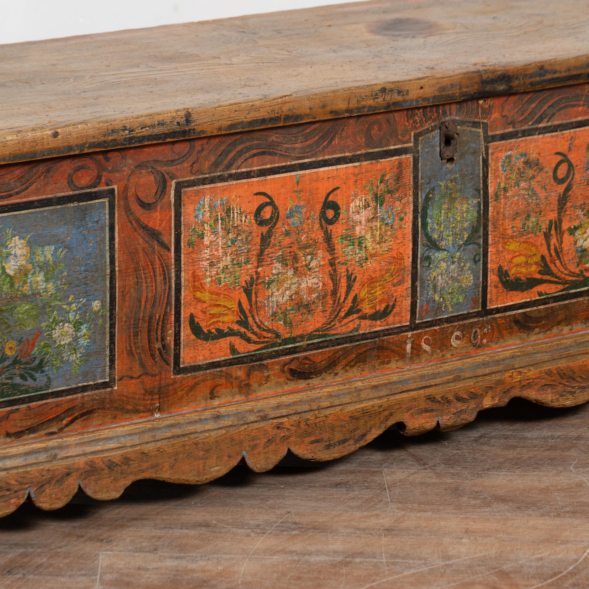 The painted finish is all original on this rustic pine flat top narrow trunk which may also serve as a bench. Flowers were a traditional embellishment as seen on the front of this handcrafted trunk with multi colored flowers contrasting against the blue and red-orange panel backgrounds. The deep patina of the pine top reflects generations of use, and much wear is seen along the top. The faux wood painted background was also a traditional style motif of the era.