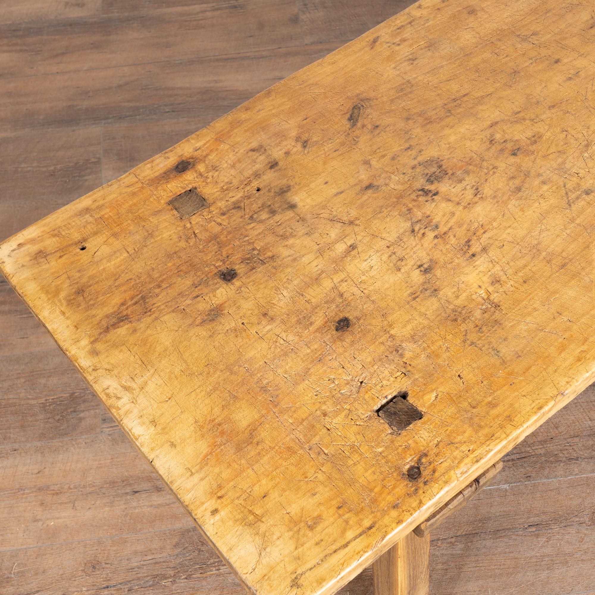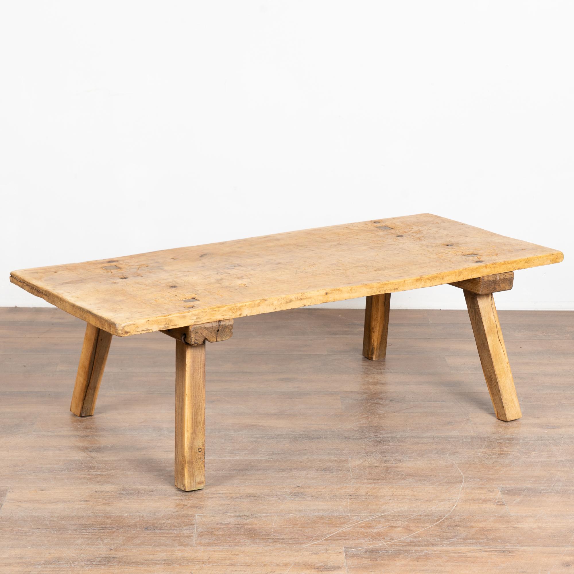 The appeal of this rustic coffee table comes from the thick wood of the top that originally served as a worktable, all resting firmly on square peg legs.