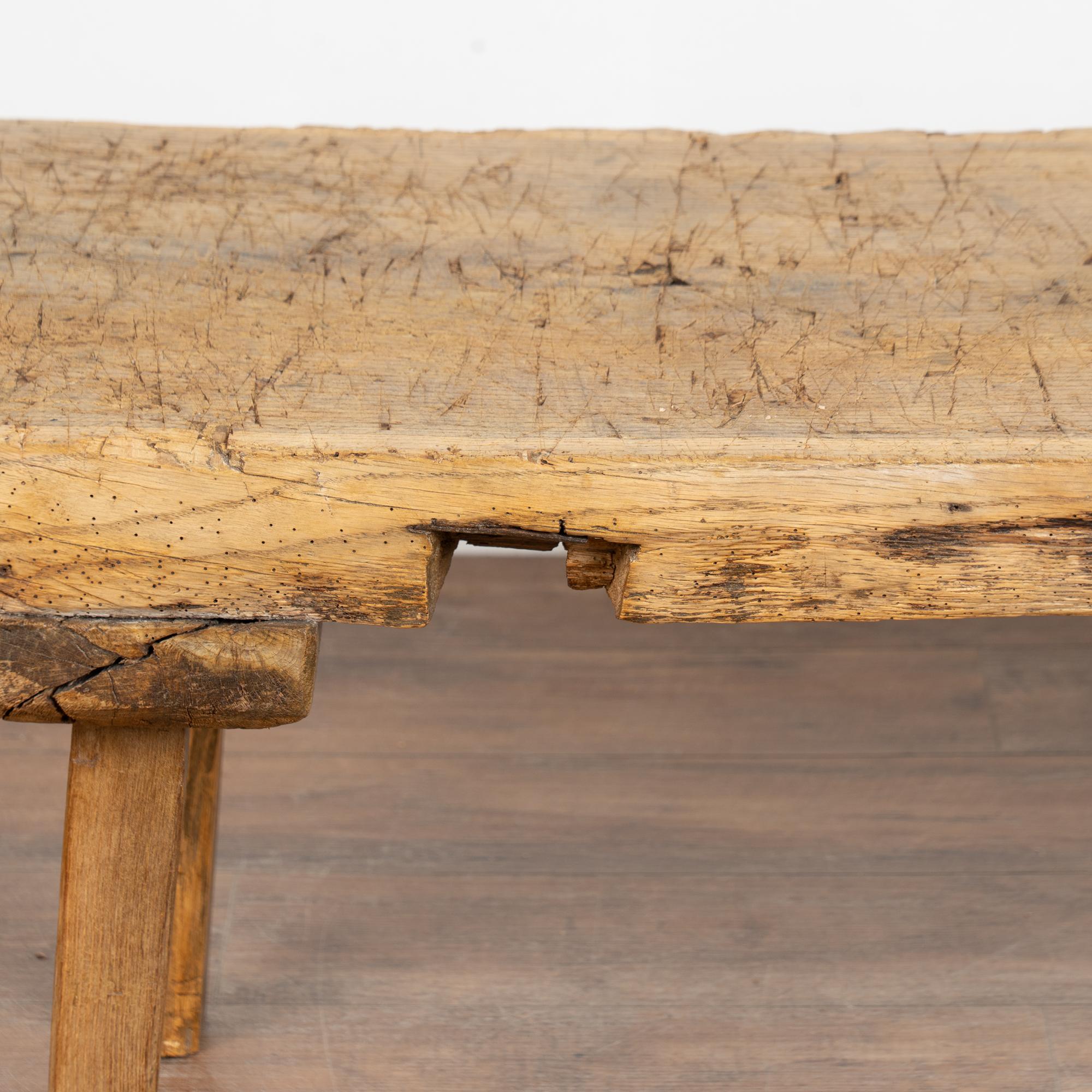 The slab of wood that serves as the top is impressive with all the gouges, stains, scrapes, cracks and even dried old wormholes that all combine to build the depth of character. Note along the edge there is a cut out section, likely where a tool was attached at an early point in its use.