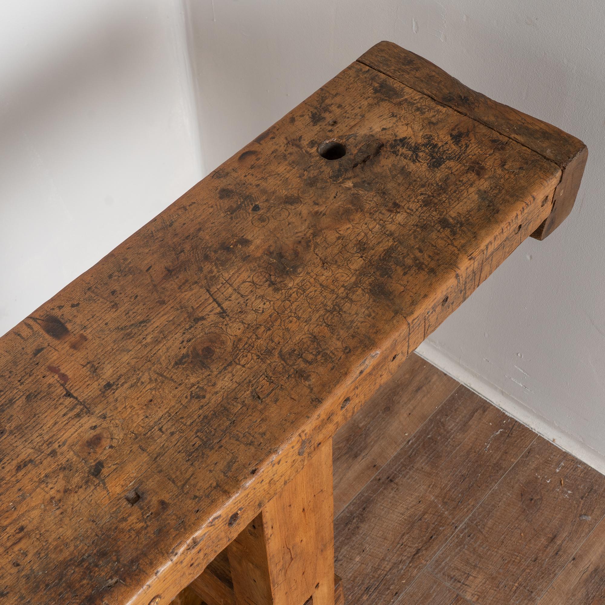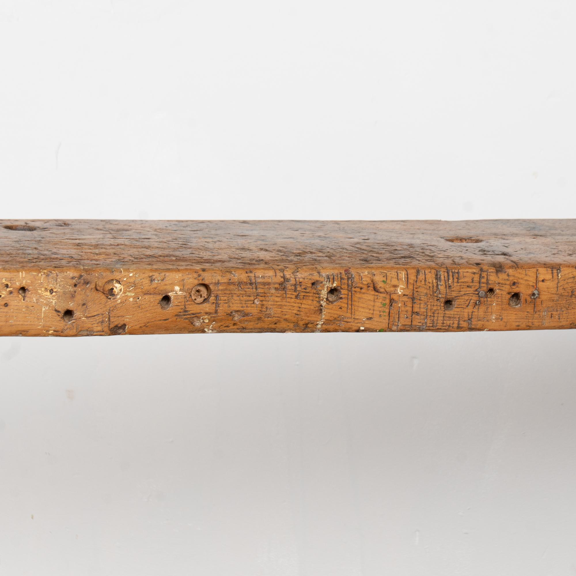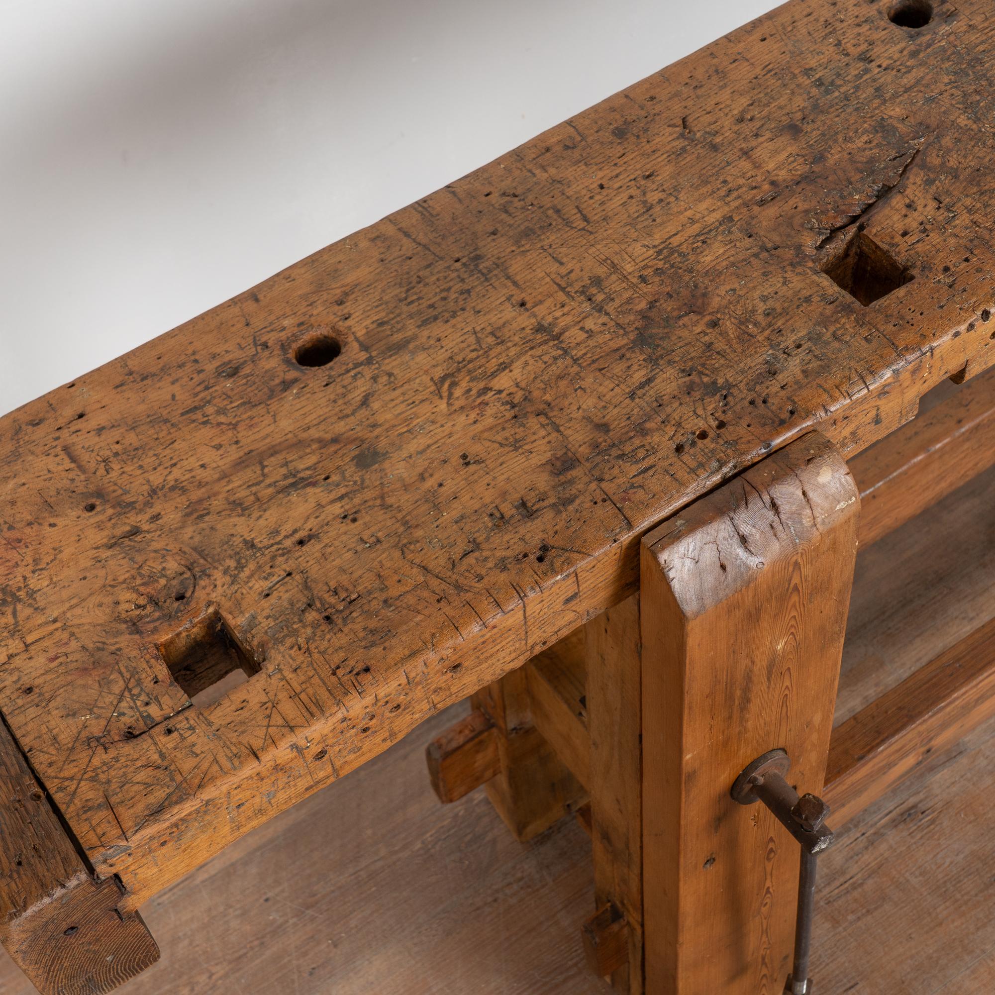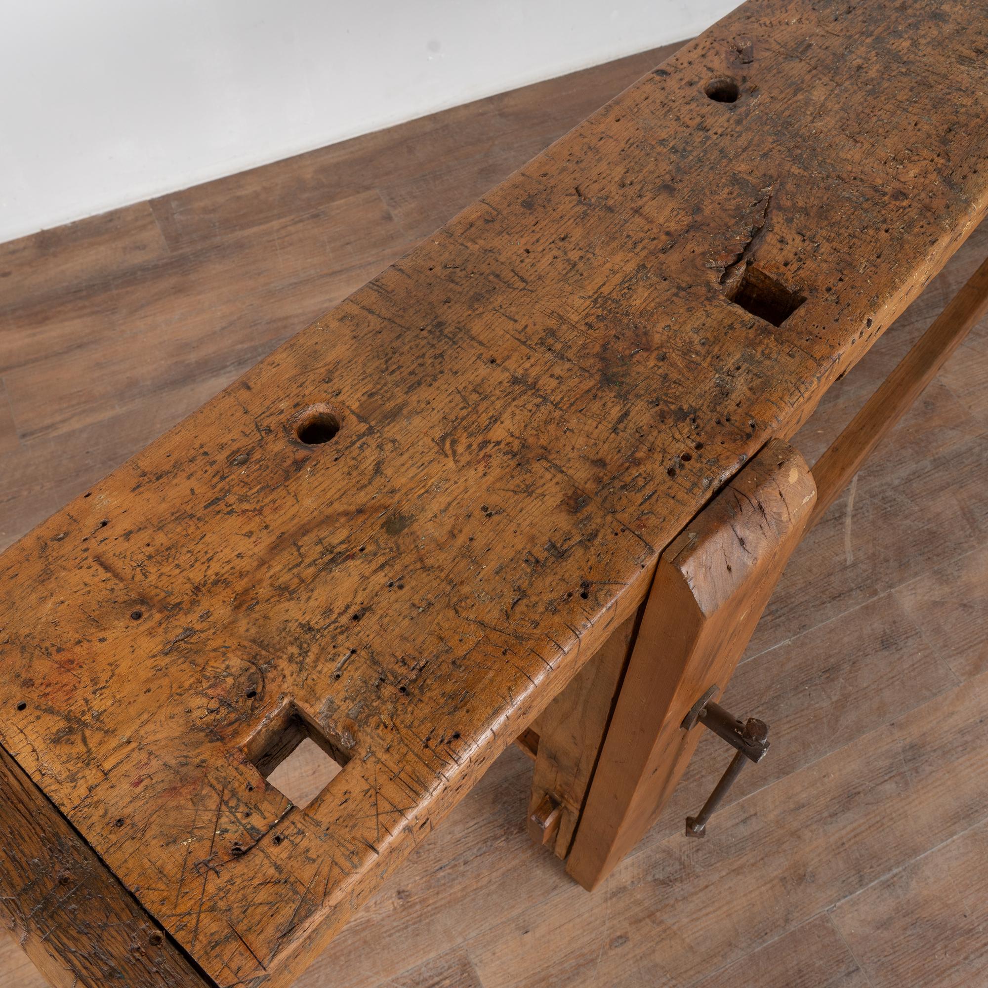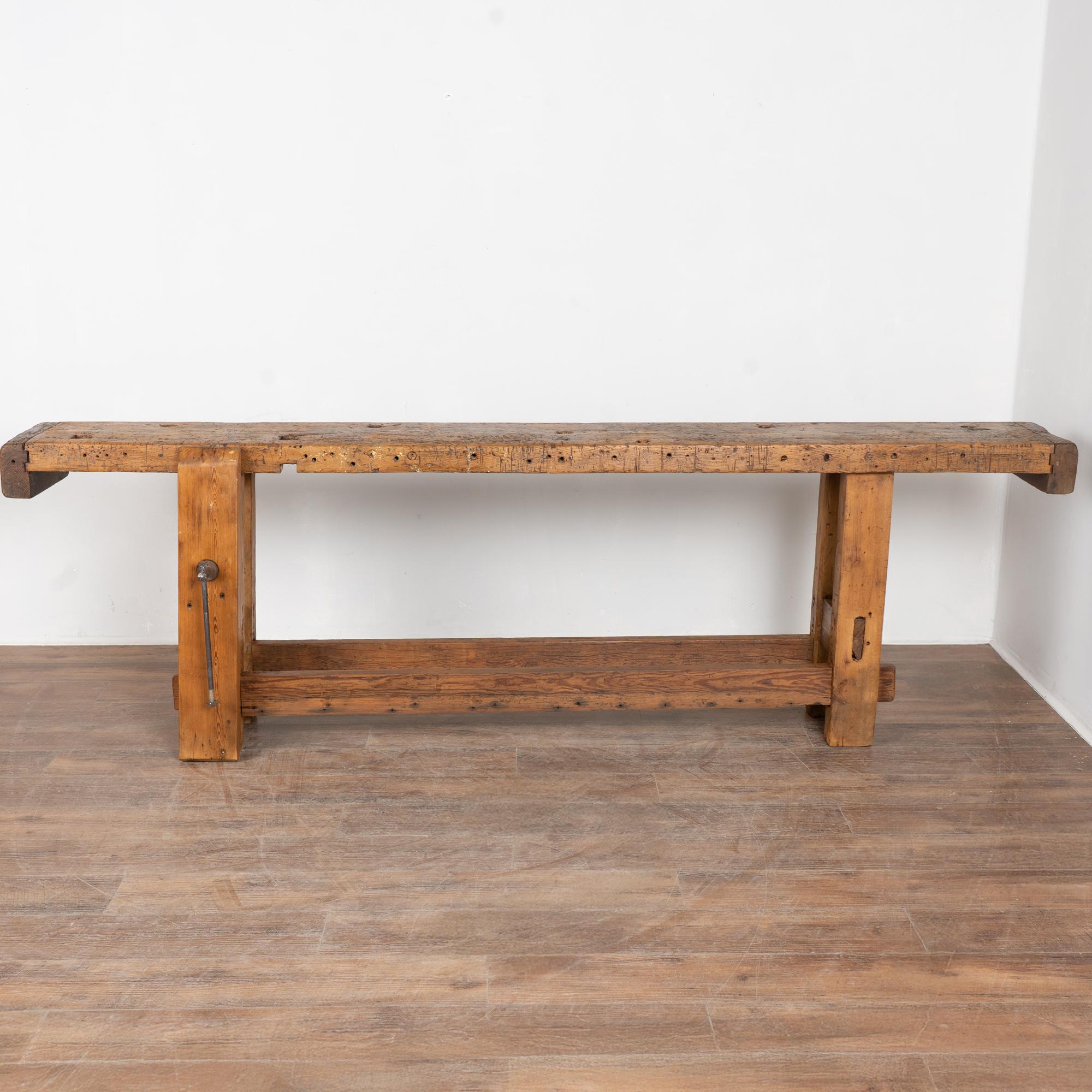 It is the years of constant use revealed in every ding, gouge, stain, and crack that enrich the character of this impressive 9' long carpenters' workbench from France. The highly distressed top captures ones attention. Please examine the close up photos to appreciate the aged patina, joints and old hardware. It has one long vice along the left leg which was a traditional structure. In the photo of the top, notice multiple holes and notches that served a purpose for the carpenter who originally used it, likely to attach other tools.