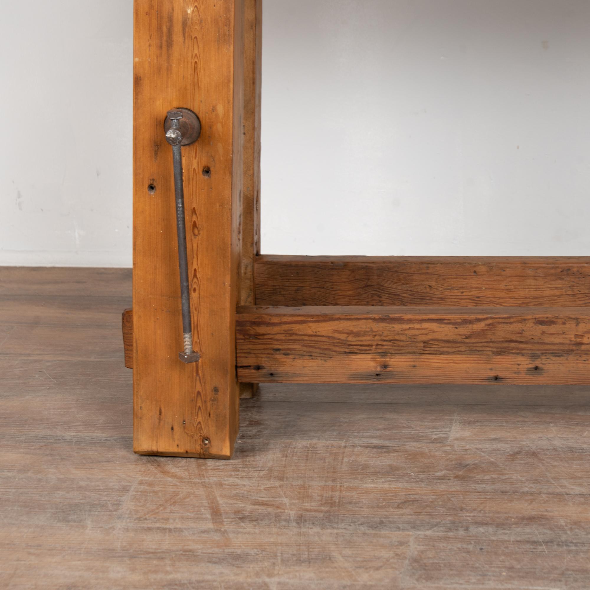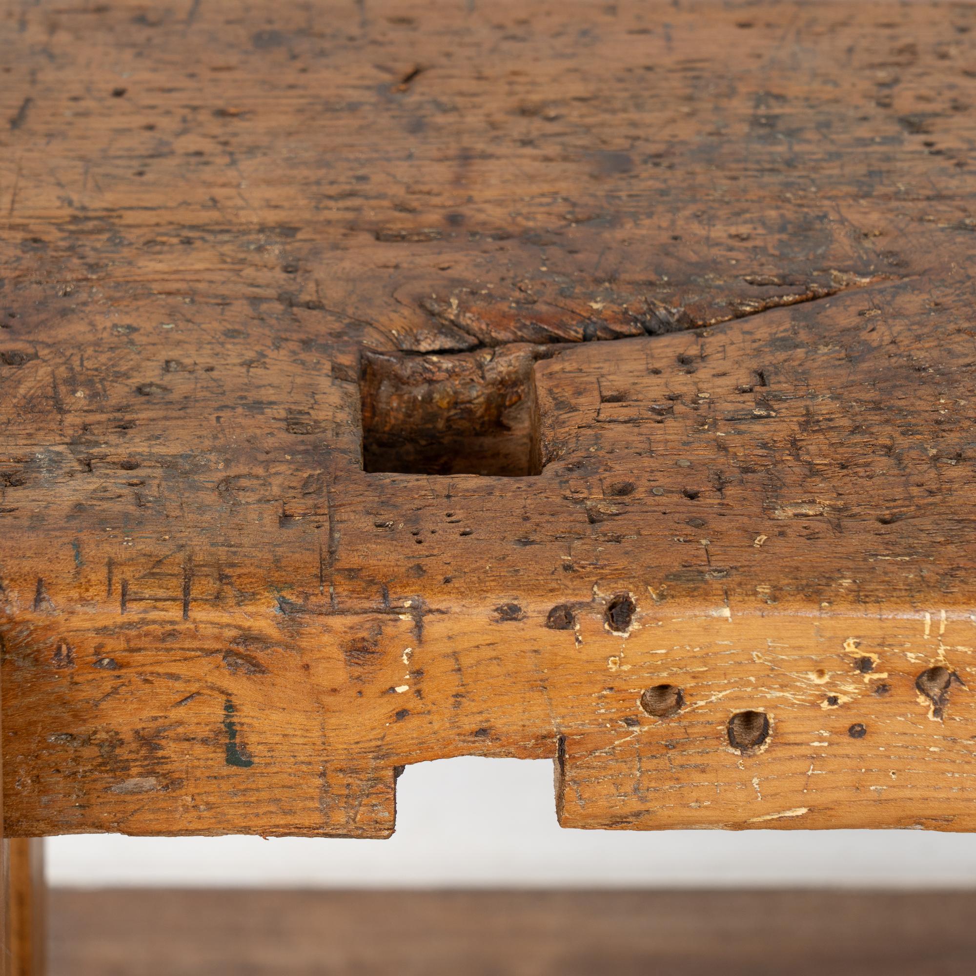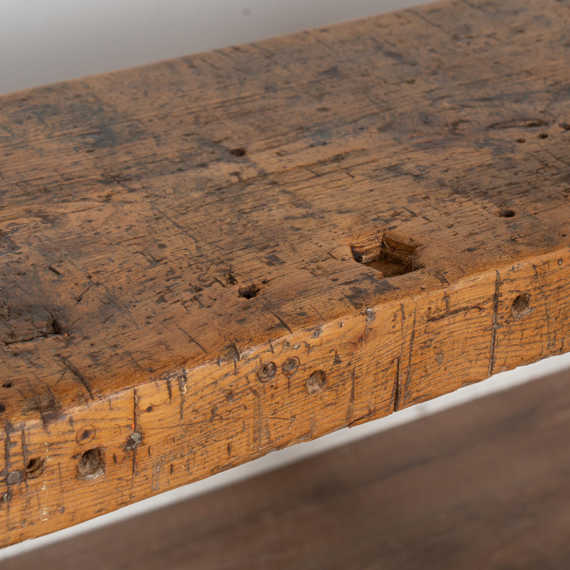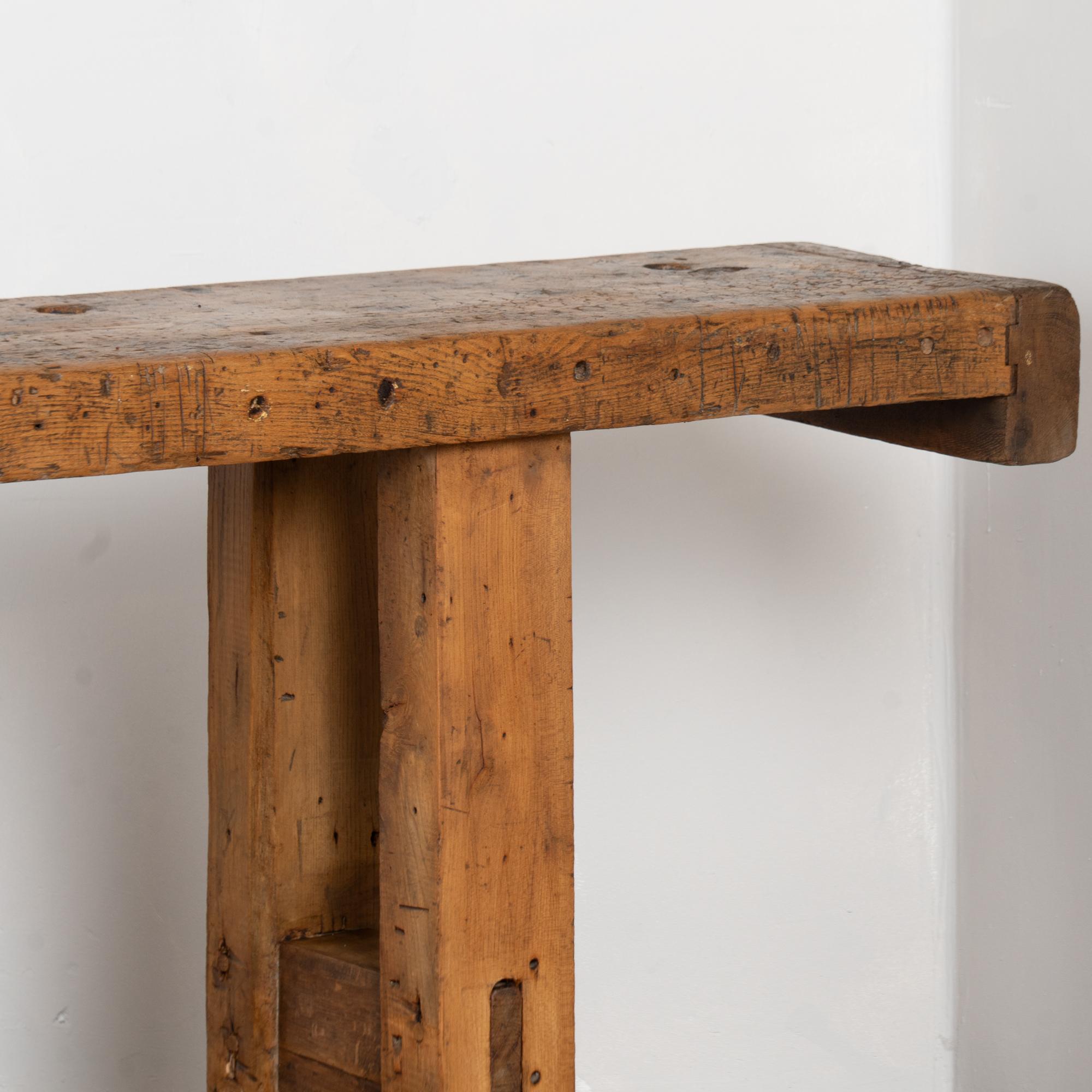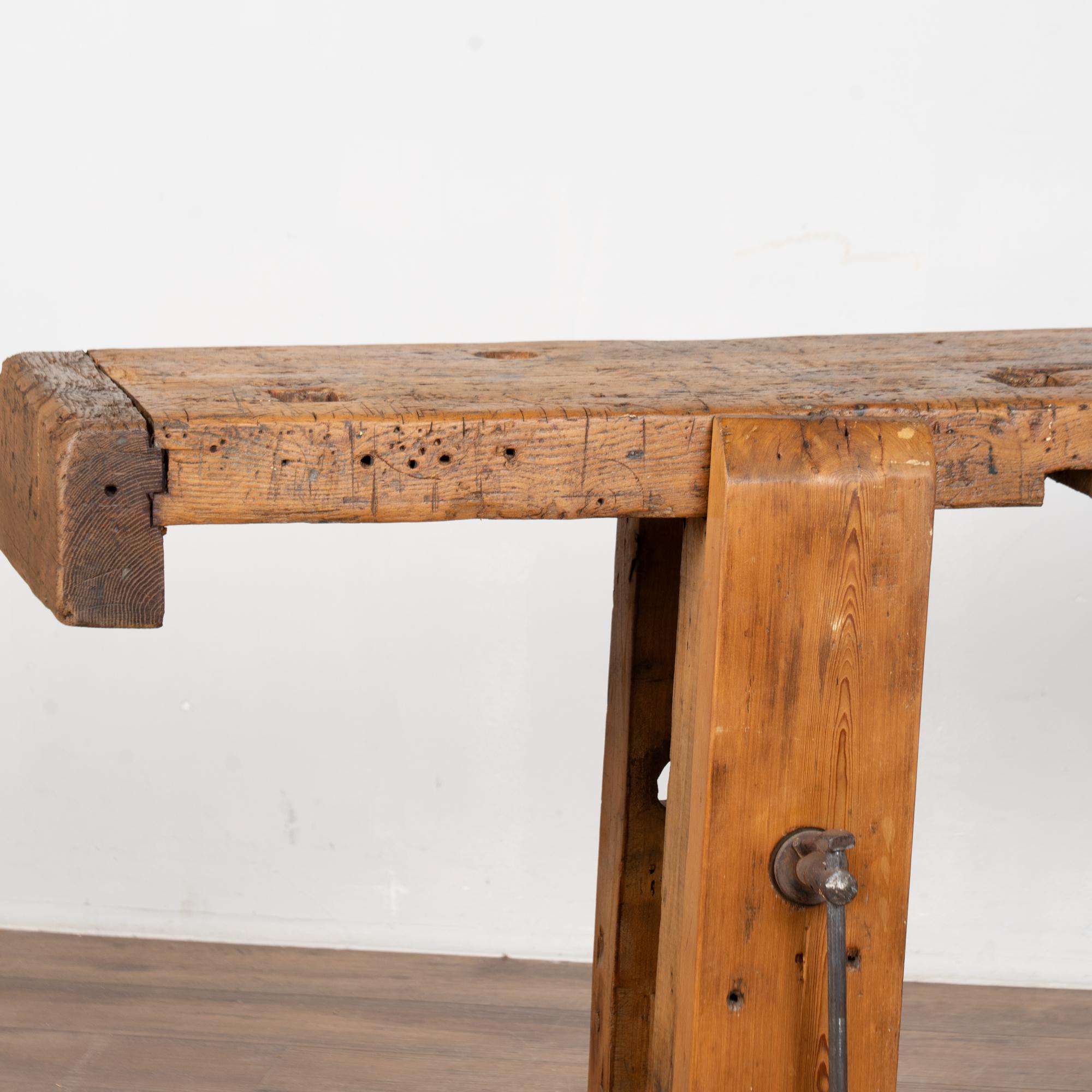 It is the years of constant use revealed in every ding, gouge, stain, and crack that enrich the character of this impressive 9' long carpenters' workbench from France. The highly distressed top captures ones attention. Please examine the close up photos to appreciate the aged patina, joints and old hardware. It has one long vice along the left leg which was a traditional structure. In the photo of the top, notice multiple holes and notches that served a purpose for the carpenter who originally used it, likely to attach other tools.