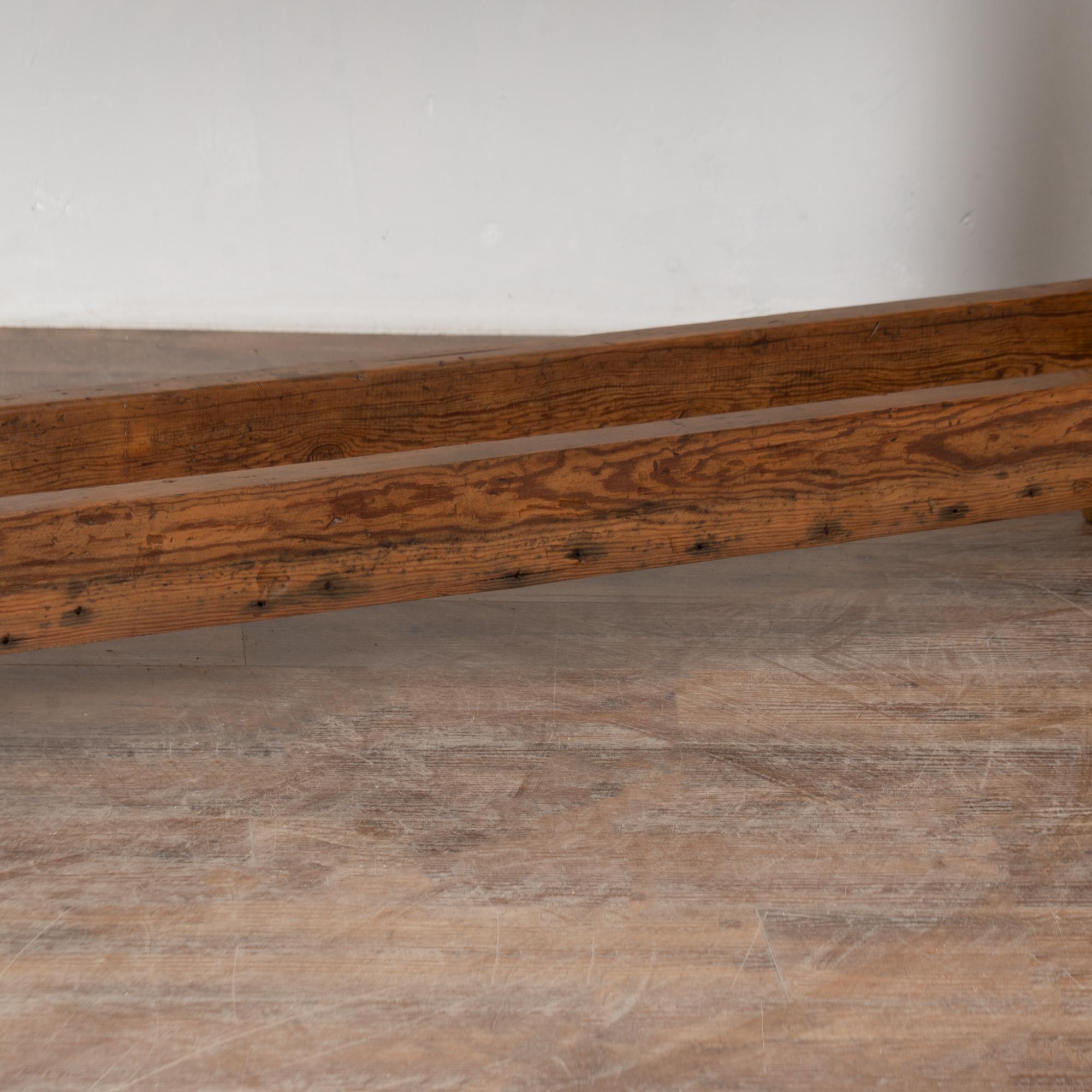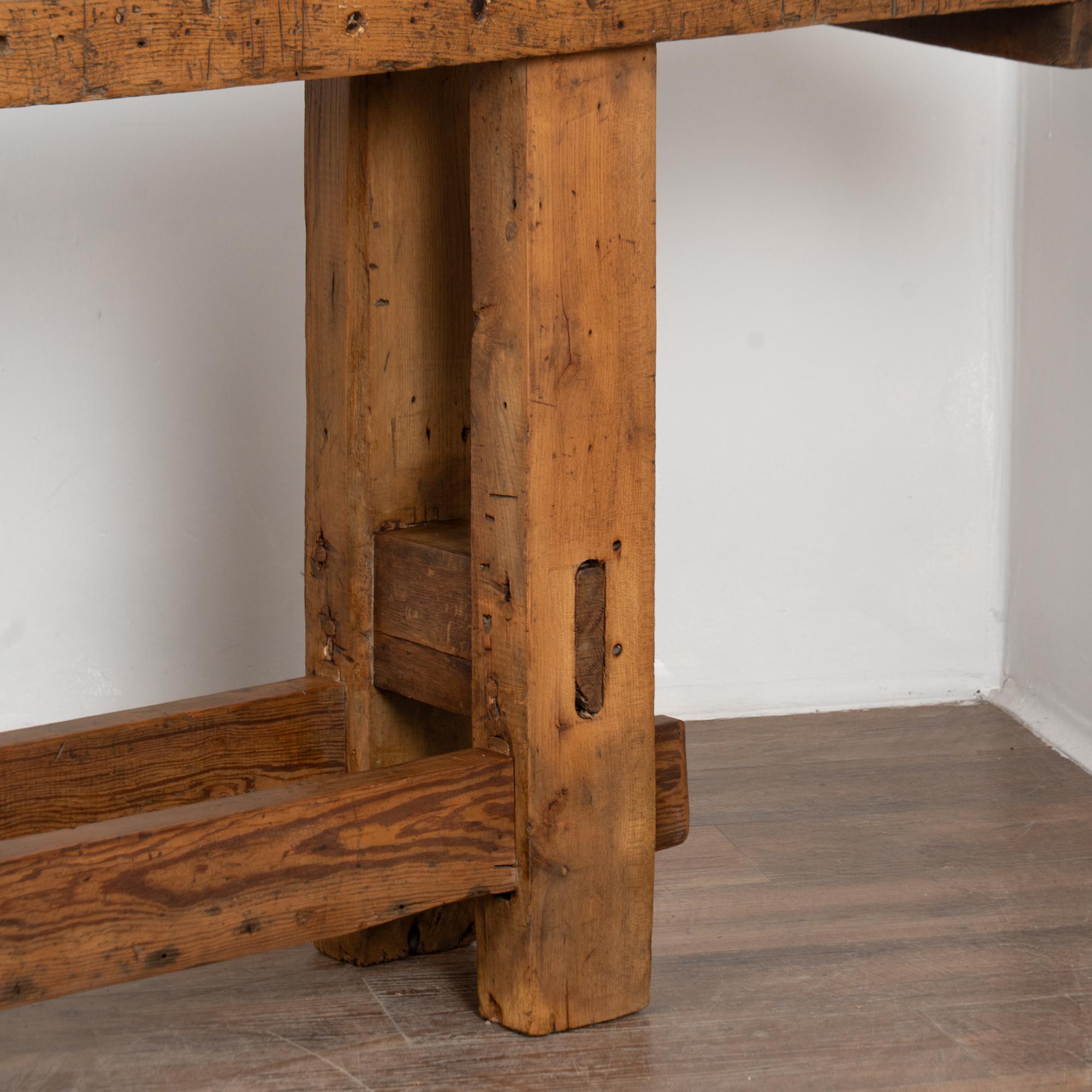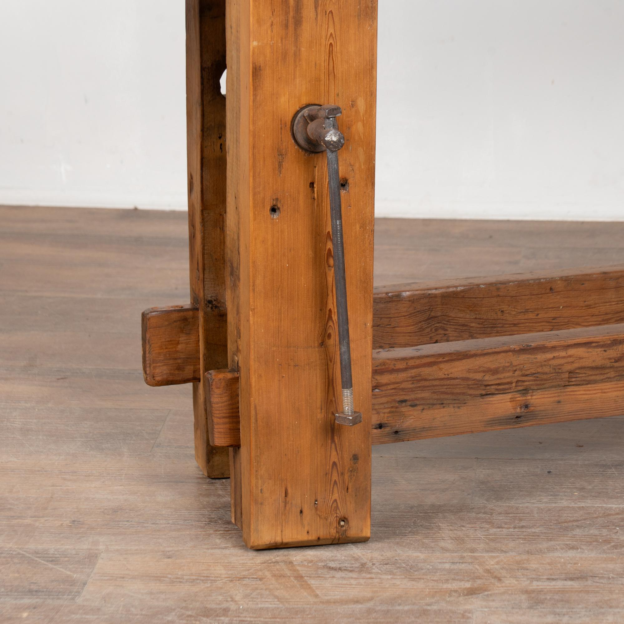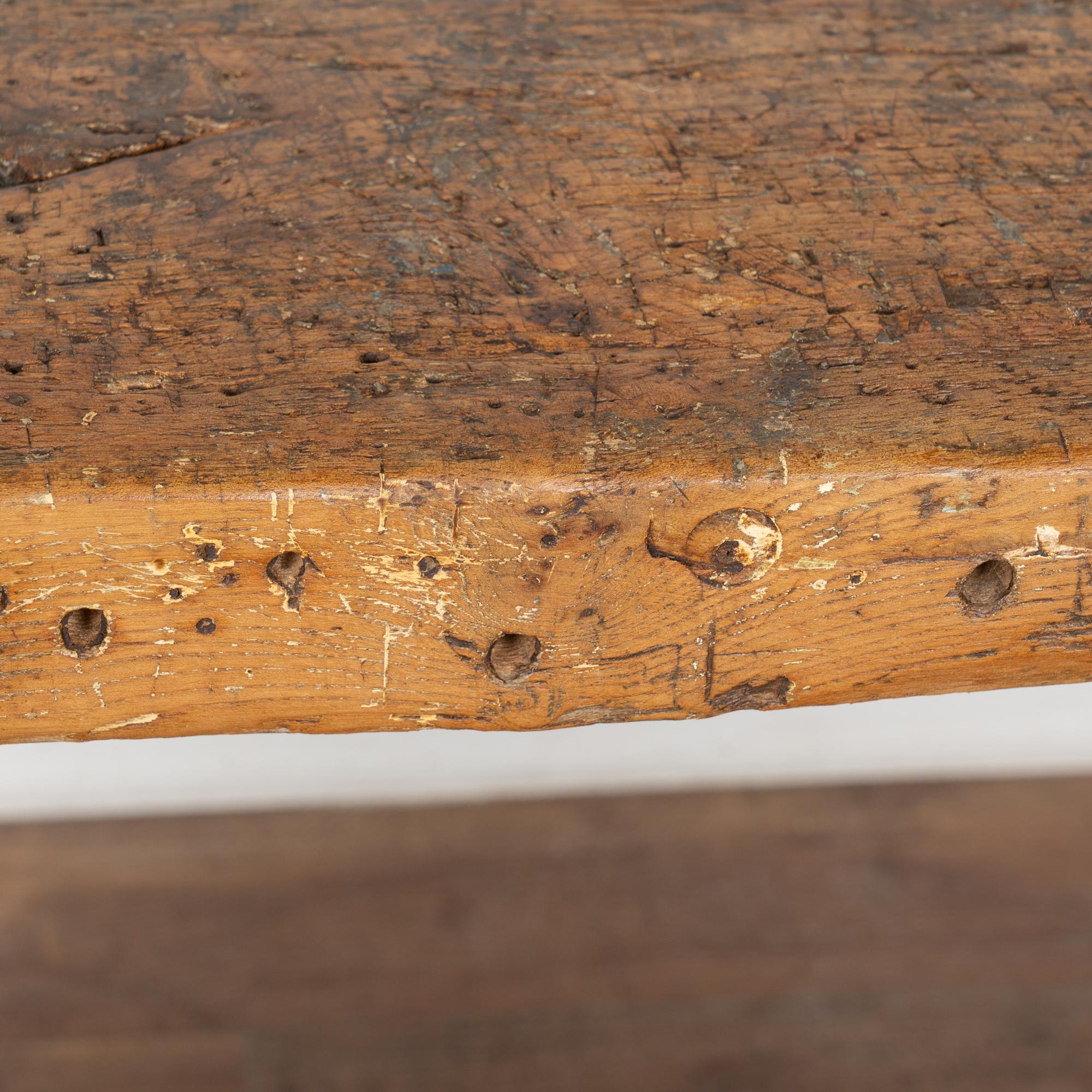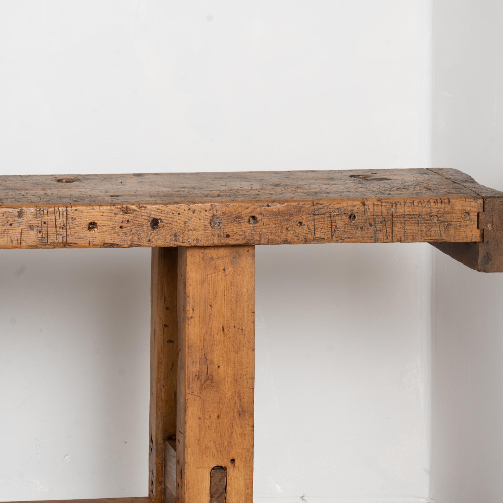 It is the years of constant use revealed in every ding, gouge, stain, and crack that enrich the character of this impressive 9' long carpenters' workbench from France. The highly distressed top captures ones attention. Please examine the close up photos to appreciate the aged patina, joints and old hardware. It has one long vice along the left leg which was a traditional structure. In the photo of the top, notice multiple holes and notches that served a purpose for the carpenter who originally used it, likely to attach other tools.