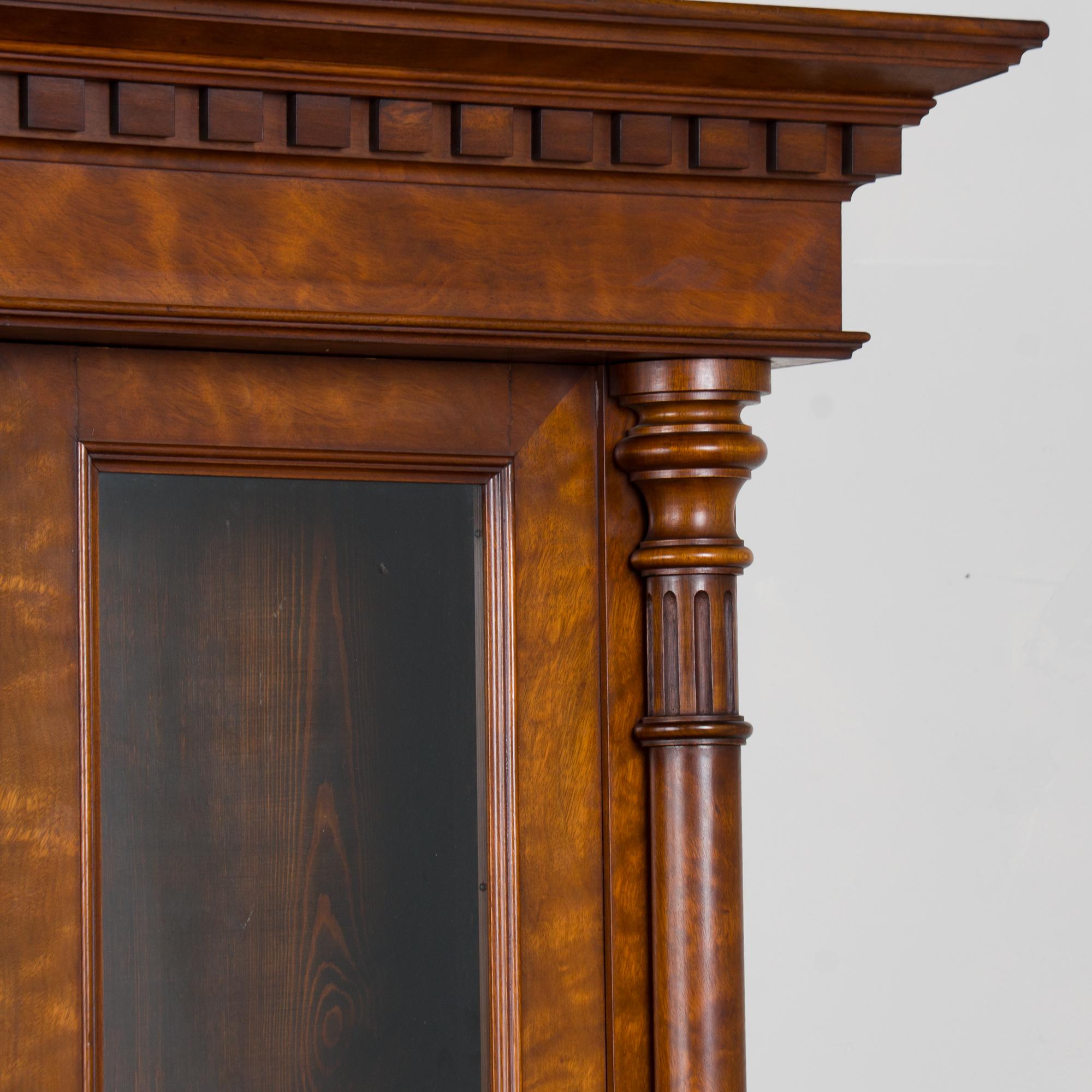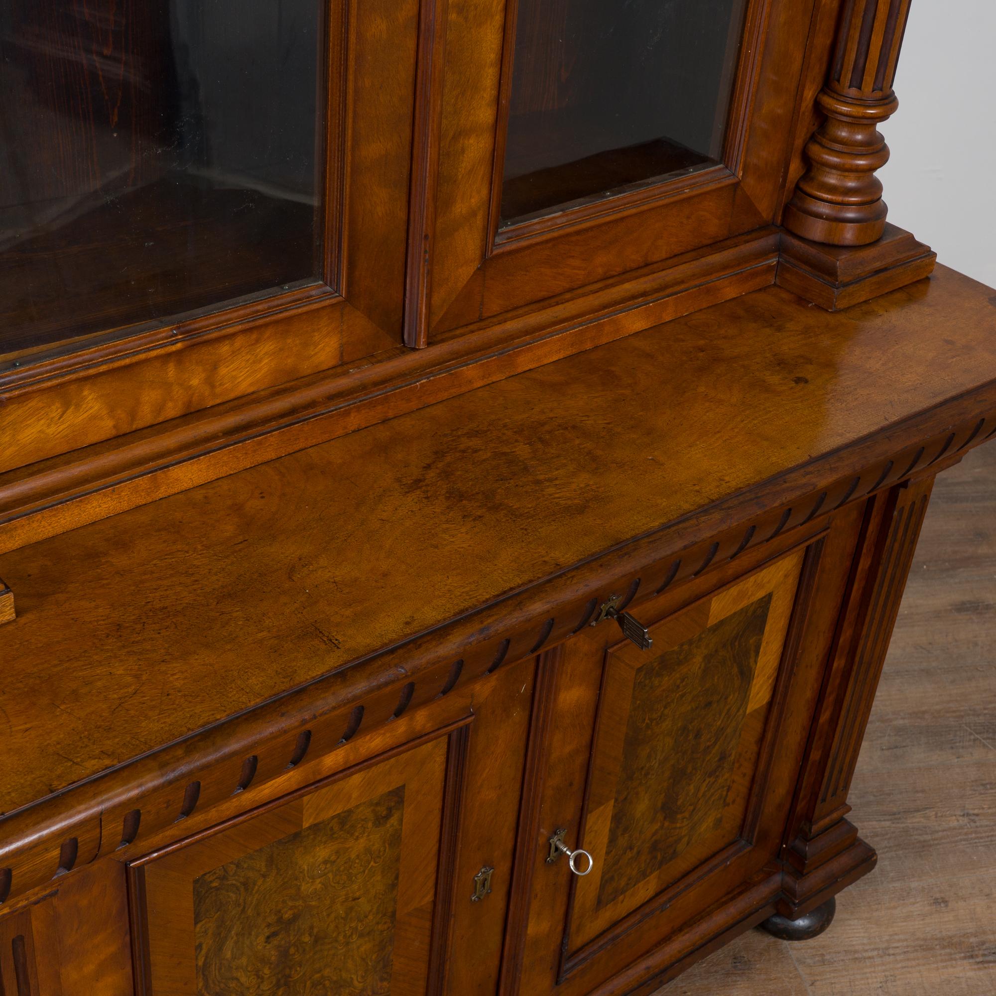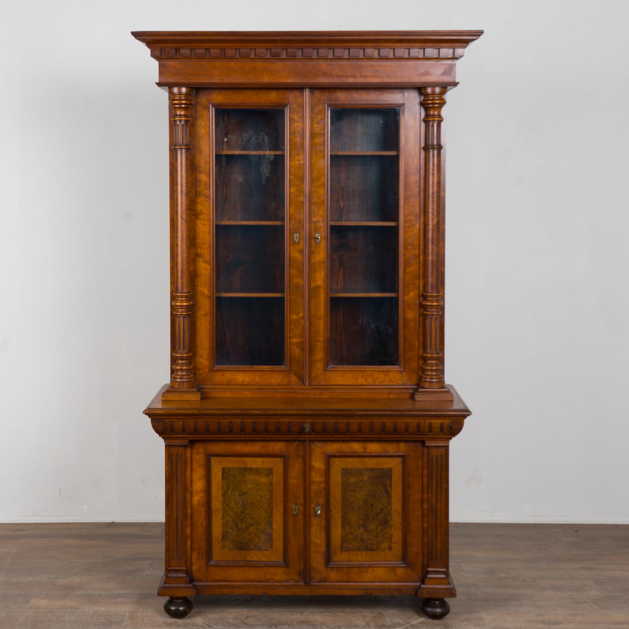 20th century Danish bookcase crafted in walnut. The upper cabinet features glass panes allowing display of books or any collection. Handsome turned columns flank the upper doors. The cabinet includes three adjustable shelves providing flexibility for display or storage. The lower cabinet doors feature burled wood veneer panels adding visual interest and contrast.